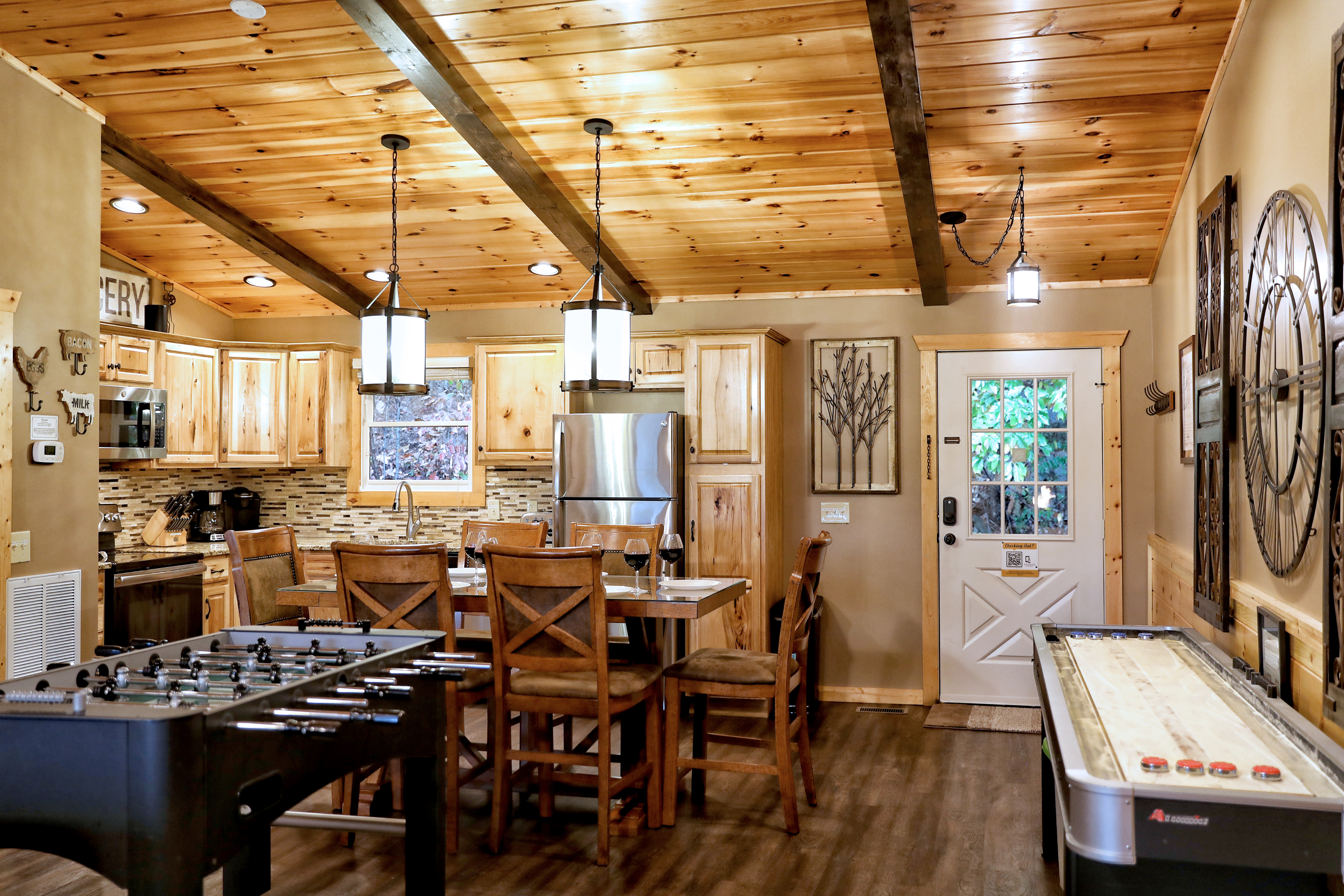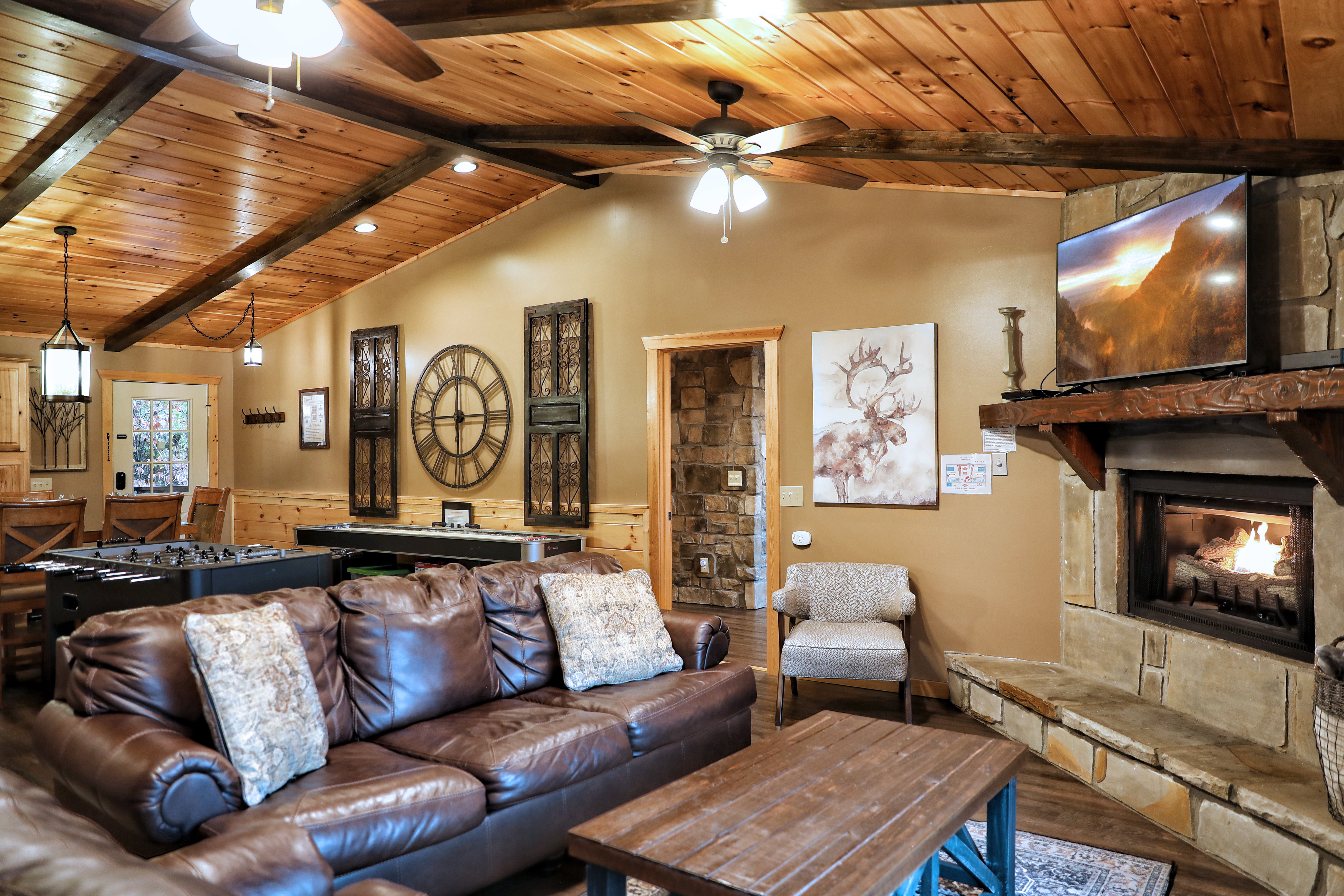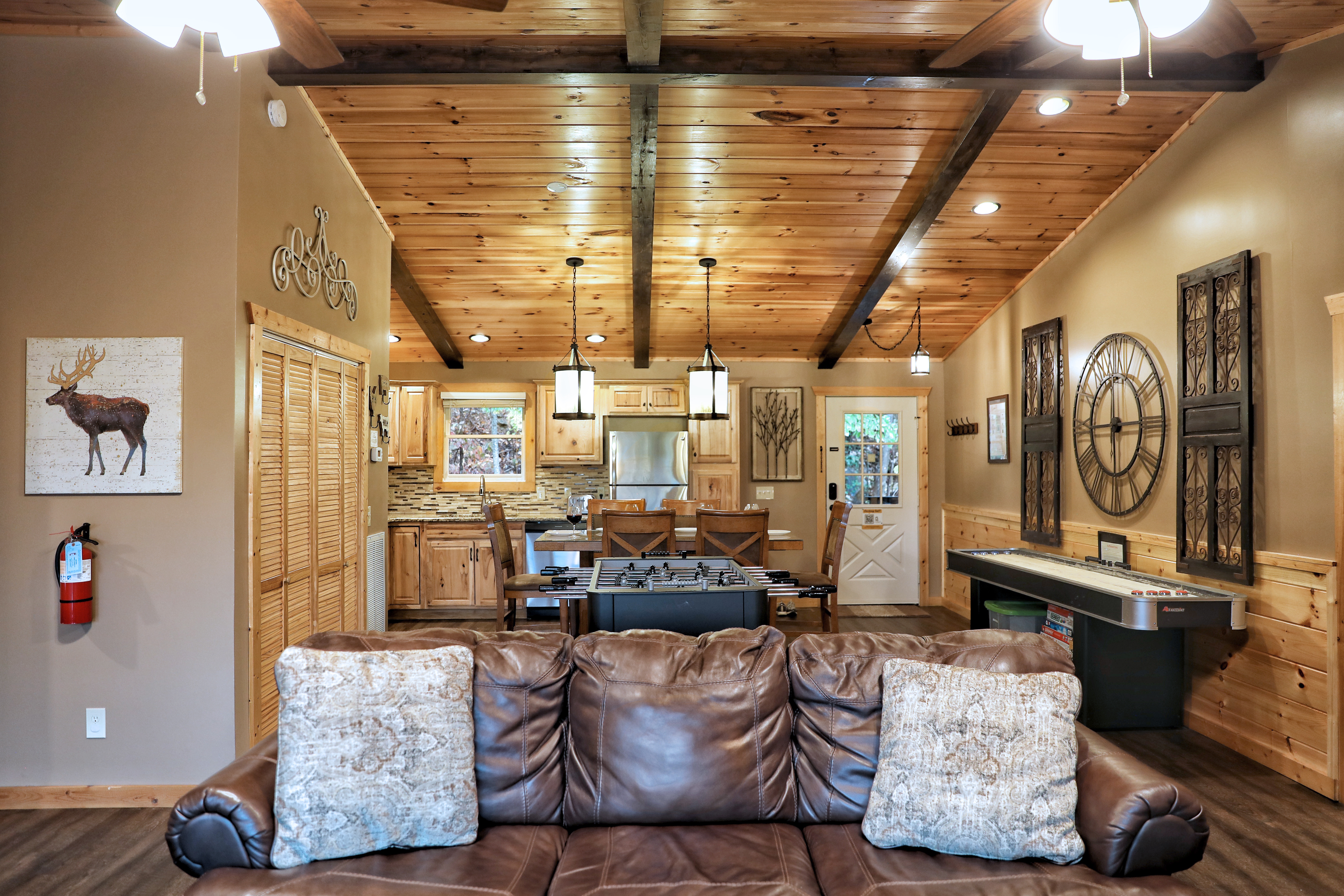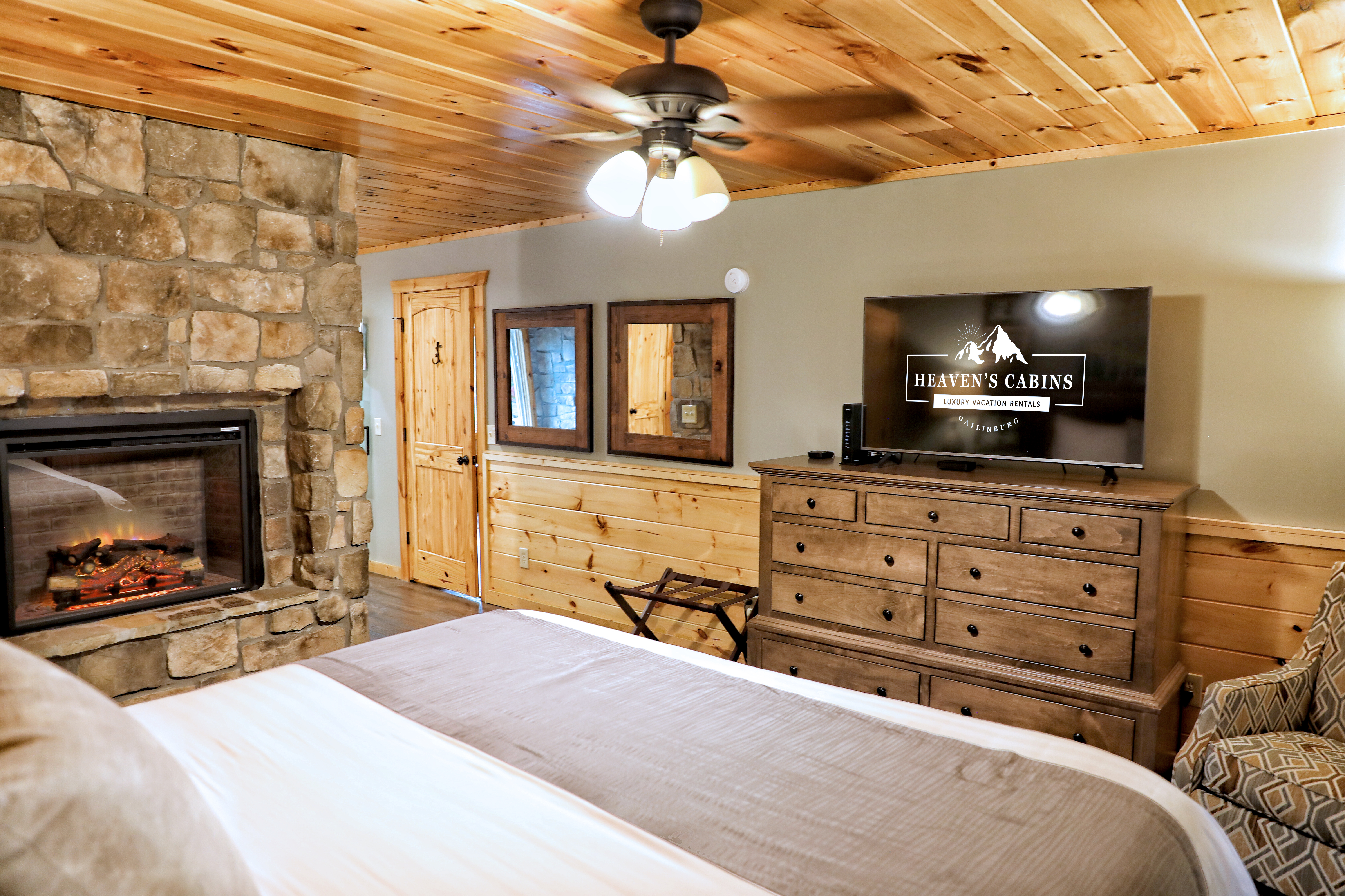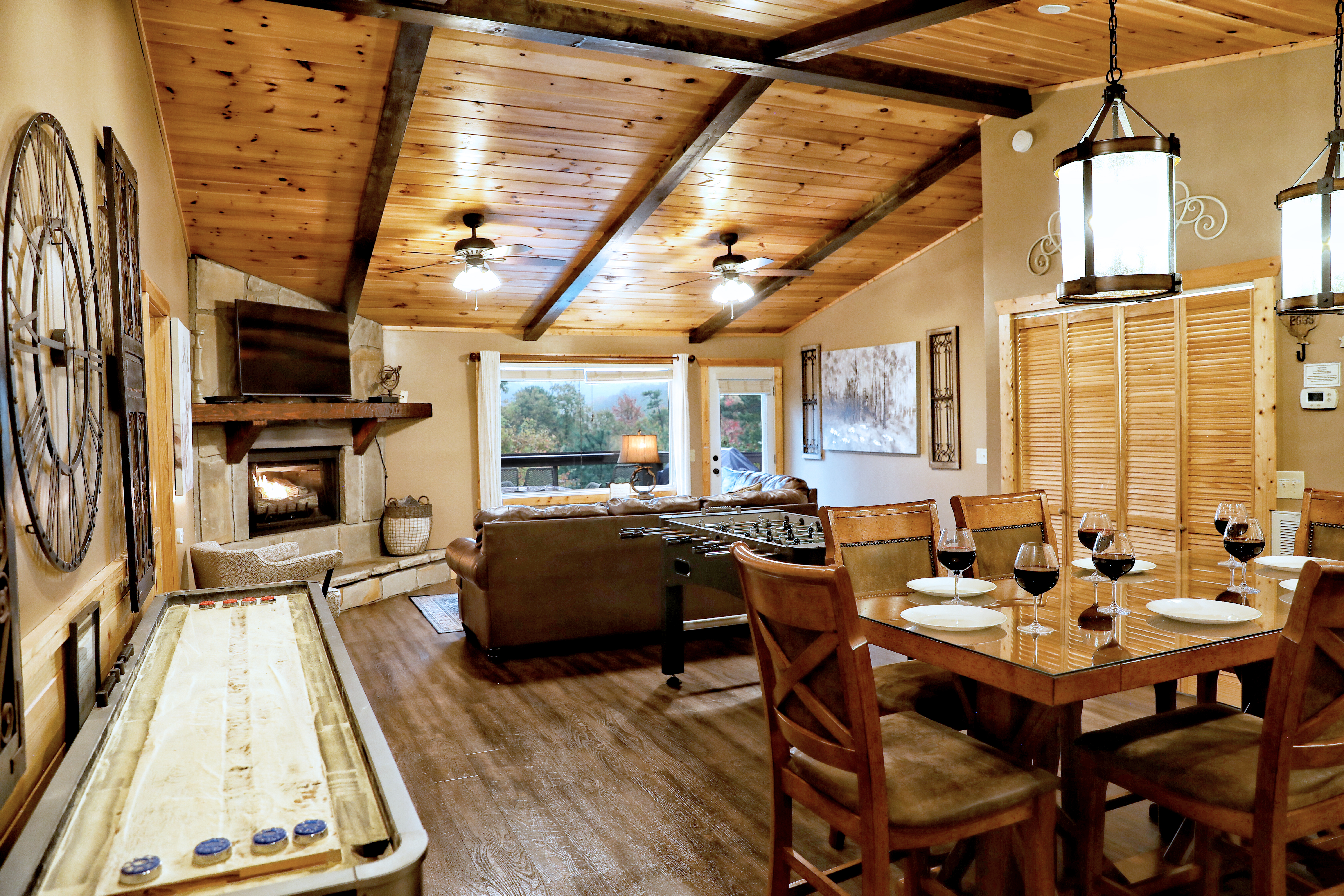 Nestled in the woods with a stunning view of Mt. LeConte, "A Little Bit of Heaven" offers an inviting retreat where rustic charm meets modern comfort. Wake up to breathtaking mountain vistas from your expansive deck, where you can savor a sunrise coffee or soak in the hot tub under a blanket of stars. Inside, you'll find two master suites, each with king beds, ensuite bathrooms featuring jacuzzi tubs, and cozy fireplaces, ensuring a restful stay. The open floor plan seamlessly blends a fully stocked kitchen, cozy living room, and game area, creating a space where everyone can connect and unwind. And with its easy access, this cabin provides a serene escape just moments away from the vibrant Arts and Craft Community, making it the perfect getaway for relaxation, romance, and adventure in the Smoky Mountains.