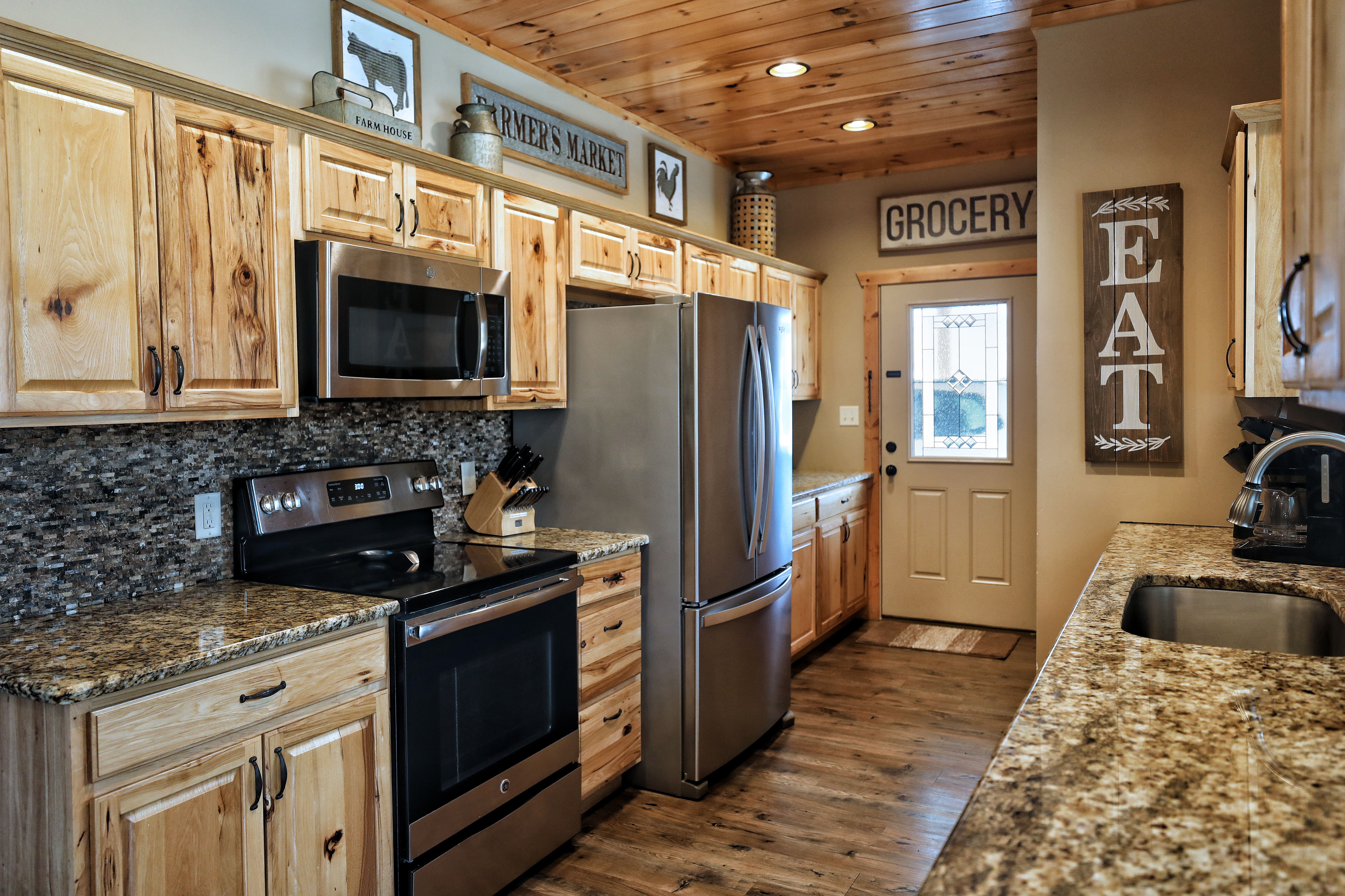 The kitchen is stocked with everything you would expect in a normal kitchen plus a griddle, blender, toaster, waffle maker, slow cooker, various size pots and pans, wine glasses, a Keurig and a regular coffee pot.