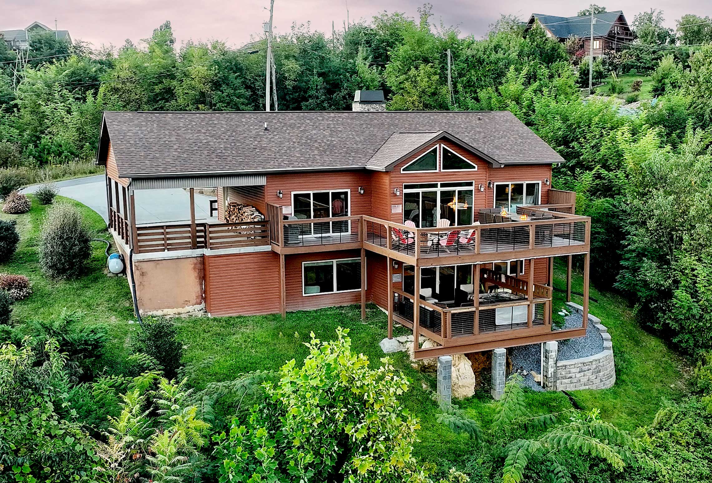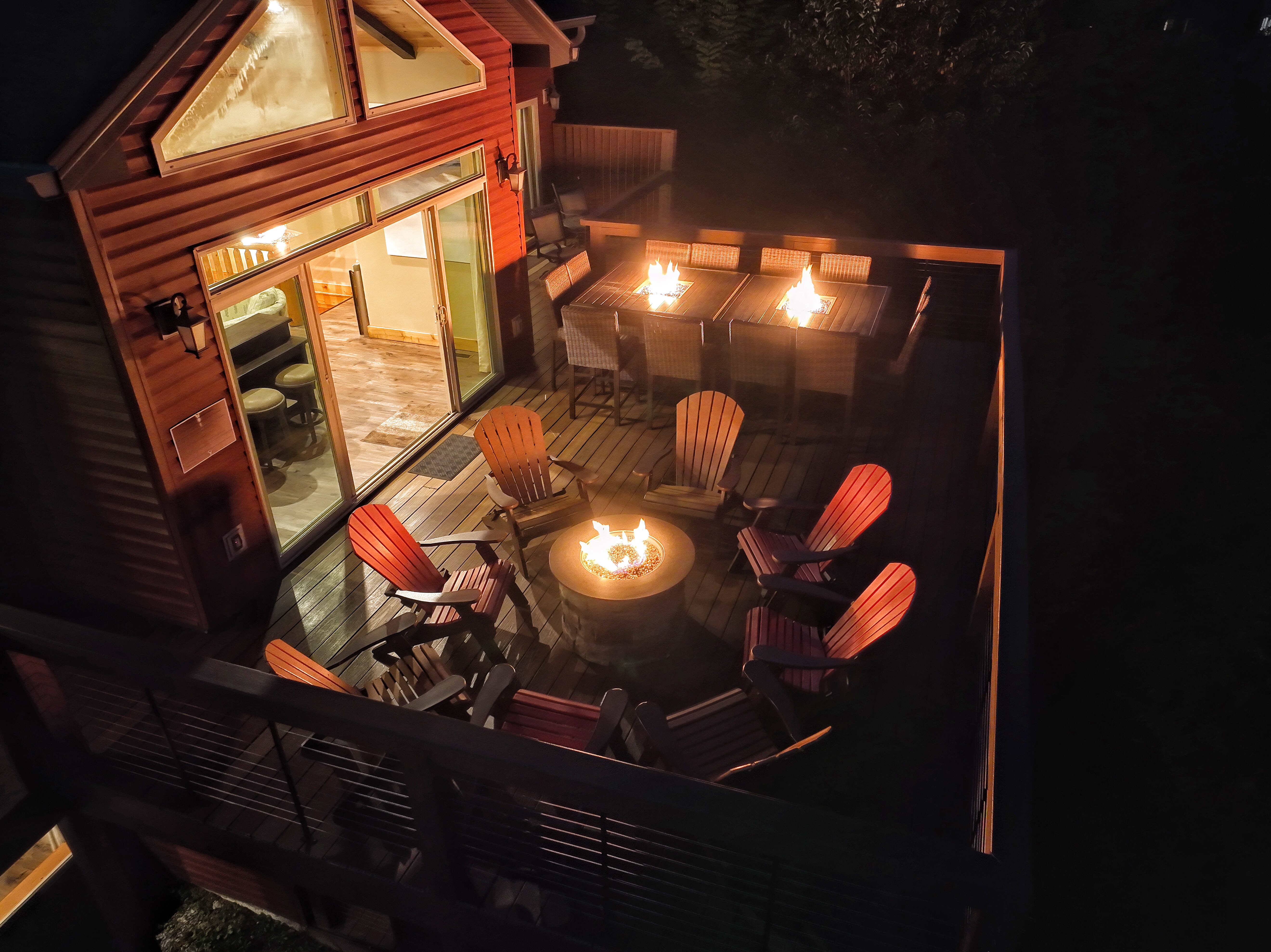 º OUTDOOR SPACES: Expansive decks featuring a hot tub, comfortable seating, alfresco dining table, gas grill, 4 fire pits, and bar top seating.