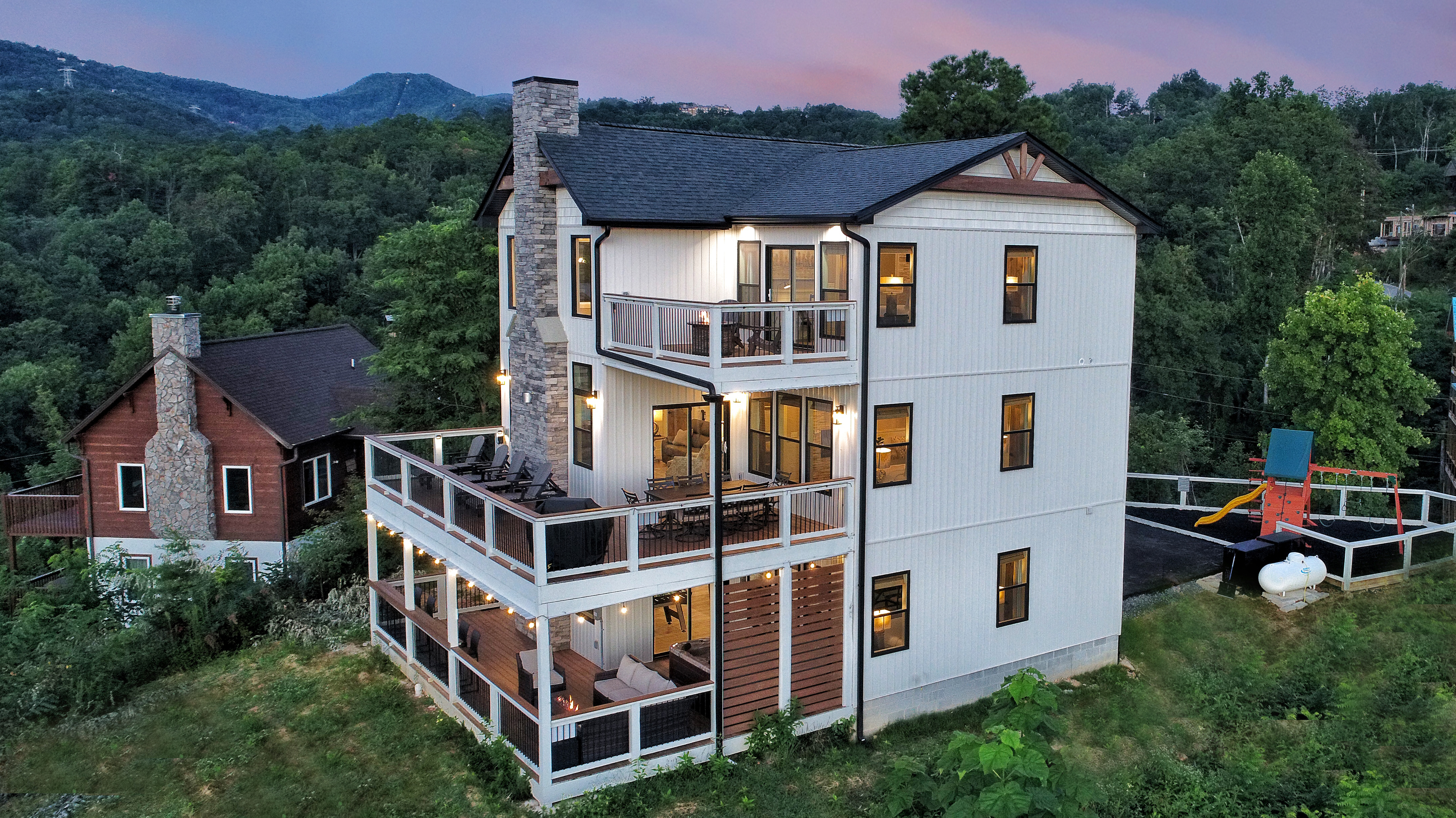º OUTDOOR SPACES: Three levels of decks featuring a hot tub, conversation seating, dining table, lounge chairs, 2 fire pits, playground area, and a gas grill.