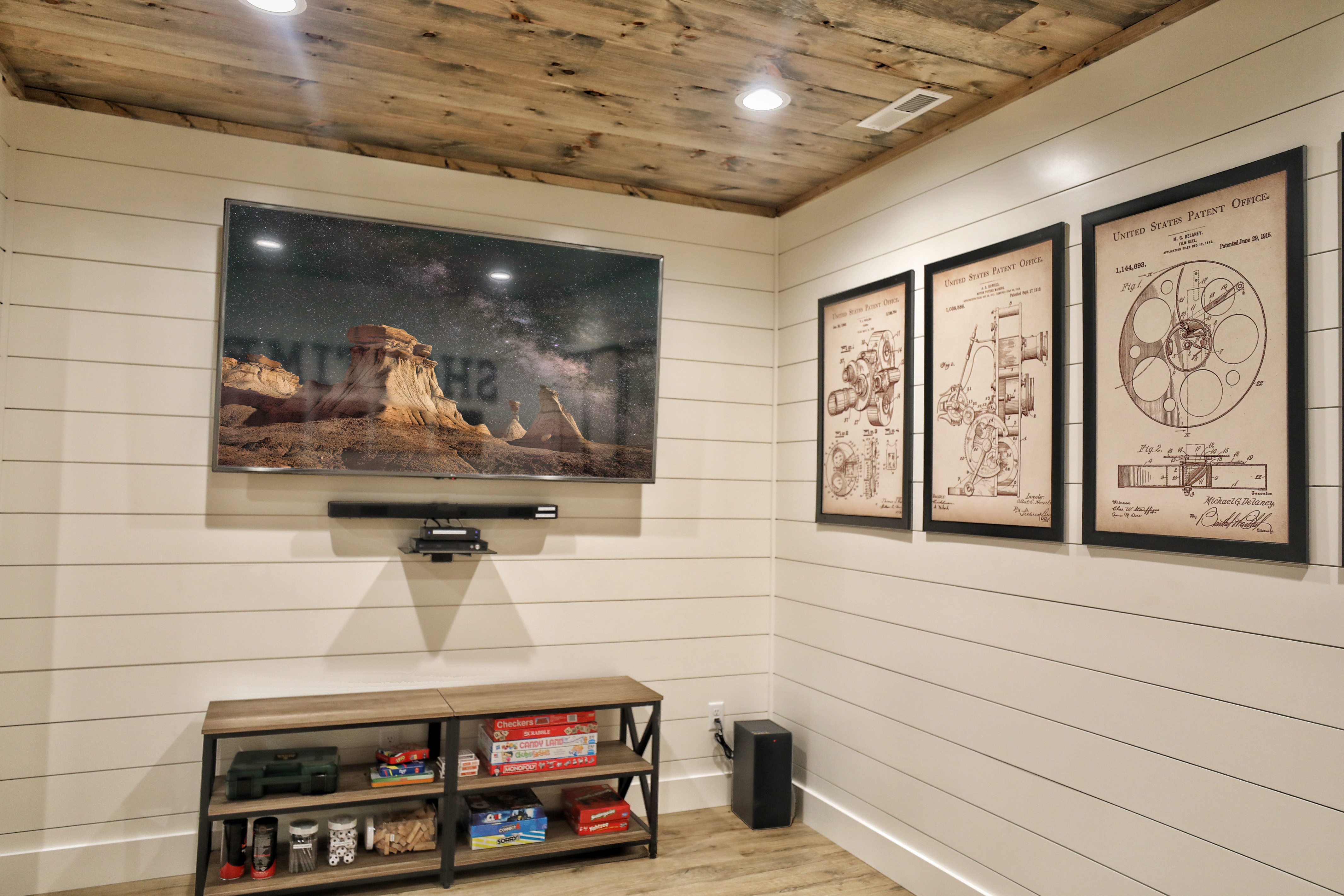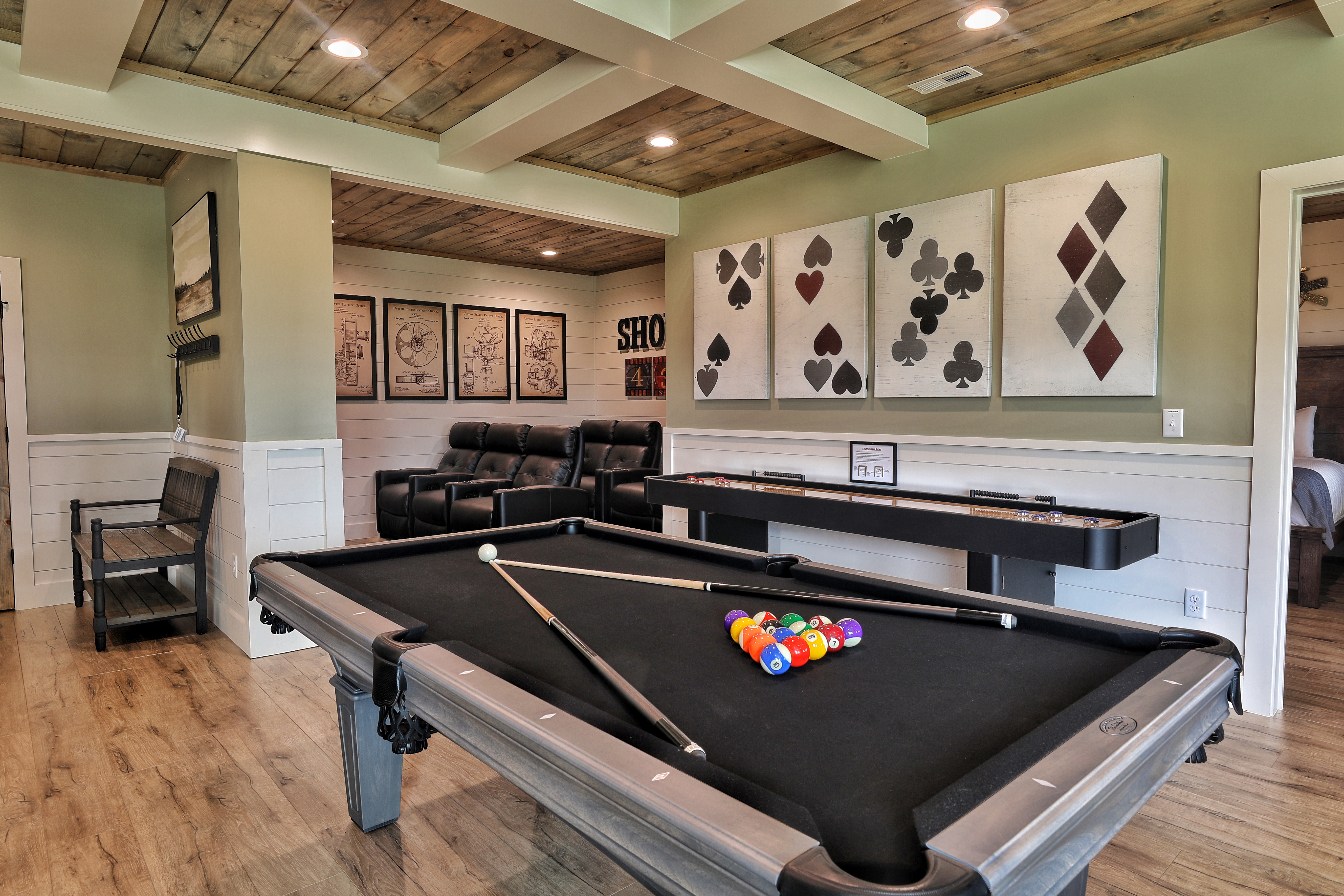 º ENTERTAINMENT: Game room with a poker table, billiards, shuffleboard, foosball, and a theater area with seating for 7.