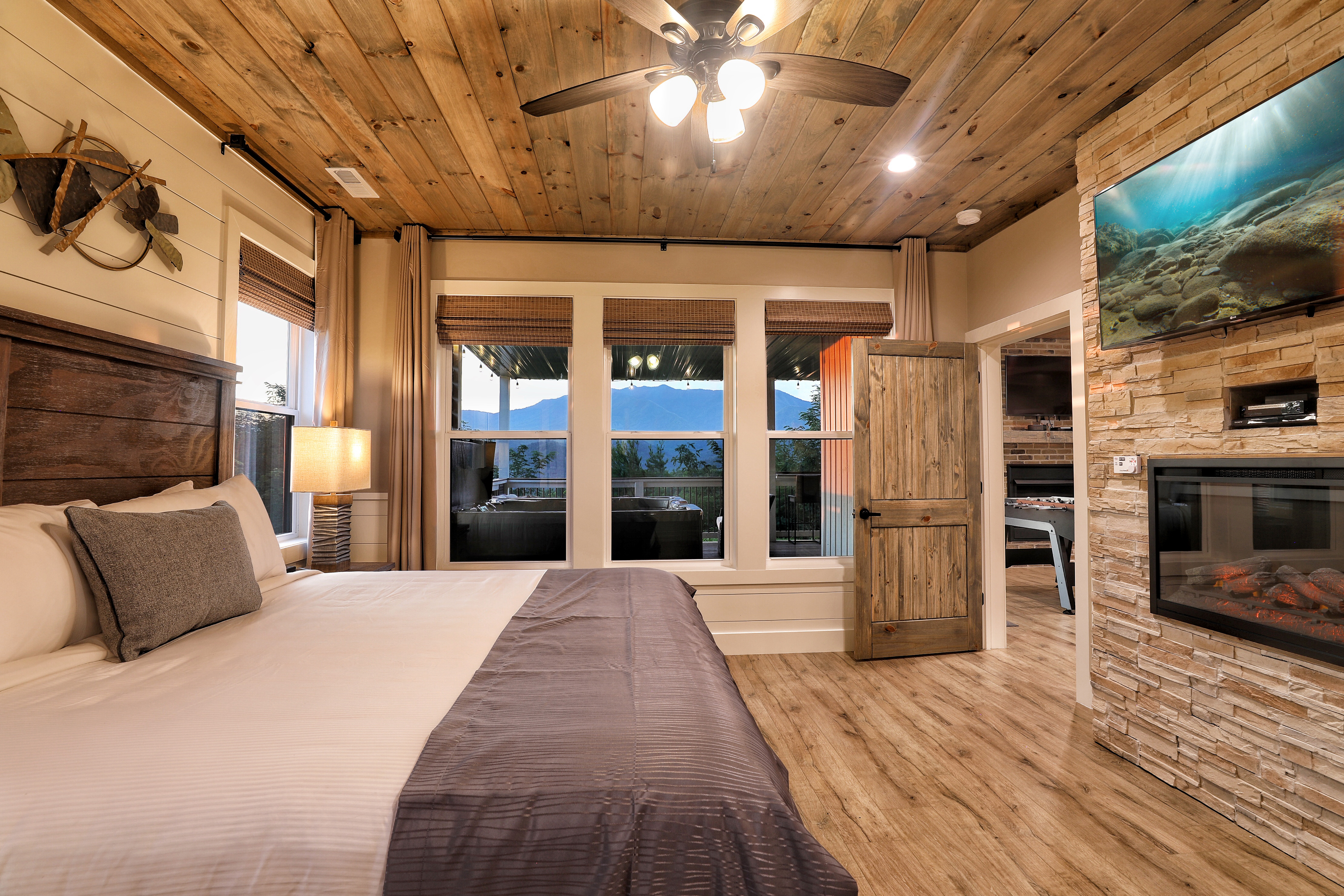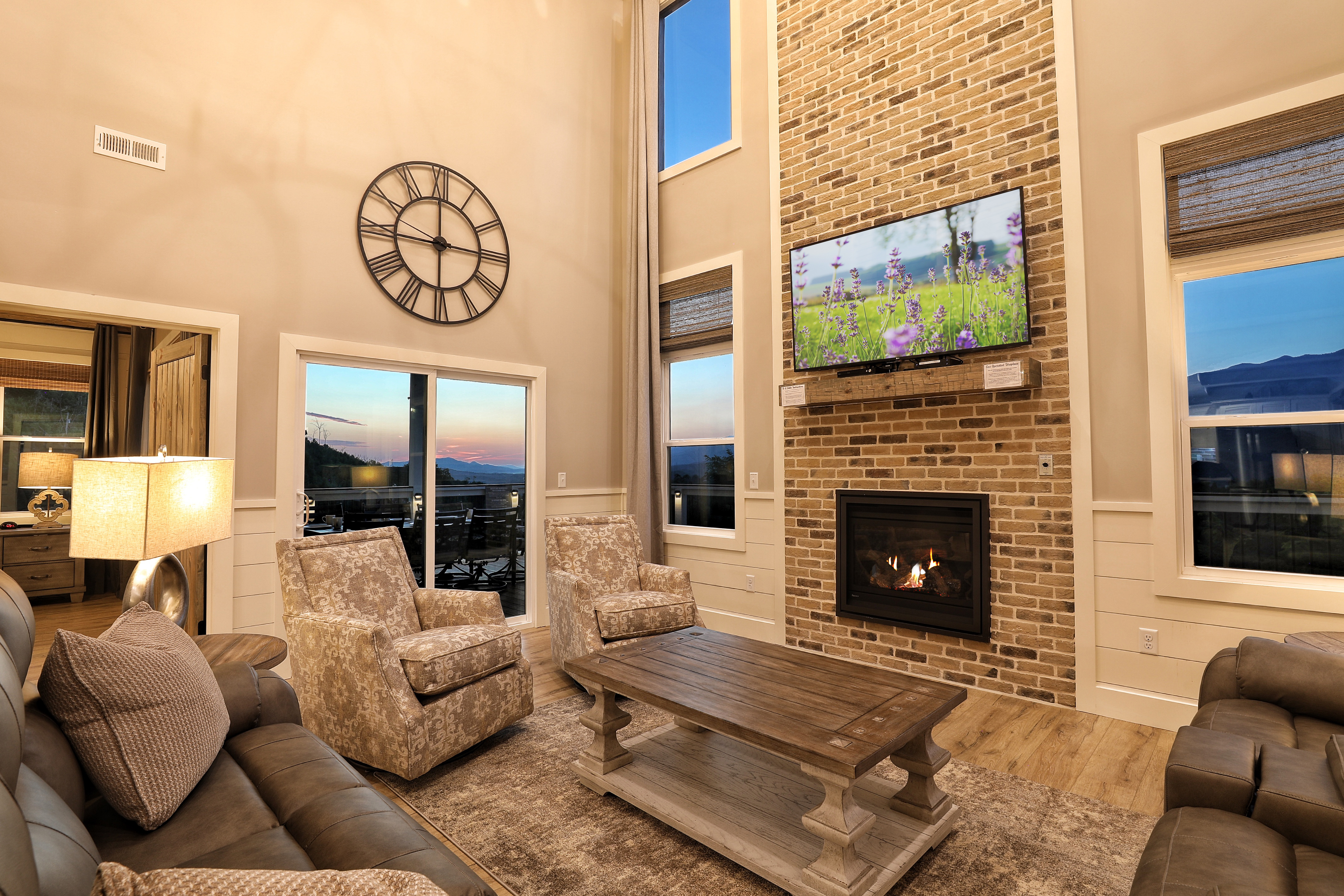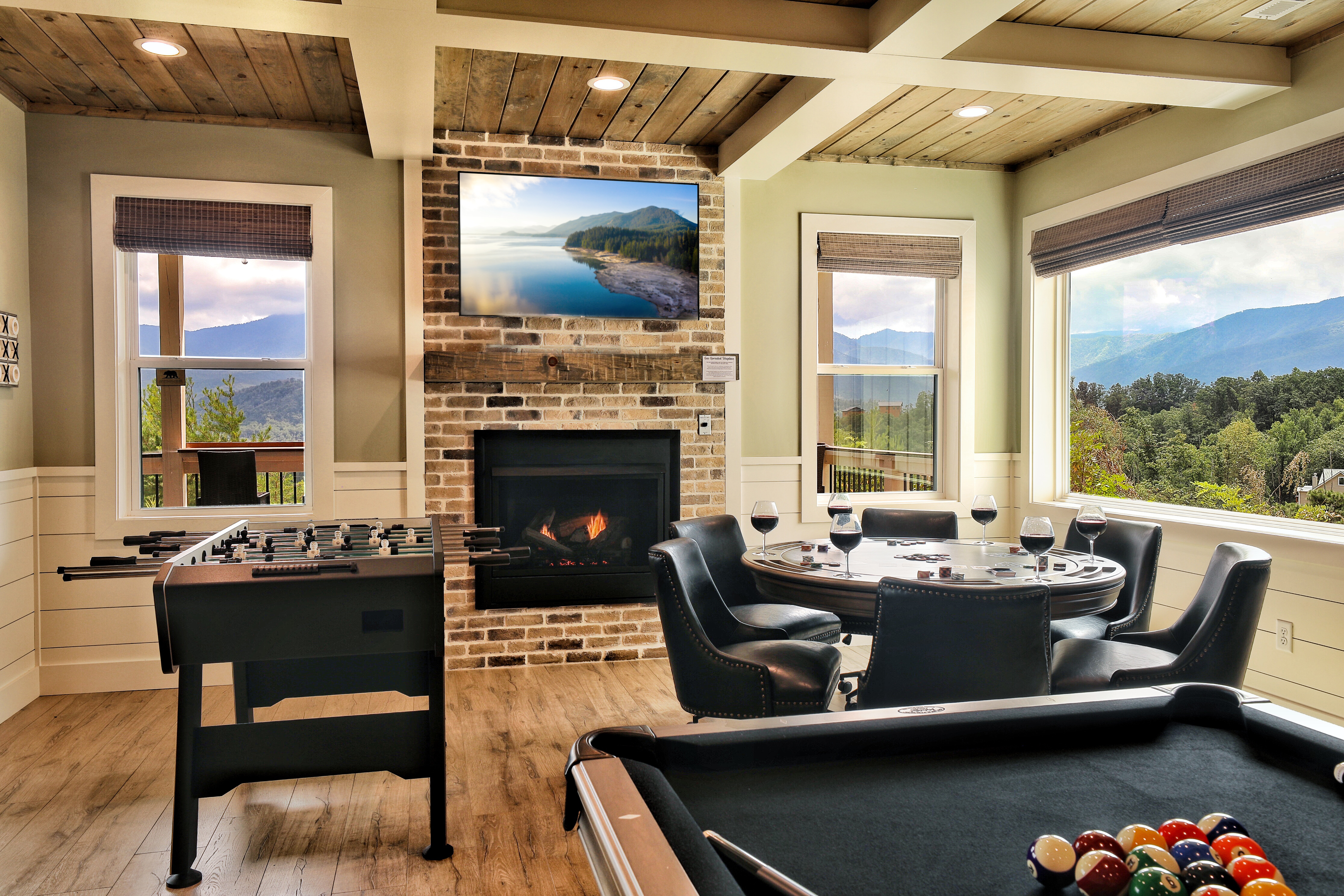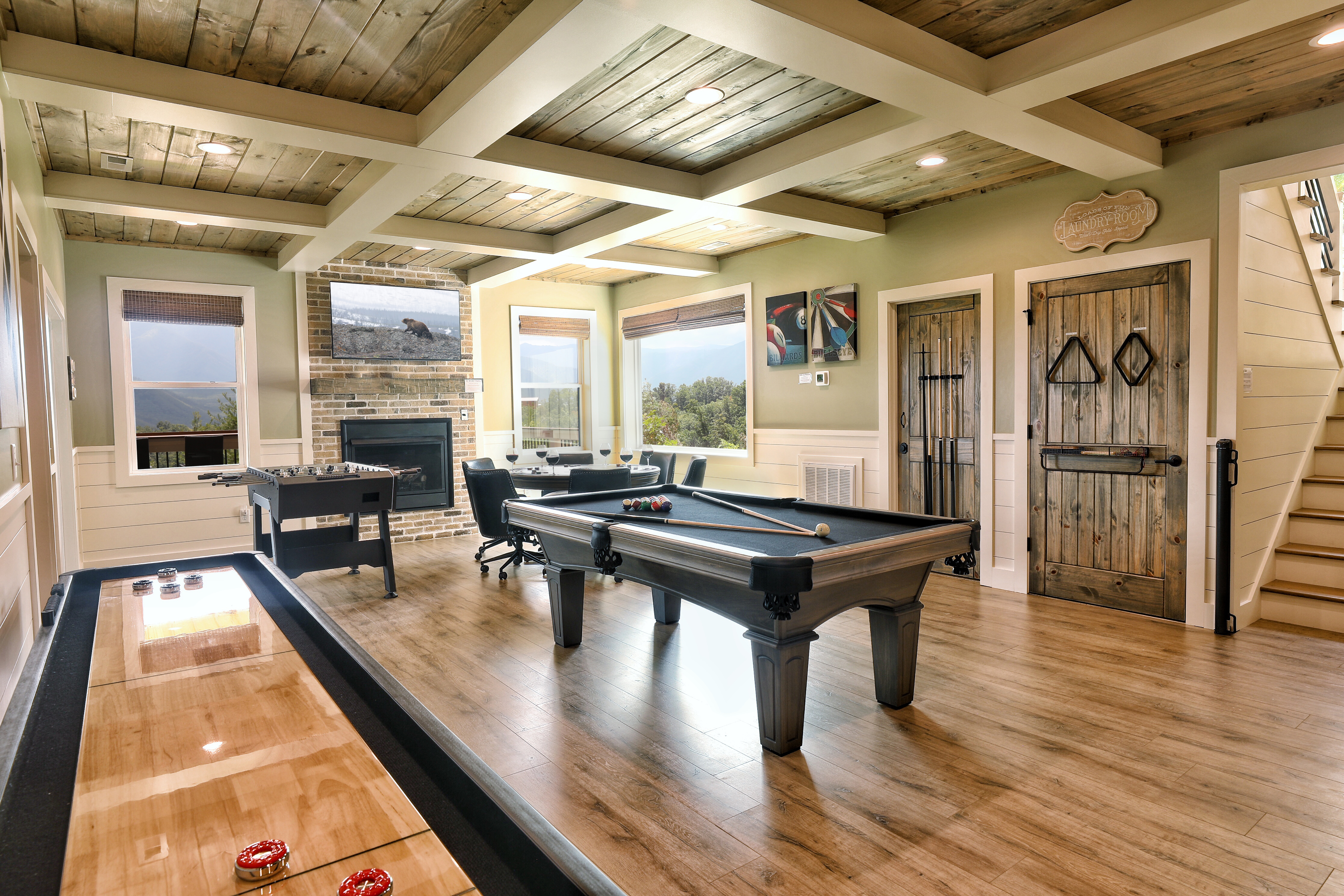 Birds Eye View is a luxury cabin in Chalet Village North, just minutes from Downtown Gatlinburg and Pigeon Forge, with stunning 180-degree views of Mt. LeConte and the Smoky Mountains. This retreat features a spacious game room equipped with pool, shuffleboard, foosball, and card games, ensuring endless fun for all ages. The cozy living room has a gas fireplace and high vaulted ceilings that frame breathtaking mountain views. The cabin also includes a dedicated office space for those who need to work remotely. Enjoy the fully equipped kitchen, indoor and outdoor dining areas, an expansive deck perfect for stargazing, and a relaxing hot tub. Stay connected with free Wi-Fi and premium cable TV in every room.
