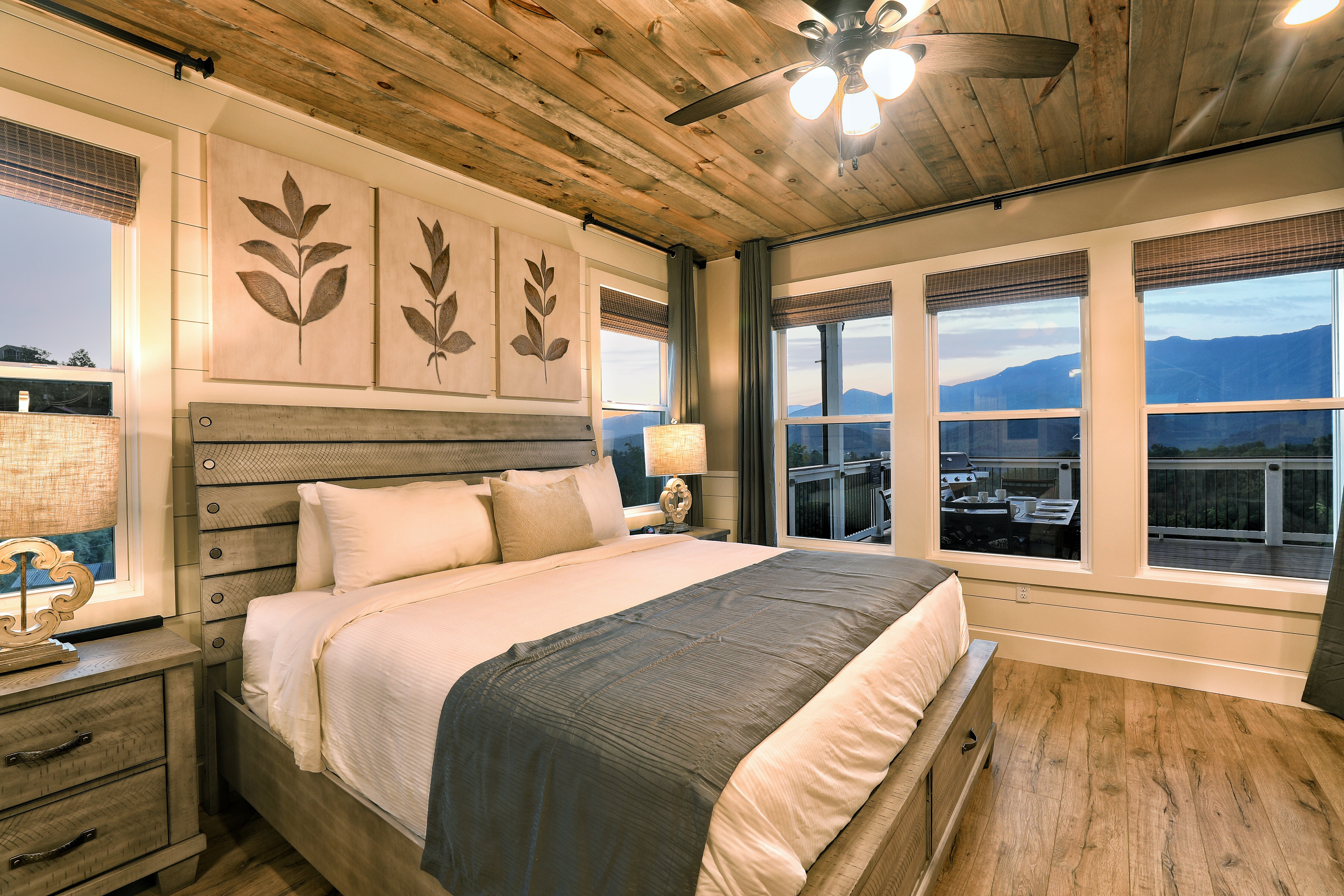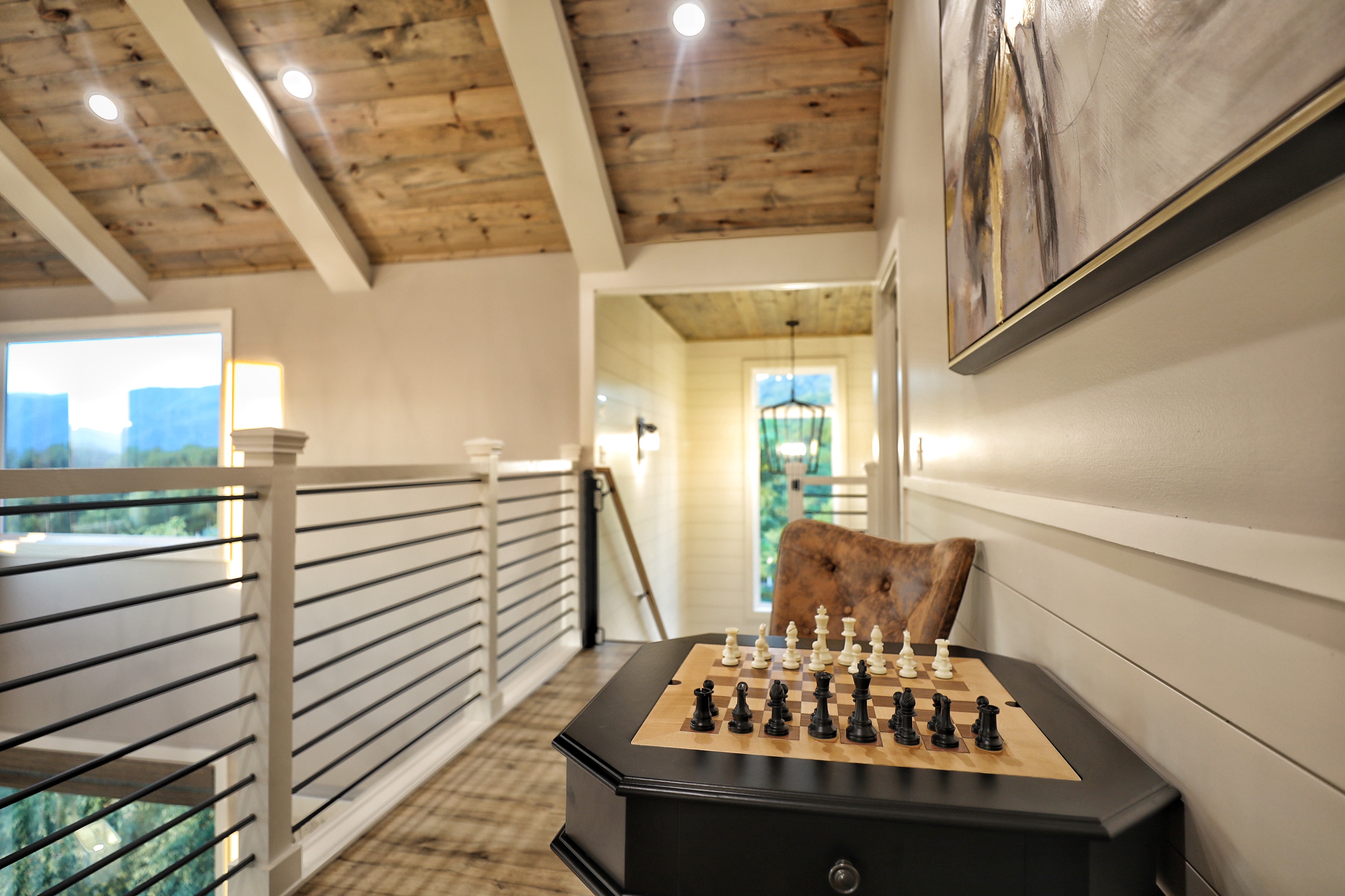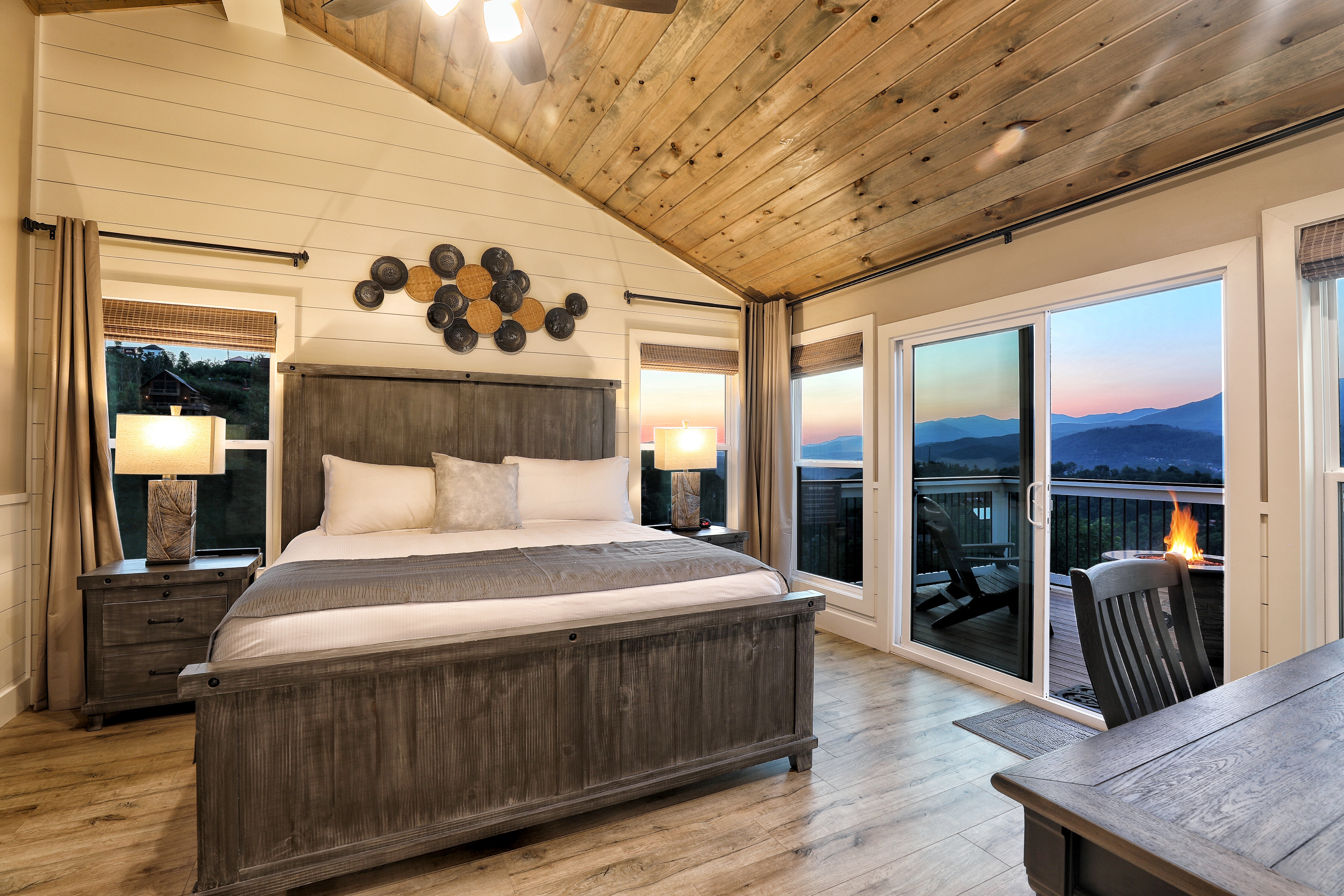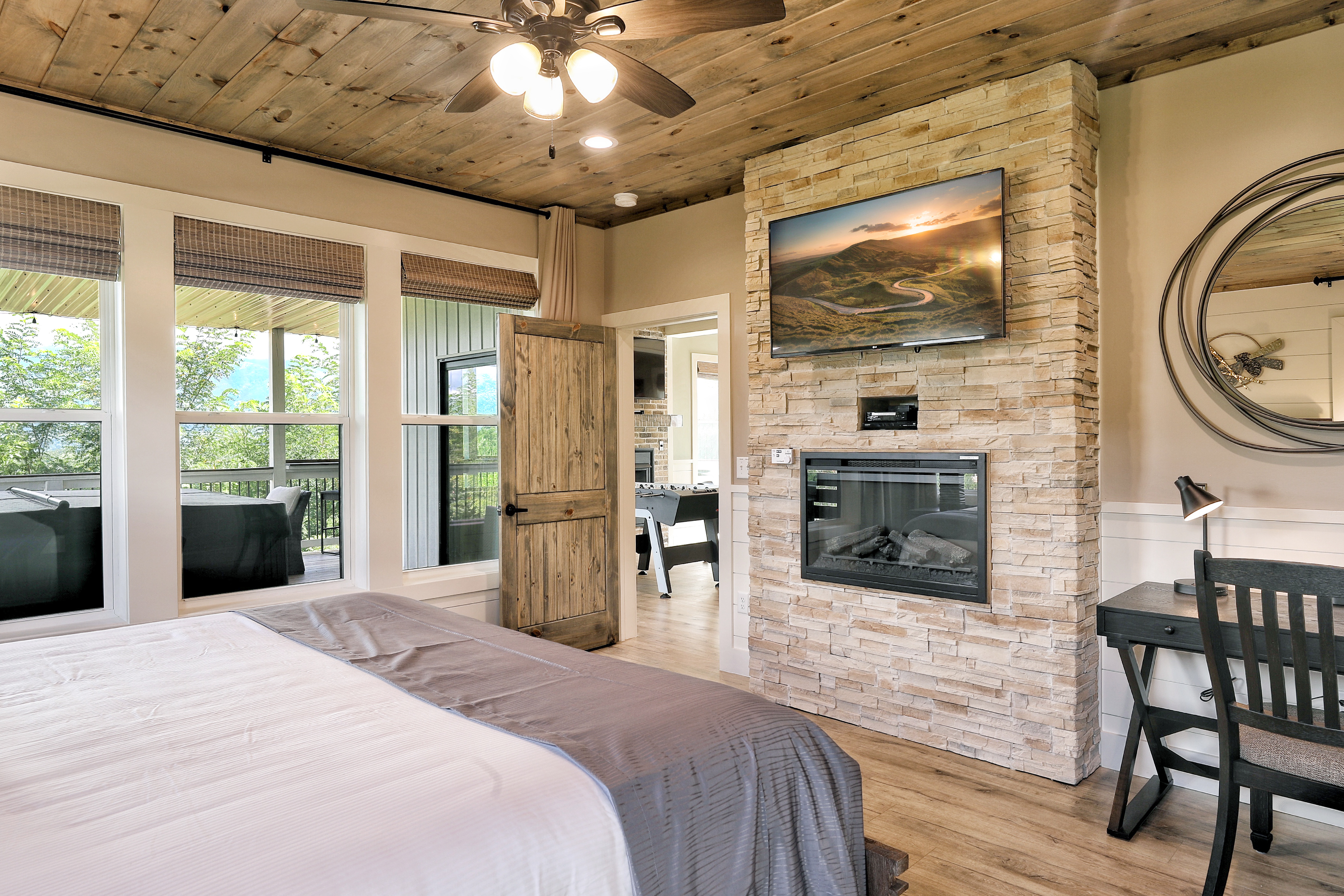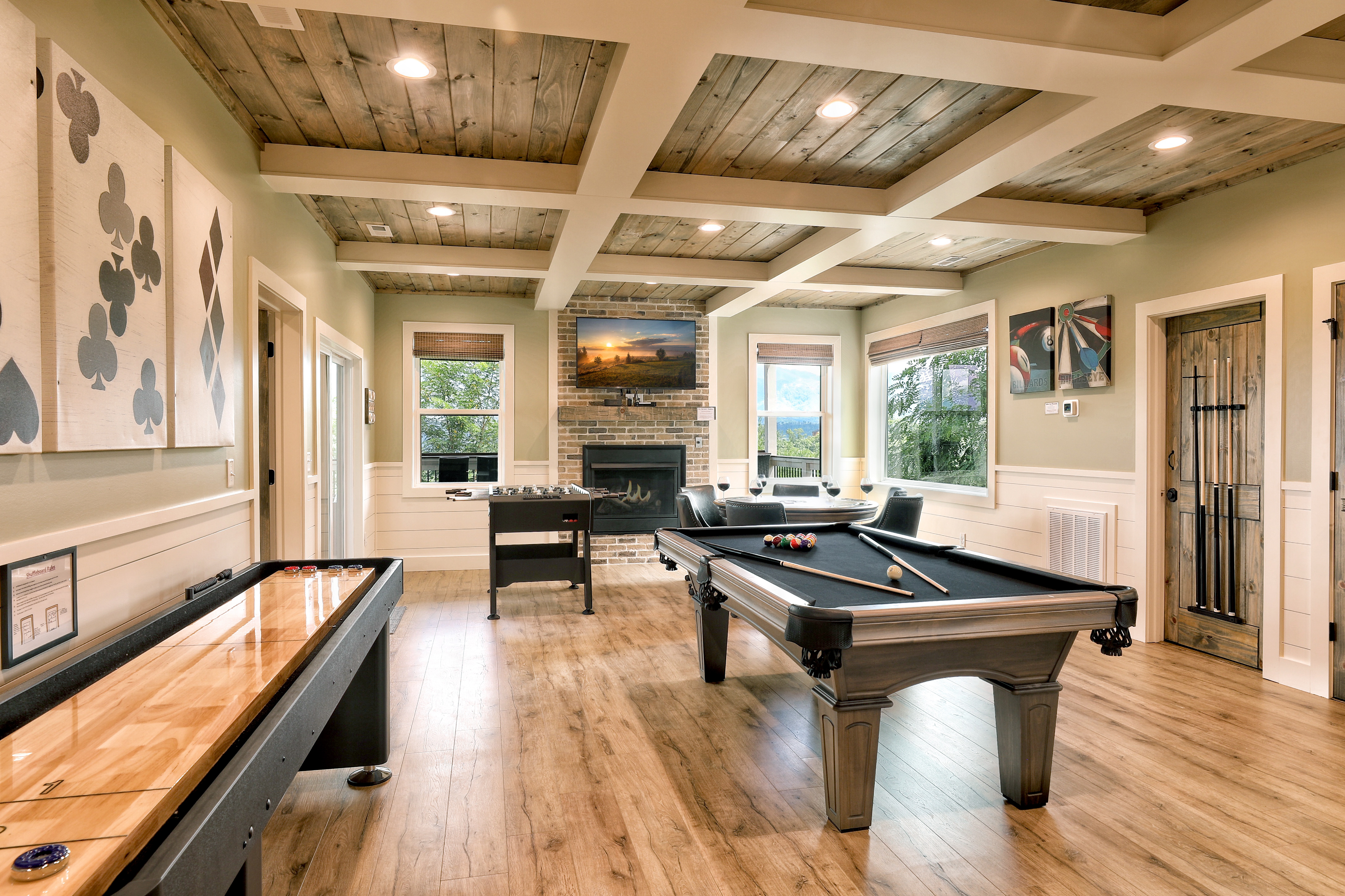 Birds Eye View is a luxury cabin in Chalet Village North, just minutes from Downtown Gatlinburg and Pigeon Forge, with stunning 180-degree views of Mt. LeConte and the Smoky Mountains. This retreat features a spacious game room equipped with pool, shuffleboard, foosball, and card games, ensuring endless fun for all ages. The cozy living room has a gas fireplace and high vaulted ceilings that frame breathtaking mountain views. The cabin also includes a dedicated office space for those who need to work remotely. Enjoy the fully equipped kitchen, indoor and outdoor dining areas, an expansive deck perfect for stargazing, and a relaxing hot tub. Stay connected with free Wi-Fi and premium cable TV in every room.