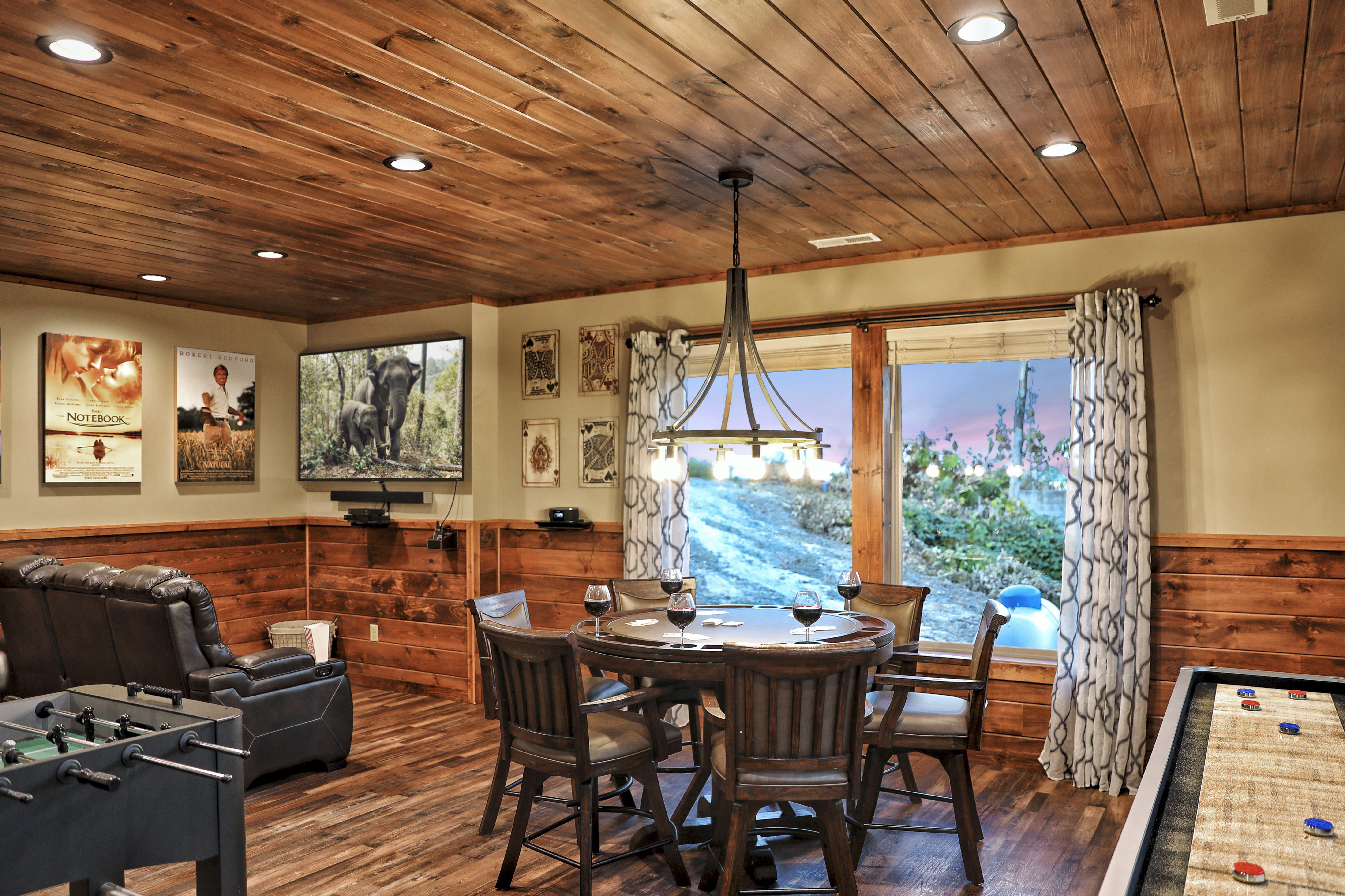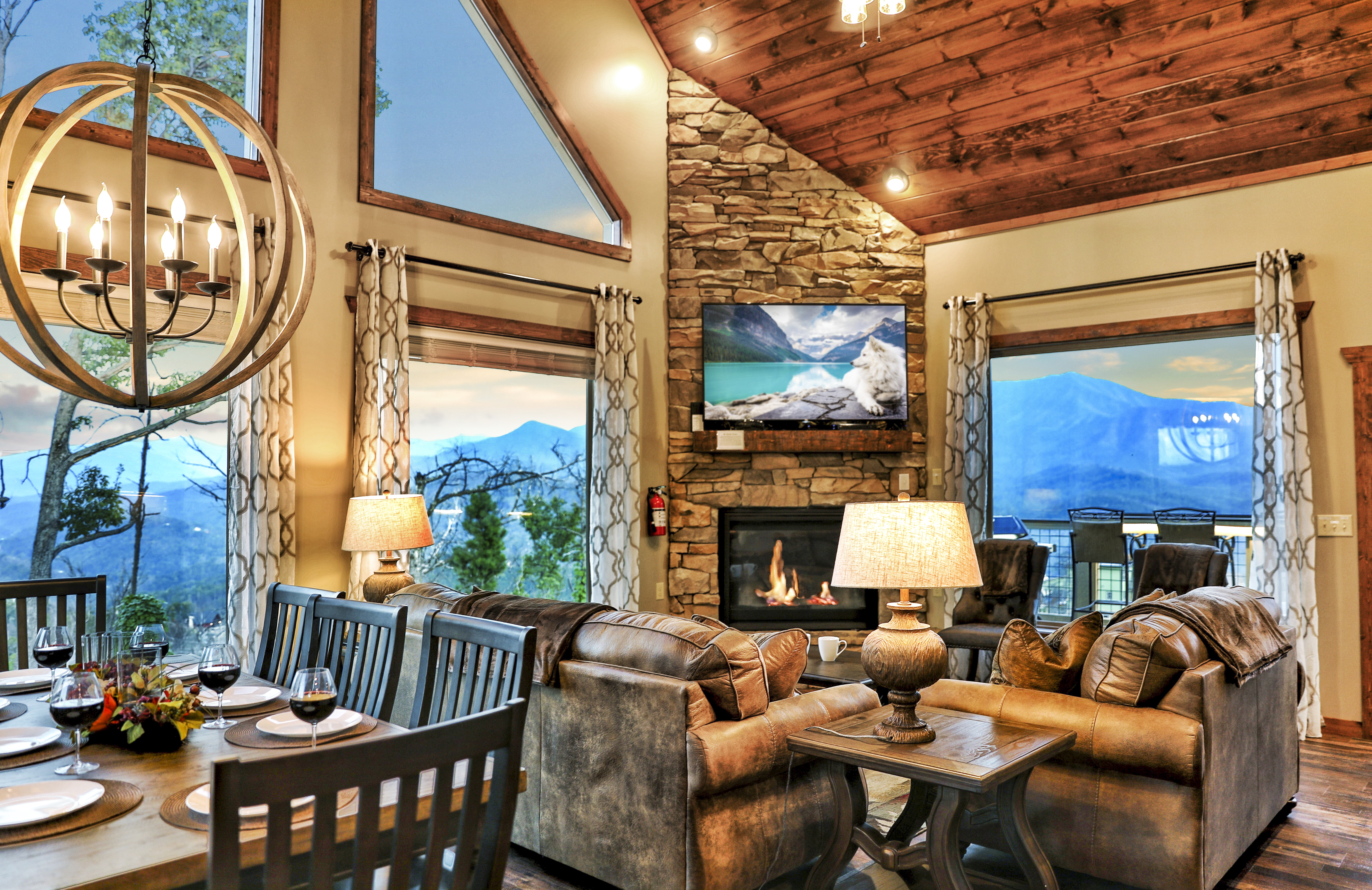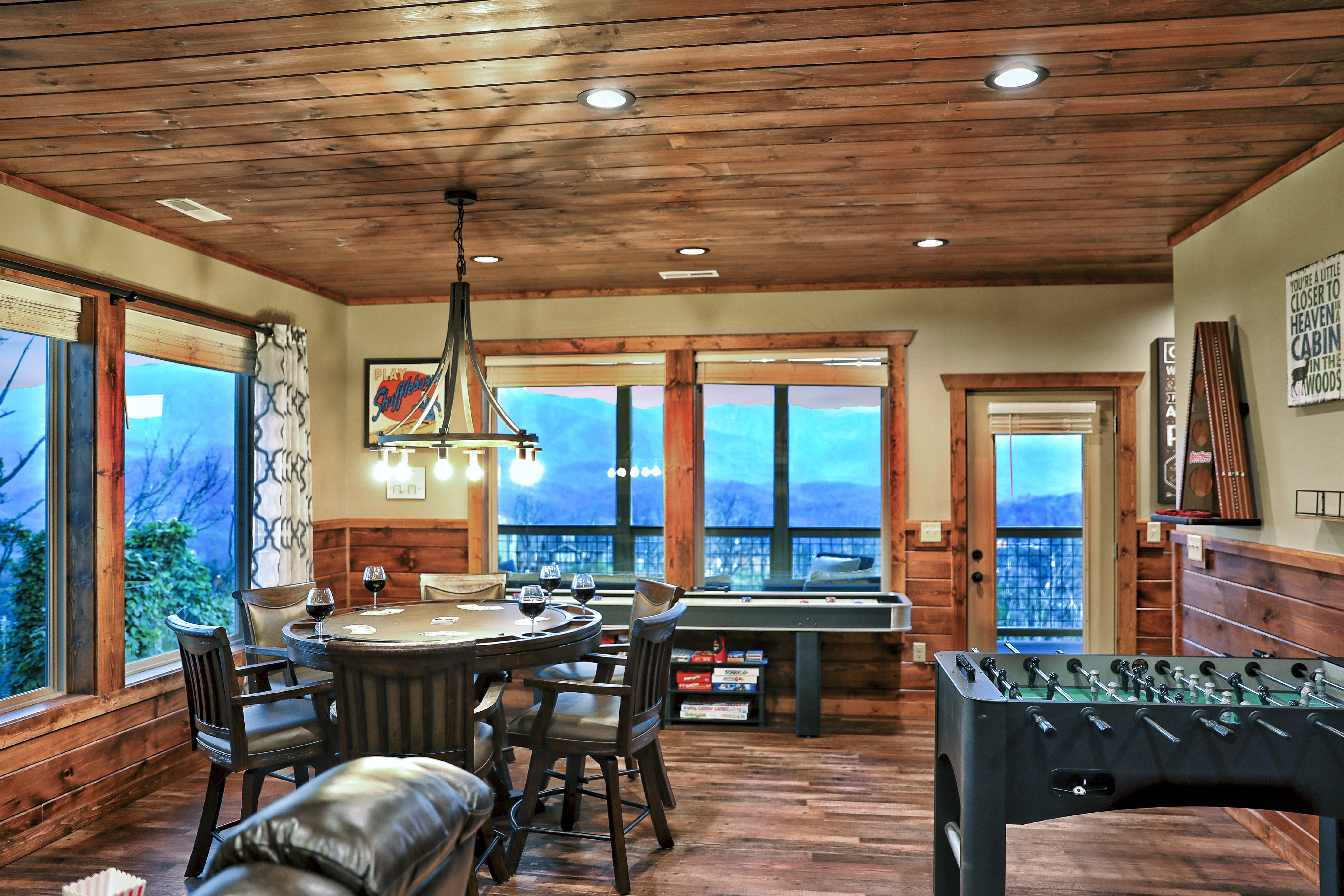 "Closer to Heaven" sits majestically atop the mountain, offering unique, unobstructed views of Mt. LeConte and the surrounding valleys from every level. This retreat is thoughtfully designed with comfort and style, featuring expansive decks where you can soak in the breathtaking vistas. Inside, the cabin blends rustic charm with modern amenities, including a gourmet kitchen with stainless steel appliances, a cozy floor-to-ceiling fireplace, and a game room equipped with a card table for family fun. The cabin also offers theater-style seating, perfect for gathering everyone to watch the big game or a favorite movie. Each of the three master suites boasts deck access, providing stunning views to wake up to. With a hot tub, multiple fire pits, and ample outdoor seating, this cabin invites you to relax and take in the unparalleled beauty of the Smokies.
