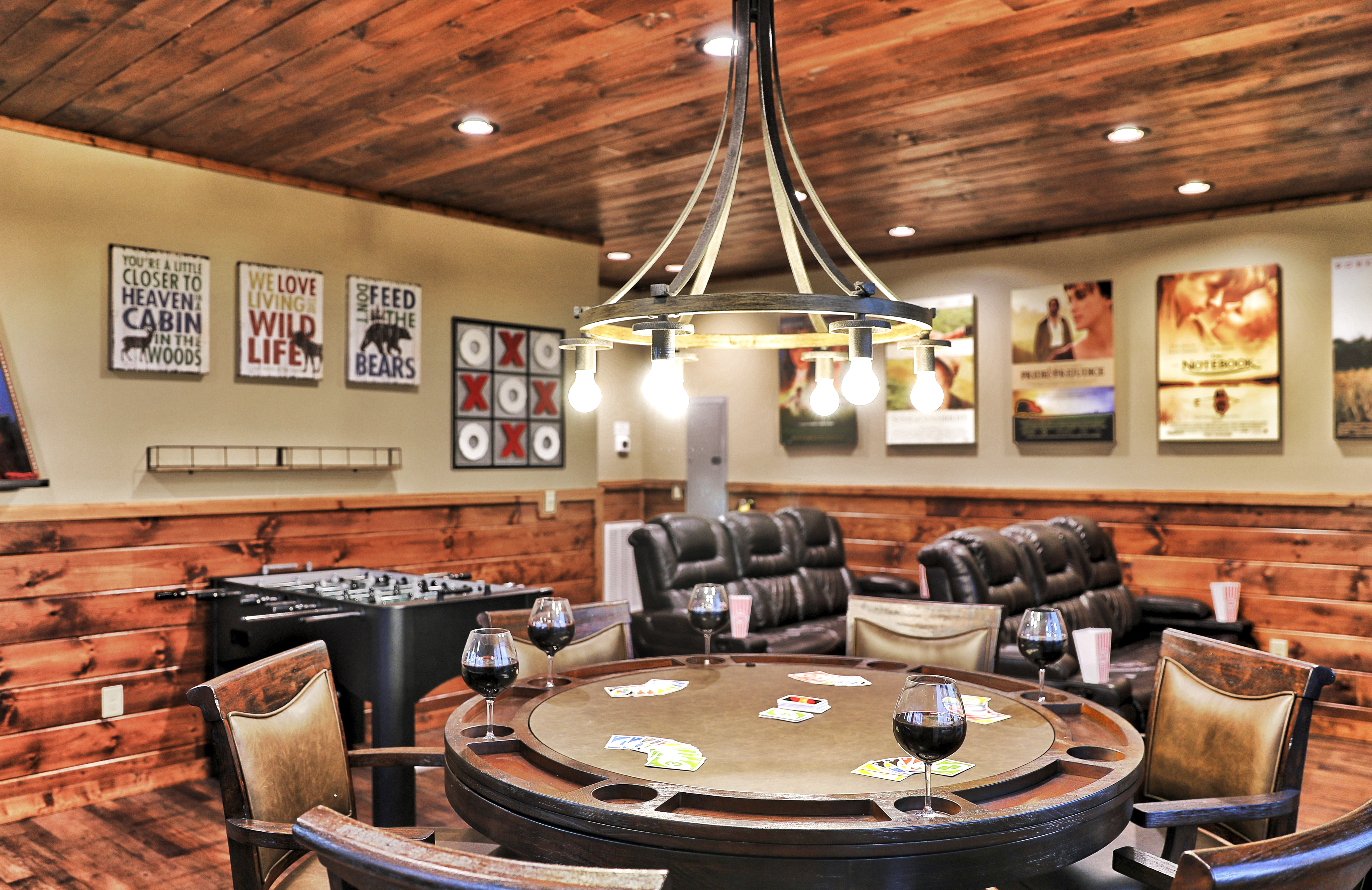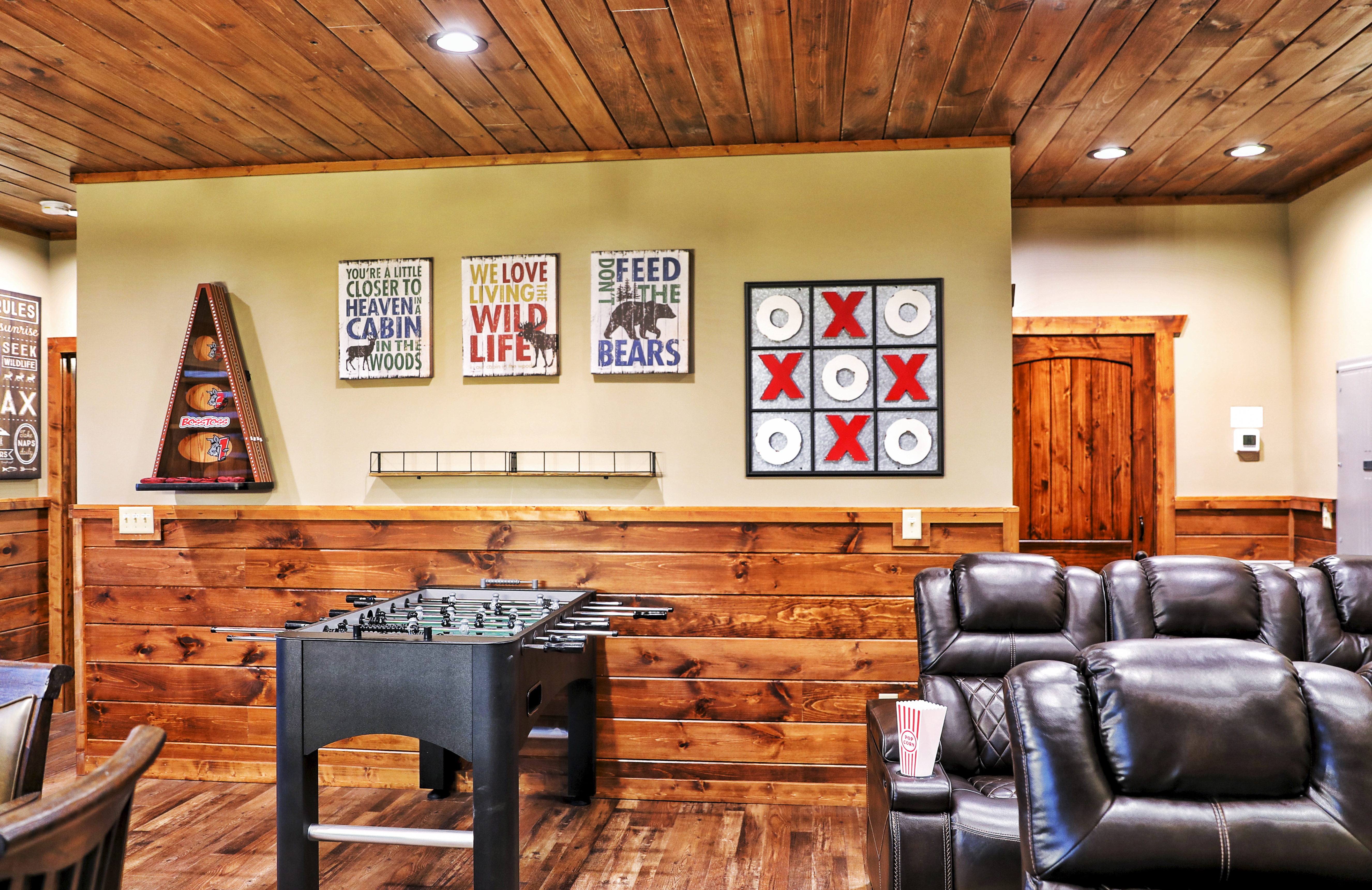 º ENTERTAINMENT: Game room featuring theater seating, billiards, shuffleboard, foosball, and a selection of board games.