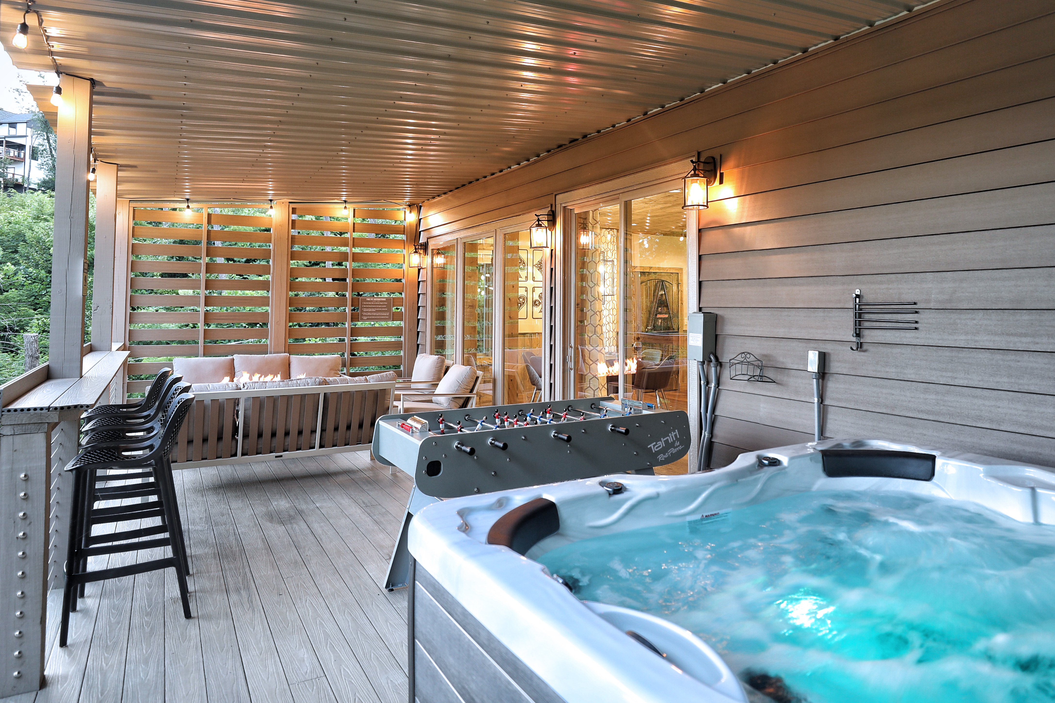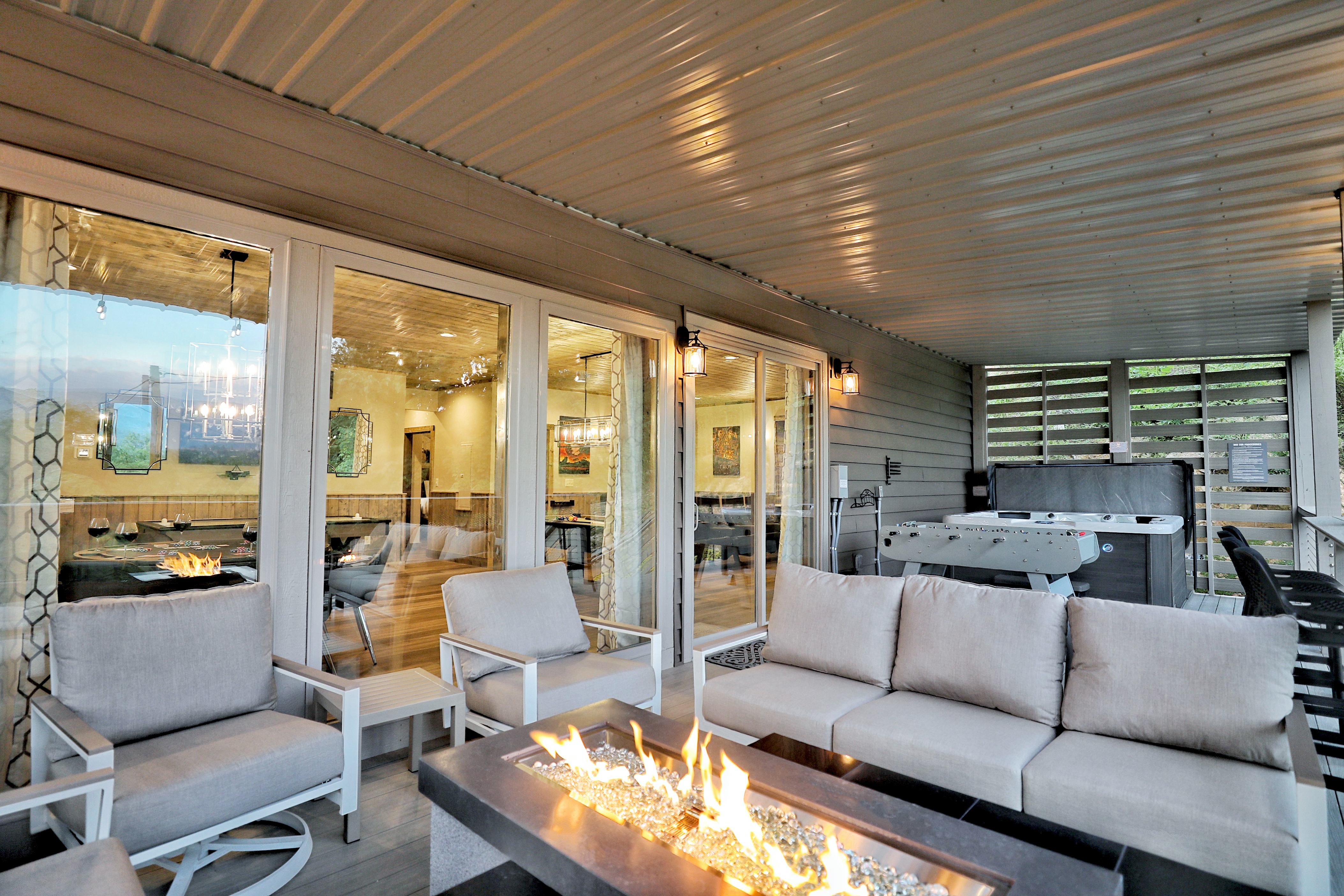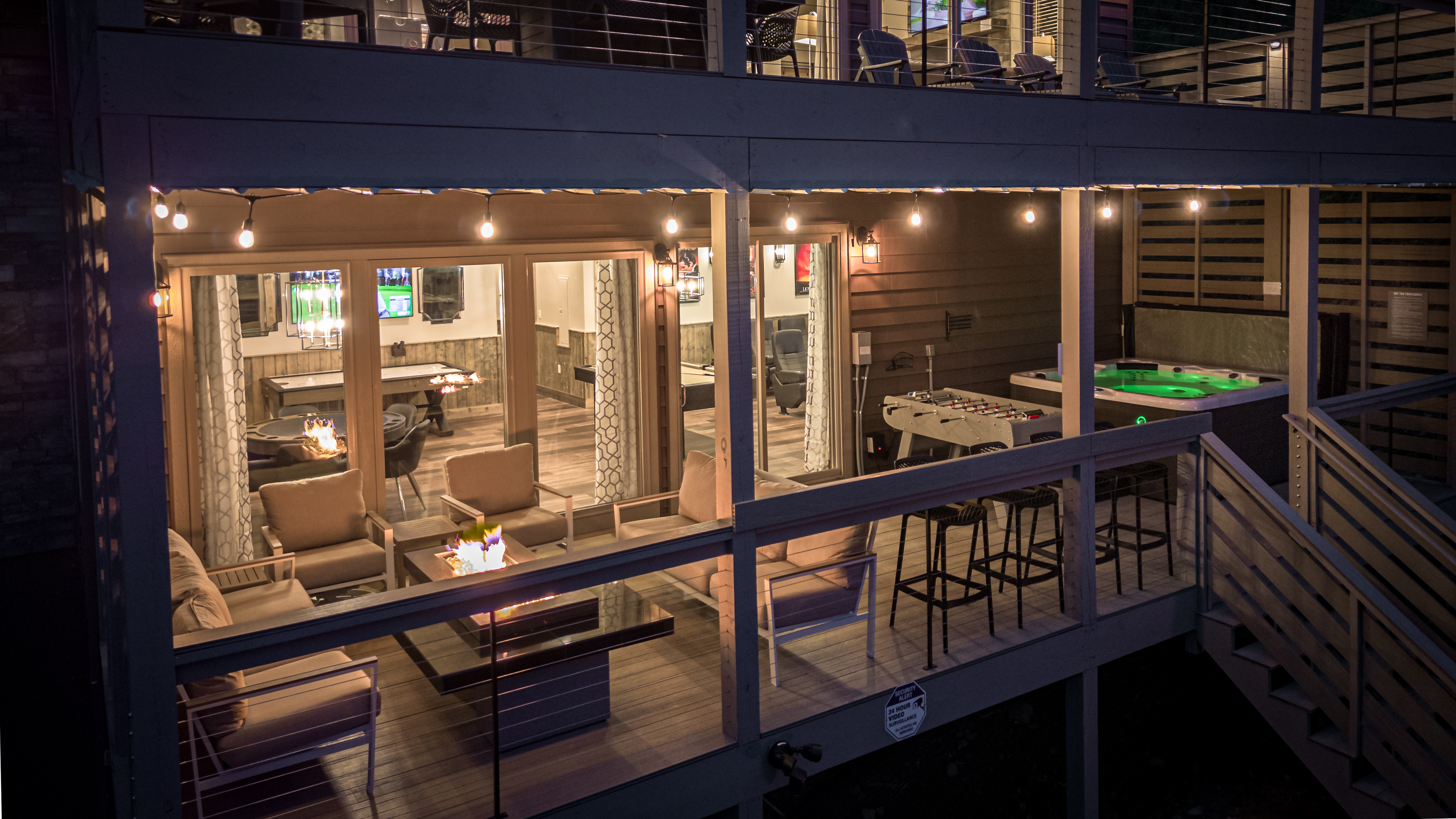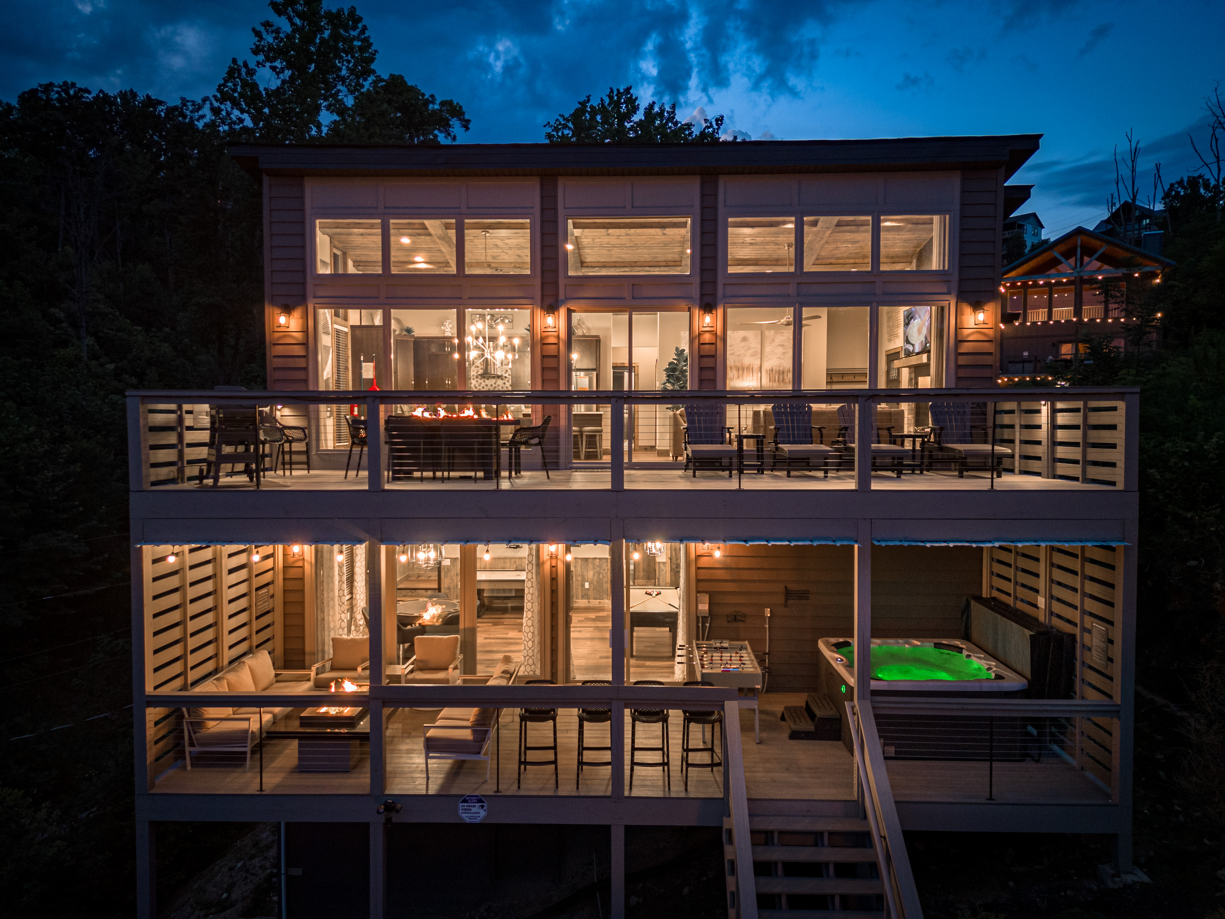 The property was super clean and beautifully decorated with modern decor. The firepit with landscaping out back is so relaxing as is the covered deck with comfy furniture on the lower level with hot tub and gas firepit. We liked that Every bedroom had its own full bath and great system in the theater room with its own mini fridge and plenty of room for pool, poker, or whatever game you chose. Some twists and turns to the property (like most of the properties in this area) but well worth it! After the second day was a breeze.- Sheila