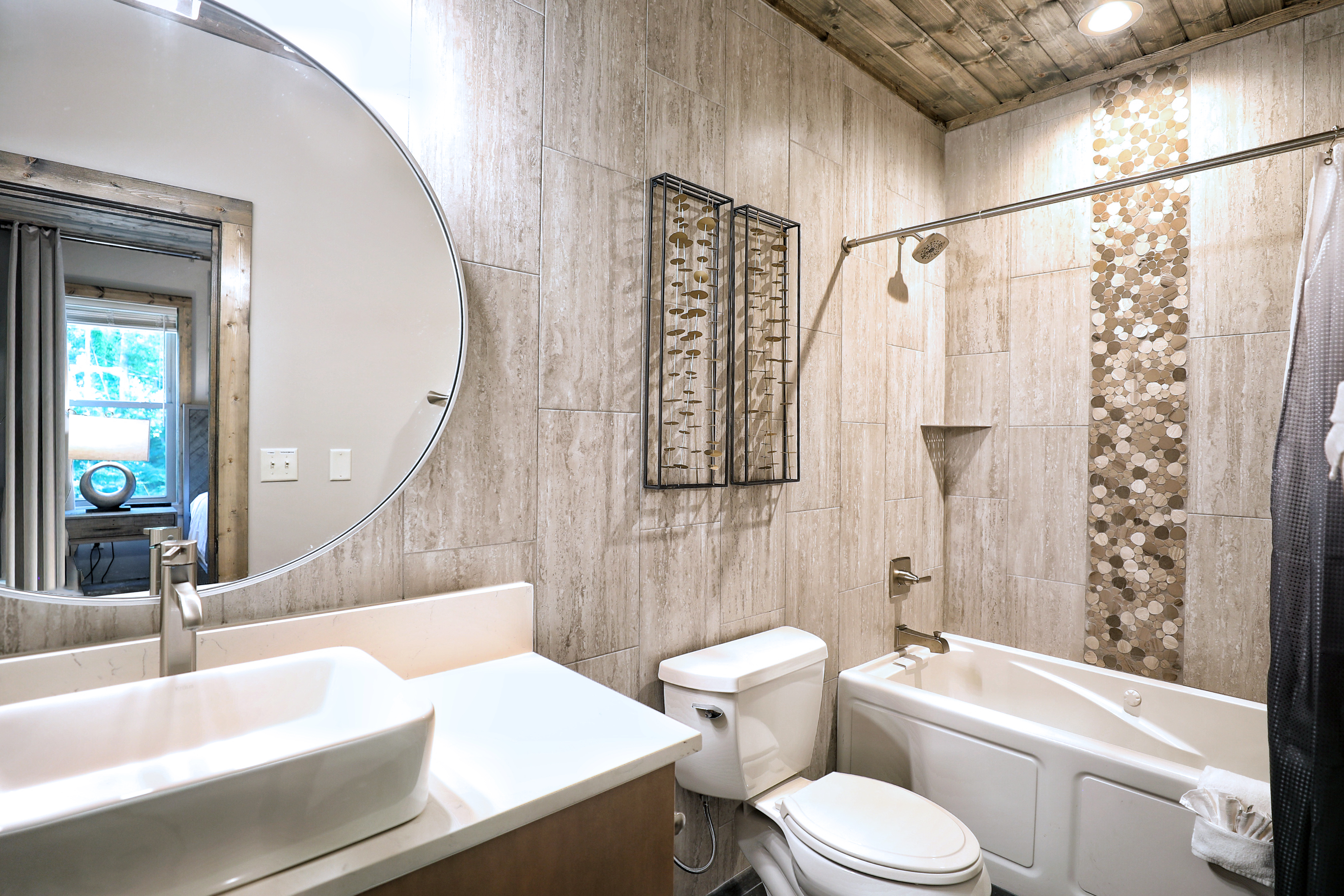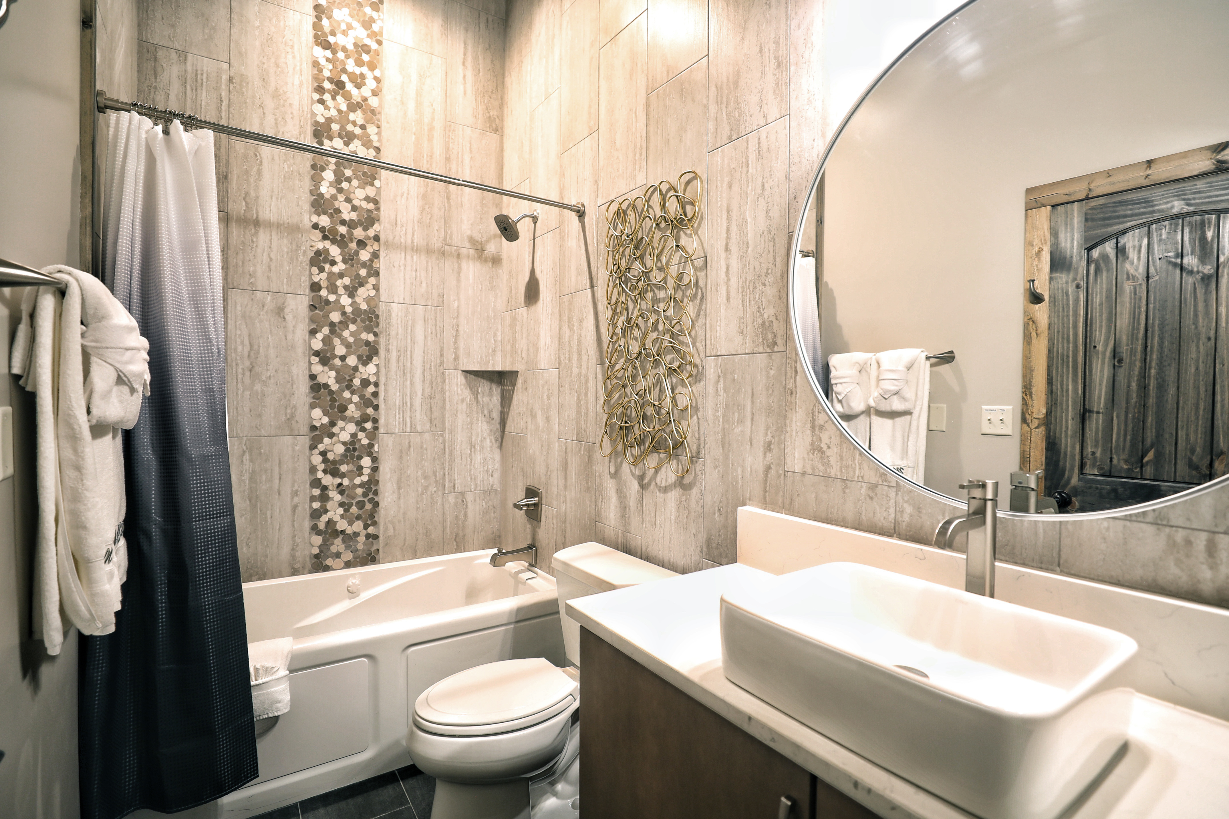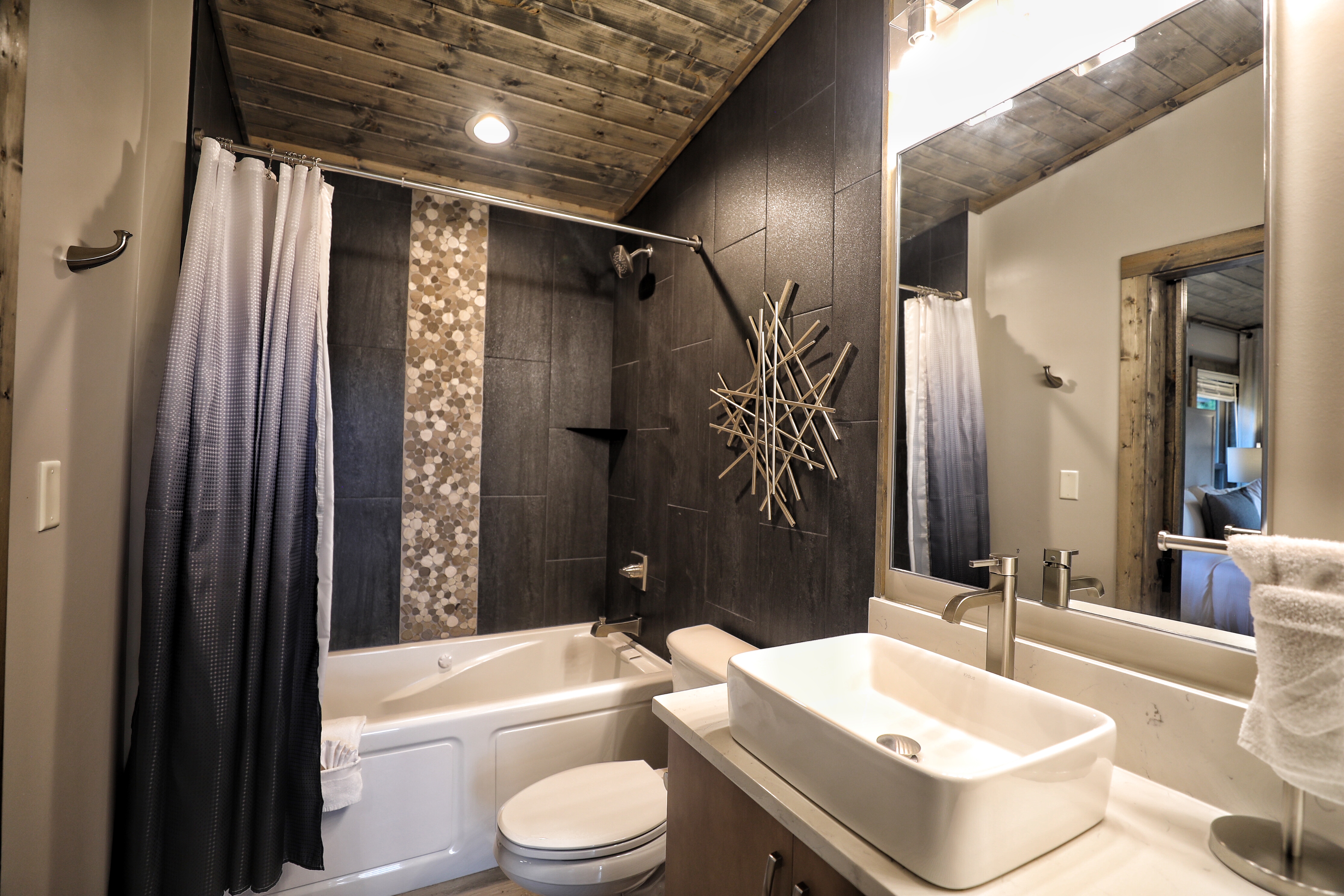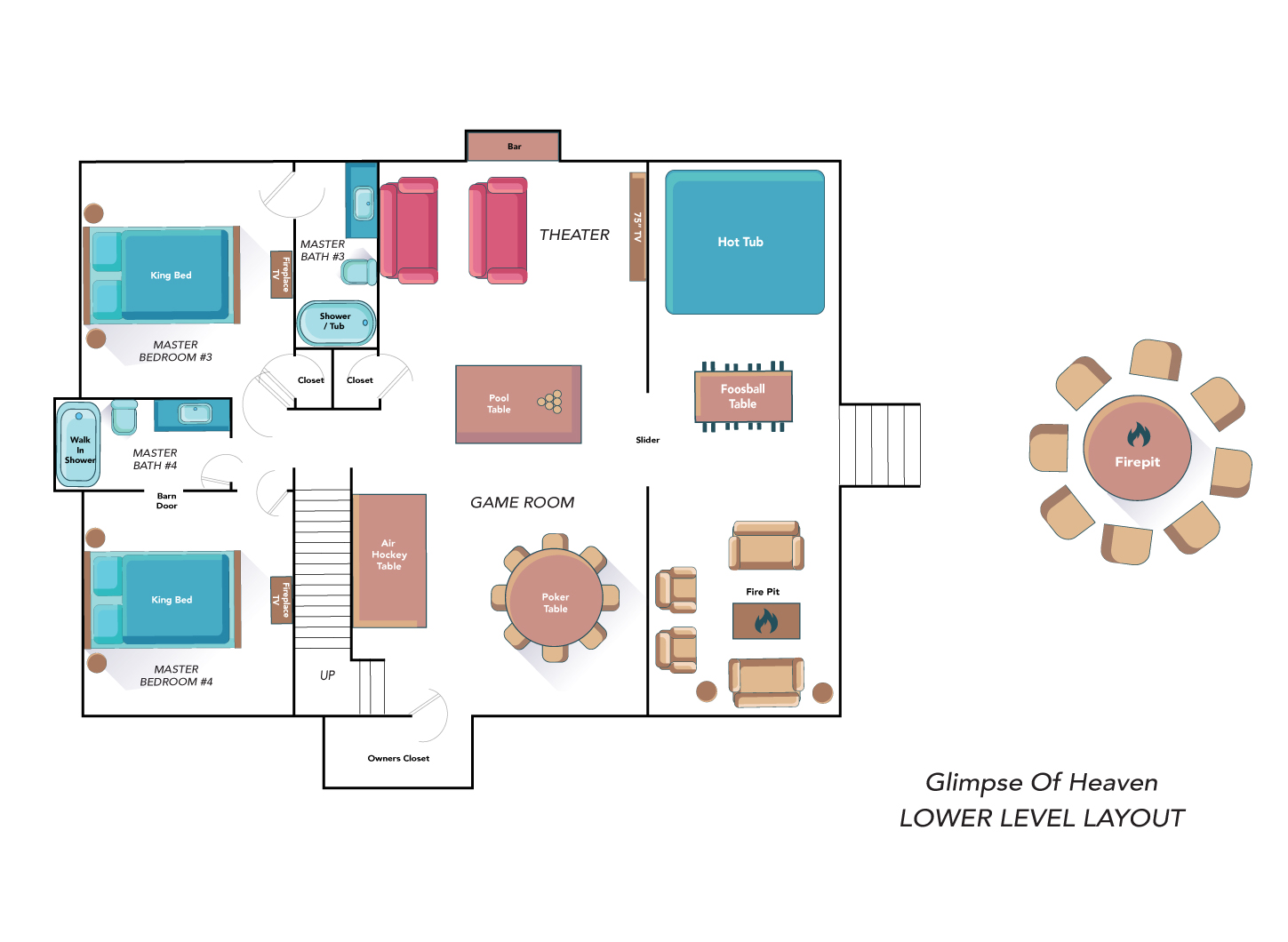 The property was super clean and beautifully decorated with modern decor. The firepit with landscaping out back is so relaxing as is the covered deck with comfy furniture on the lower level with hot tub and gas firepit. We liked that Every bedroom had its own full bath and great system in the theater room with its own mini fridge and plenty of room for pool, poker, or whatever game you chose. Some twists and turns to the property (like most of the properties in this area) but well worth it! After the second day was a breeze.- Sheila