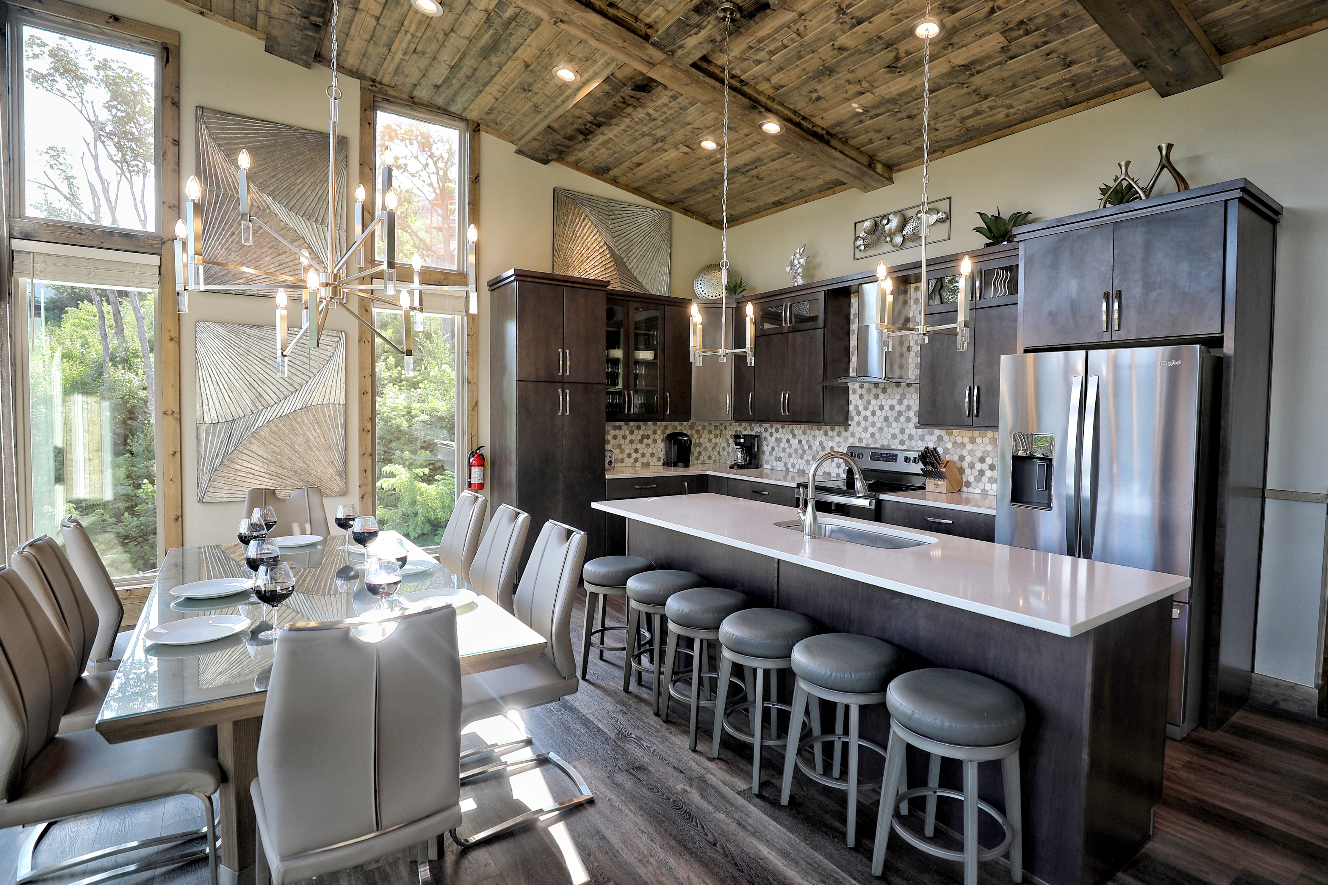 º DINING: Indoor dining for 8, plus outdoor dining table for 8.