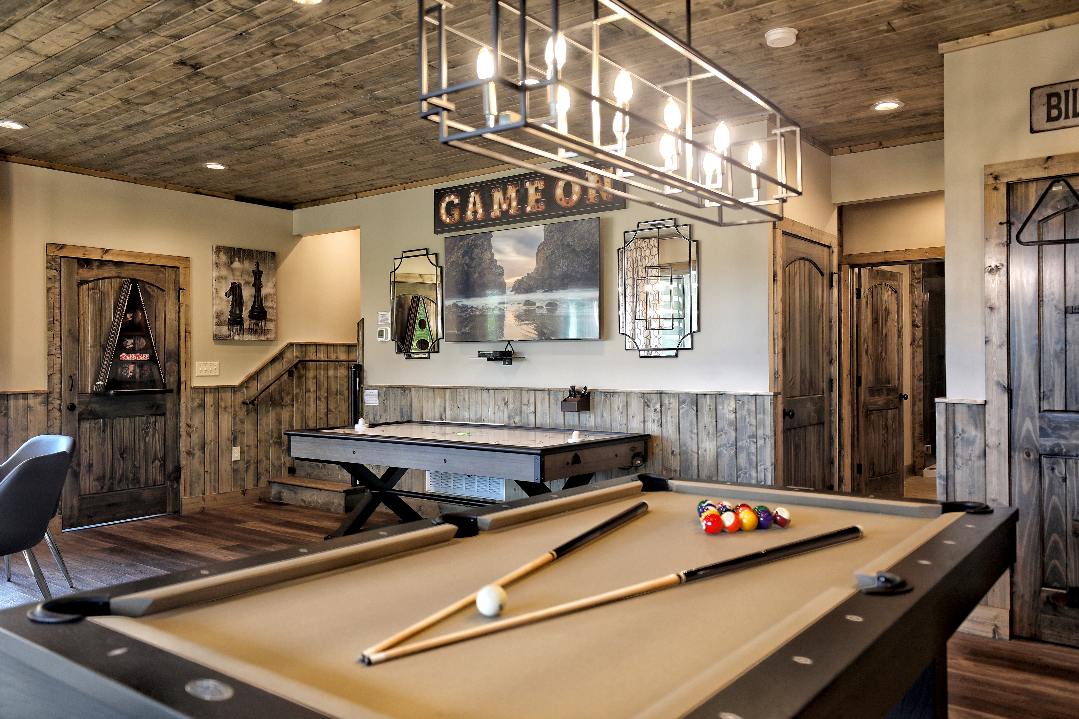 º ENTERTAINMENT: Game room with a poker table, billiards, air hockey, outdoor foosball, theater seating, boss toss, and a selection of board games.