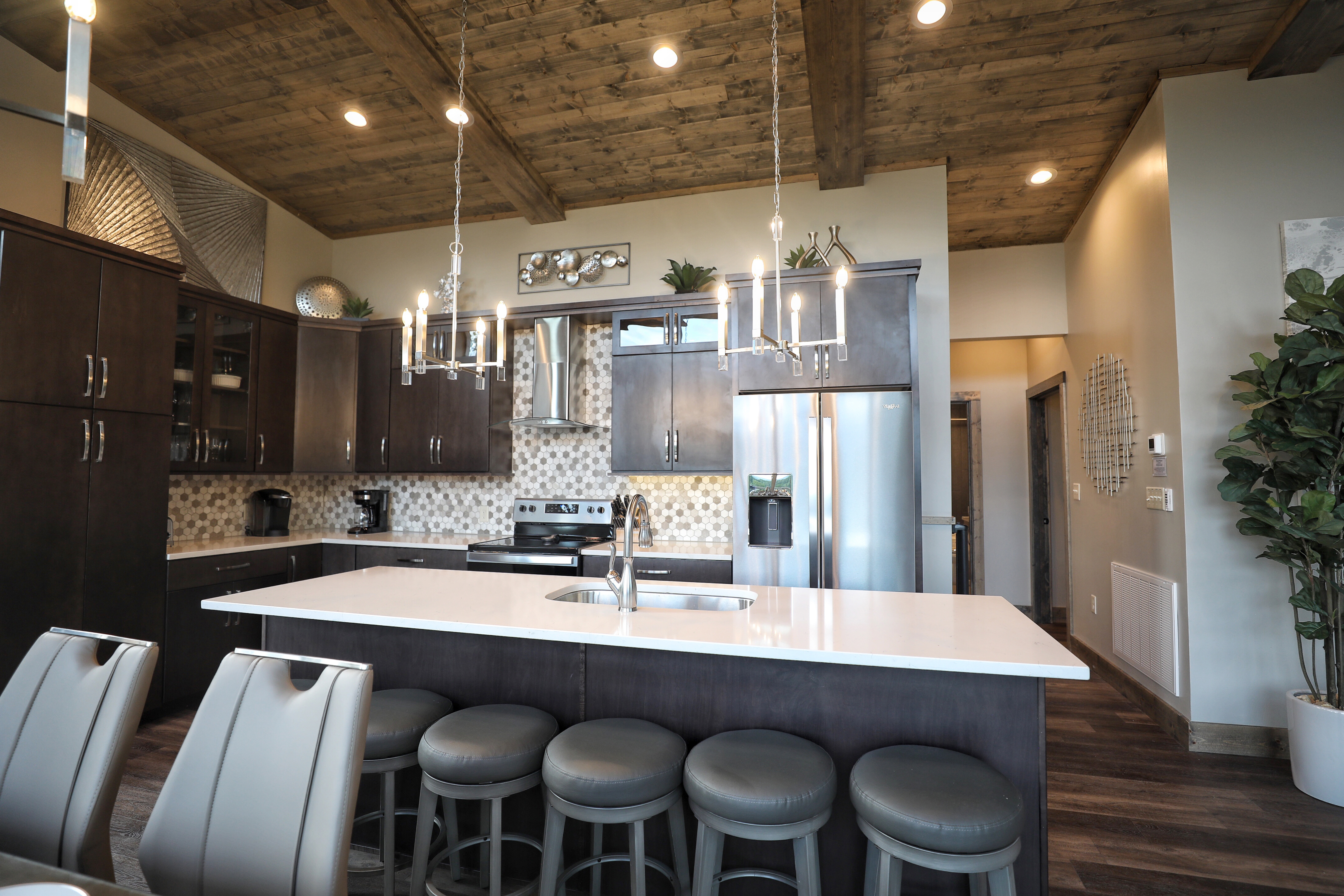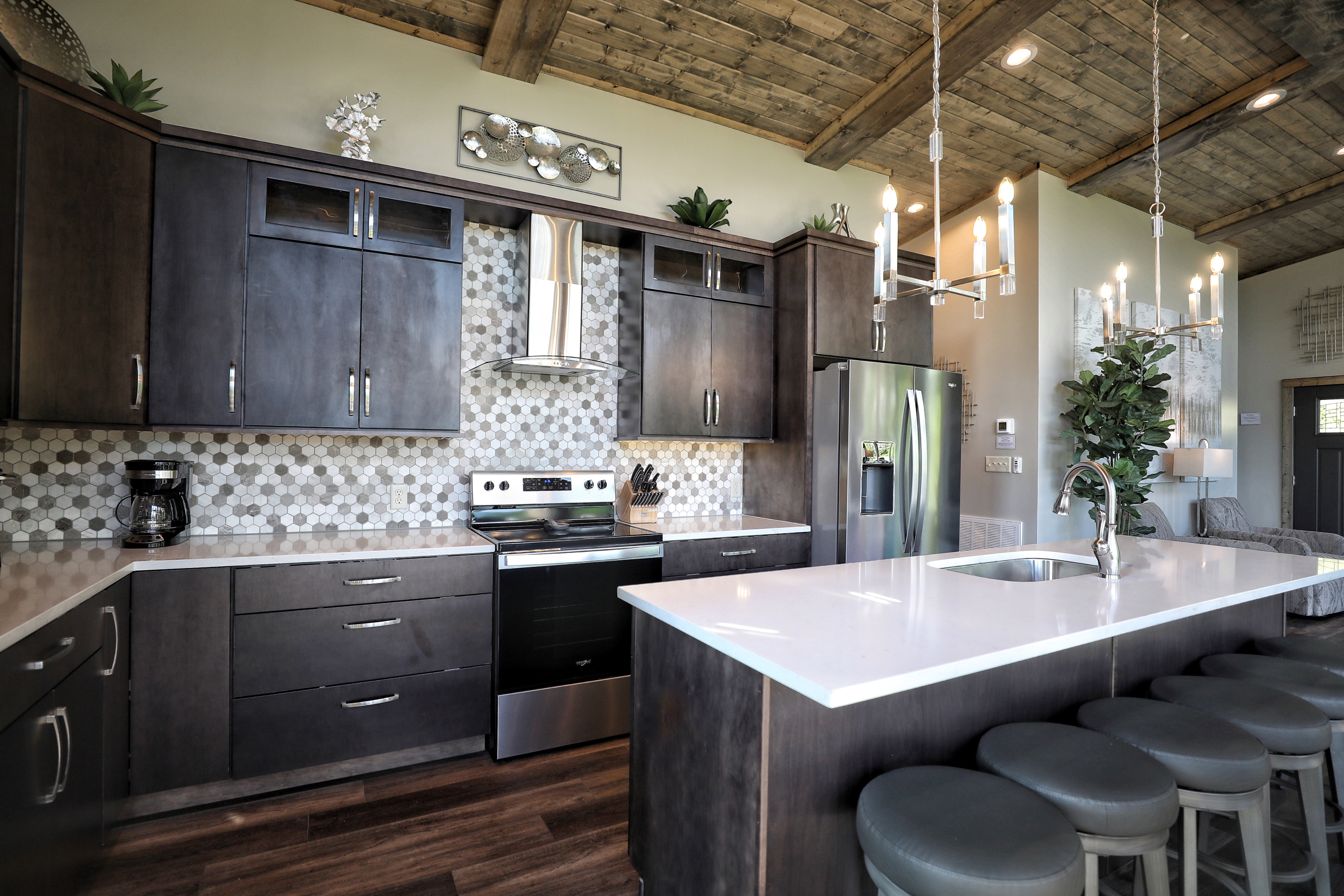 º KITCHEN: Stainless steel appliances including dishwasher, quartz counter tops, fully stocked with standard essentials plus Keurig, traditional coffee maker, griddle, slow cooker, blender, waffle maker and wine glasses.