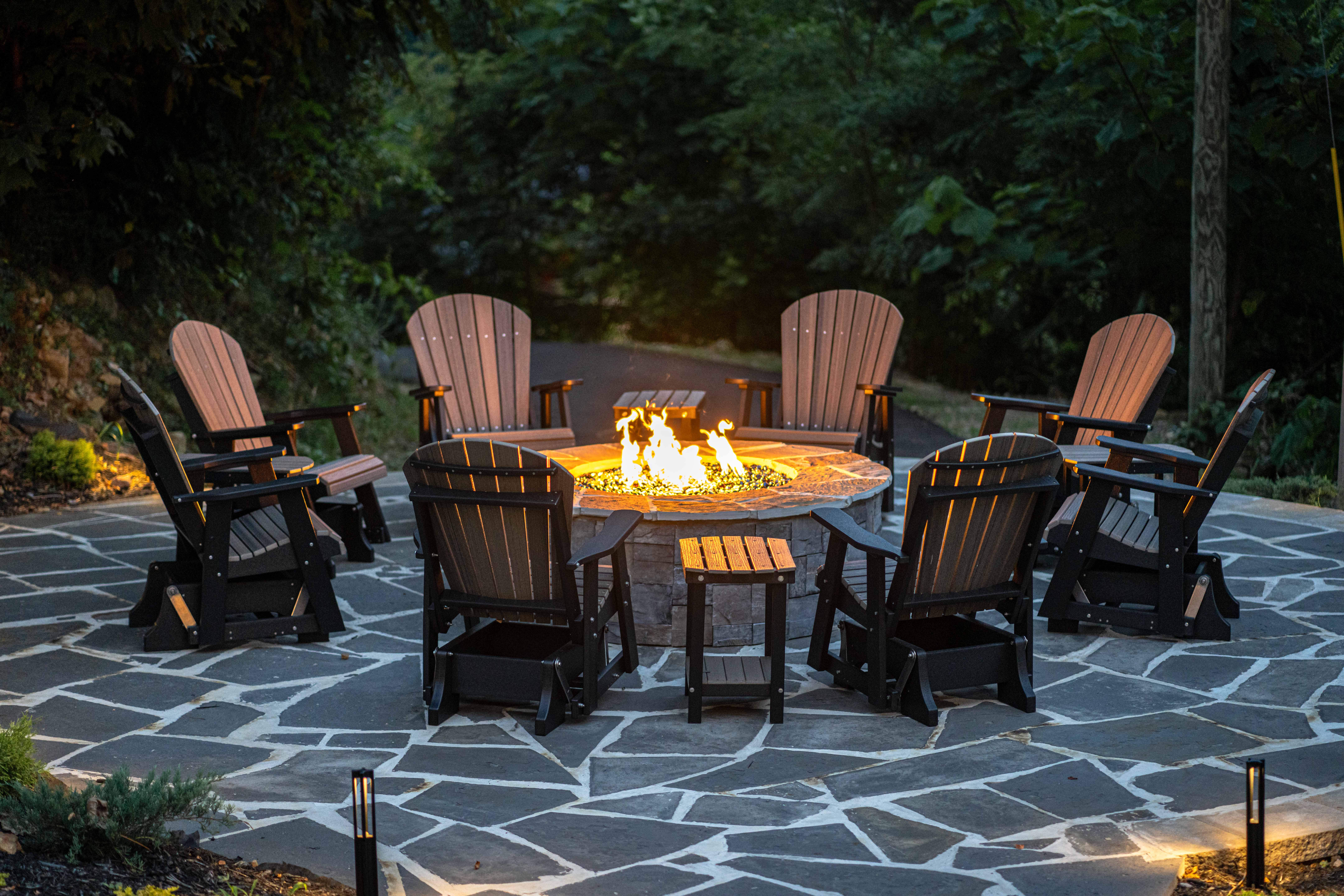 º OUTDOOR SPACES: Expansive decks featuring a hot tub, comfortable seating, alfresco dining table with fire feature, gas grill, 2 fire pits, lounge chairs, and bar top seating. Additionally, there's a third larger fire pit on its own patio with seating for 8.