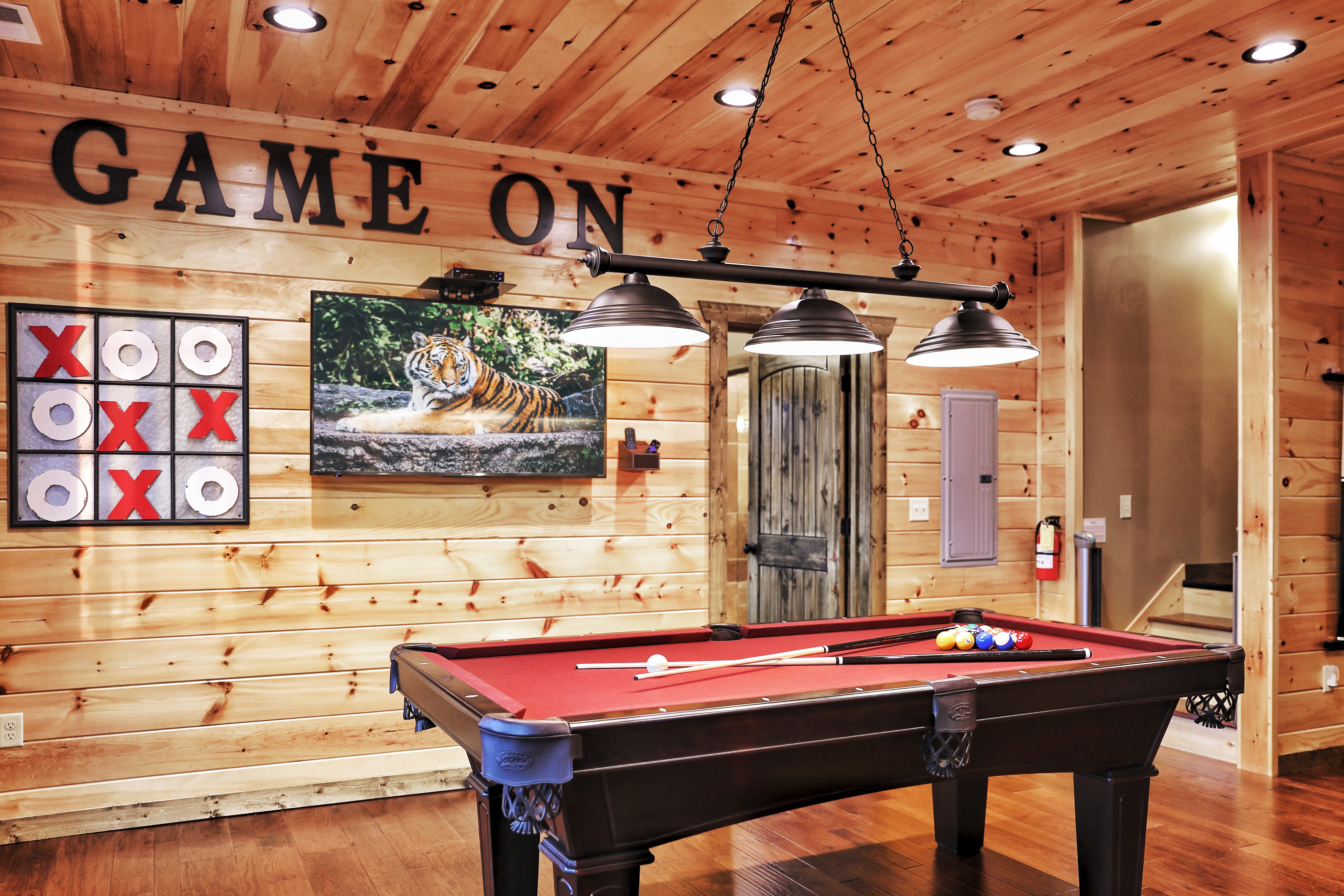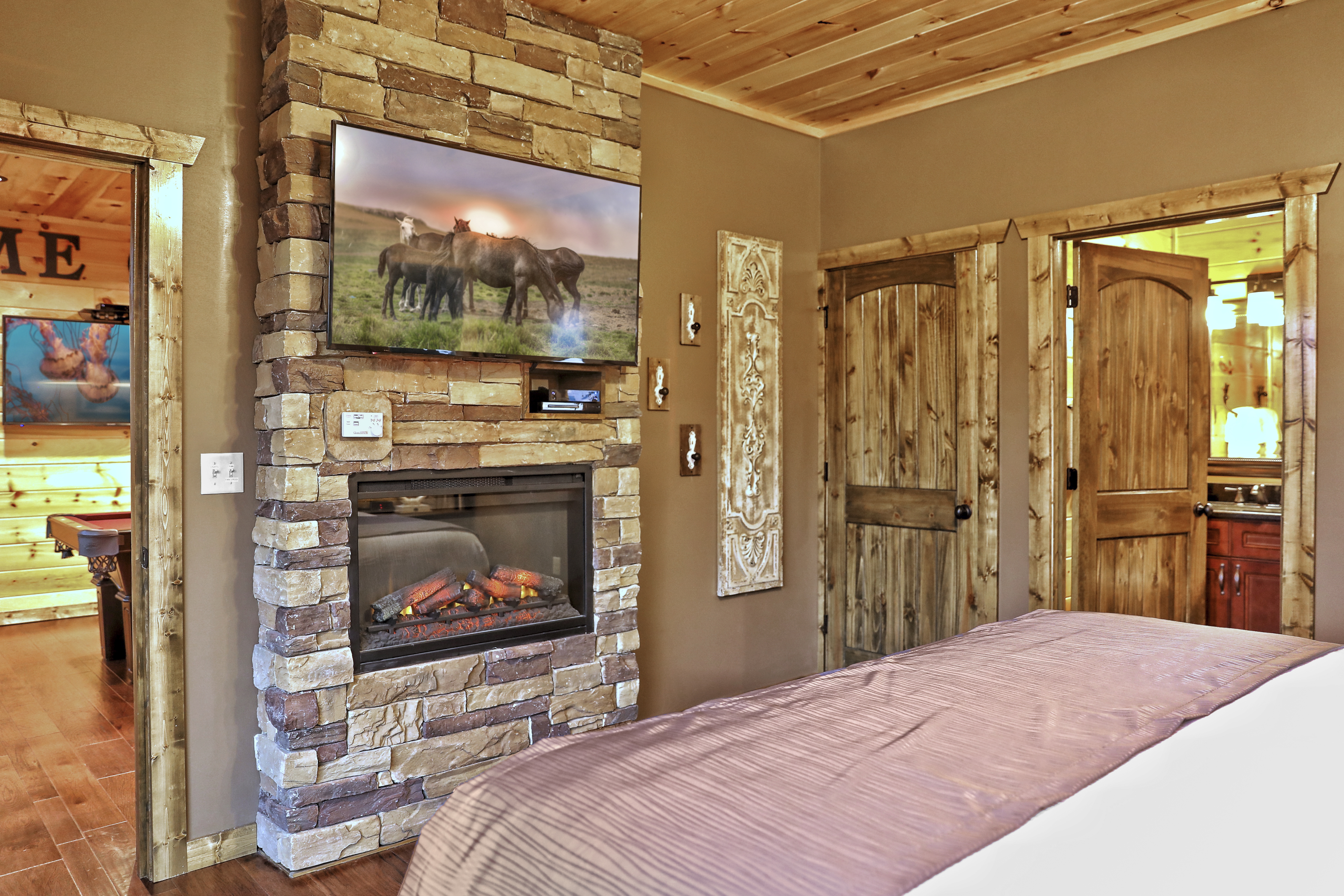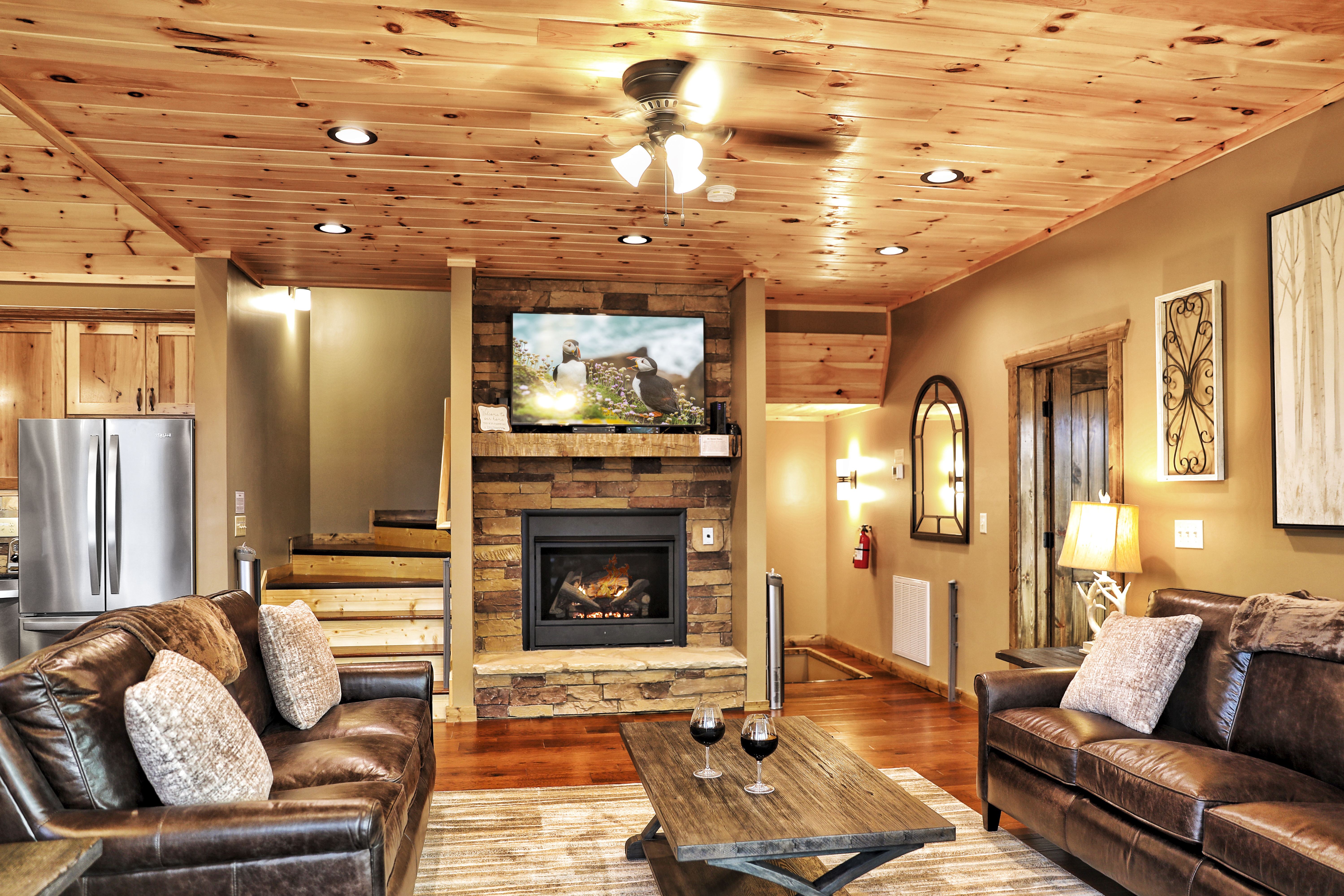 Heaven on the Horizon is a luxurious 4-bedroom cabin that offers a truly unforgettable mountain retreat. With breathtaking panoramic views from all three deck levels, this cabin is designed for ultimate comfort and relaxation. Each bedroom is a private oasis, featuring a king-size bed, master bath, fireplace, flat-screen TV, and stunning mountain vistas. The cabin's spacious interior is bathed in natural light, with floor-to-ceiling windows that showcase million-dollar views. The fully equipped gourmet kitchen invites culinary creativity, while the adjacent dining area comfortably seats eight for memorable meals. Outside, you'll find multiple deck levels perfect for lounging, a gas grill for outdoor cooking, a hot tub, and two fire pits—ideal for cozy evenings under the stars. With a game room featuring a pool table, shuffleboard, and a variety of board games, Heaven on the Horizon offers endless entertainment options for guests of all ages. Whether you're seeking a peaceful escape or a luxurious mountain experience, this cabin has it all.