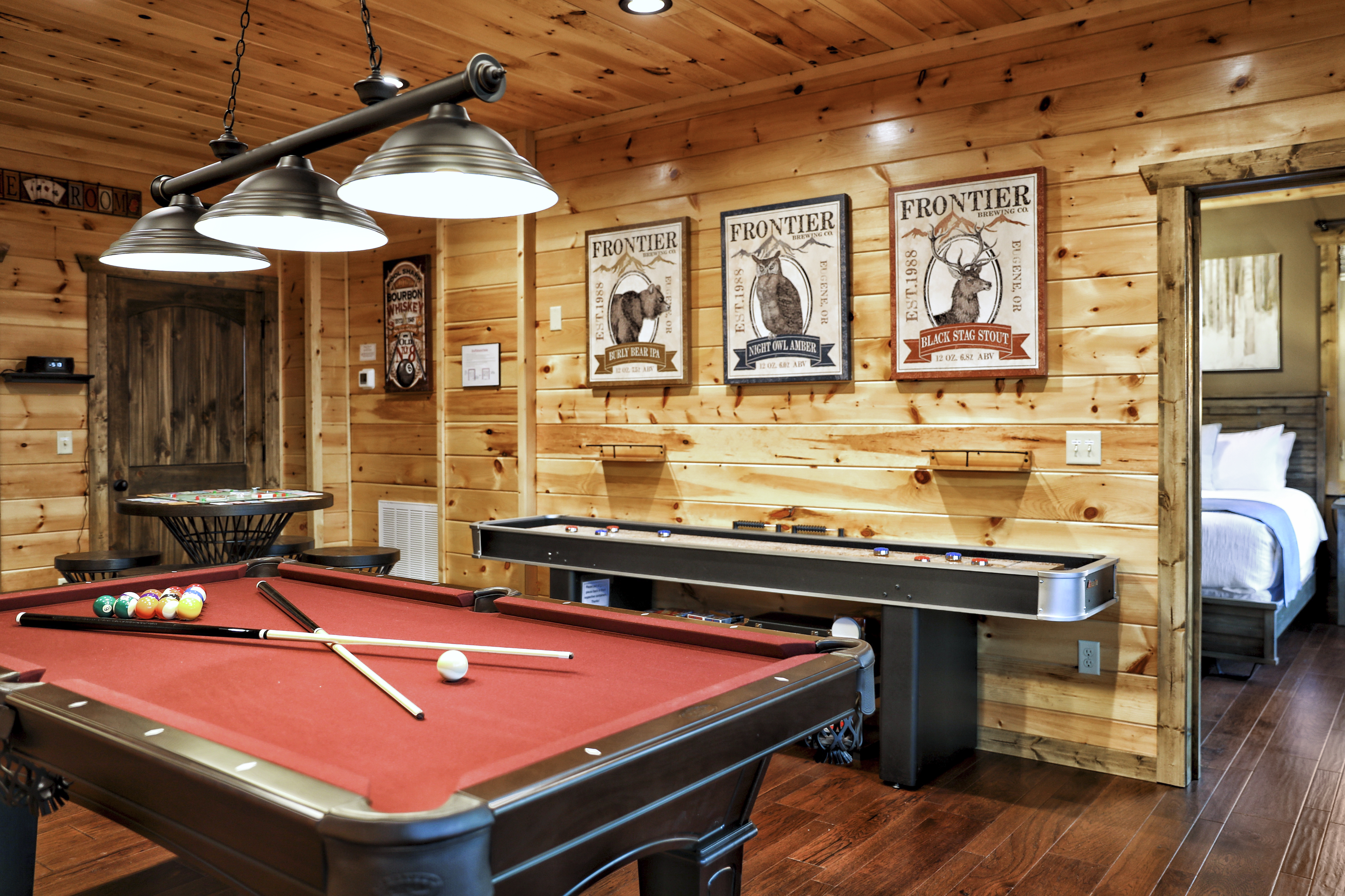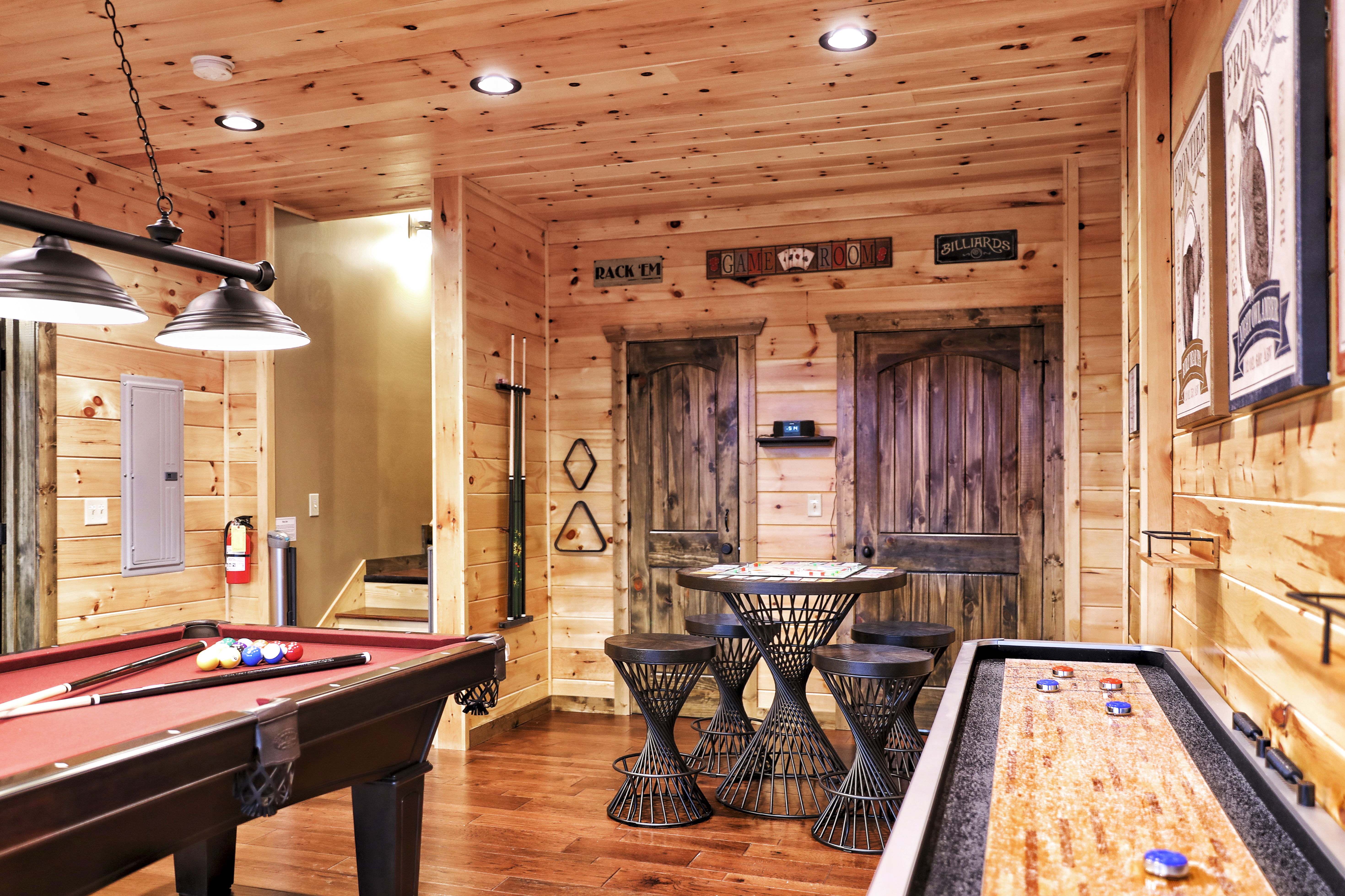 º ENTERTAINMENT: Game room with a poker table, billiards, shuffleboard, and a selection of board games.