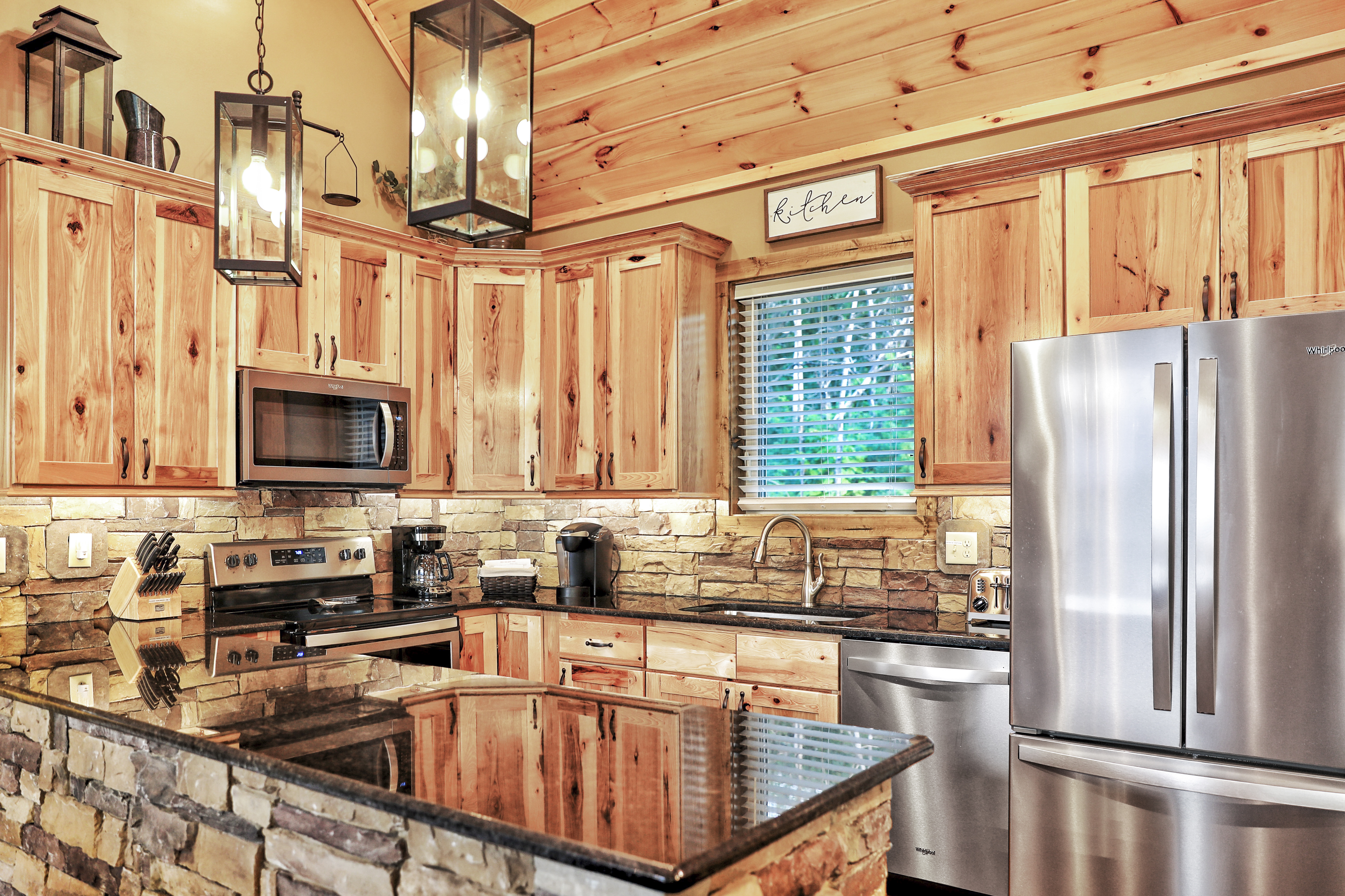 º KITCHEN: Stainless steel appliances including dishwasher, granite counter tops, fully stocked with standard essentials plus Keurig, traditional coffee maker, griddle, slow cooker, blender, waffle maker and wine glasses.