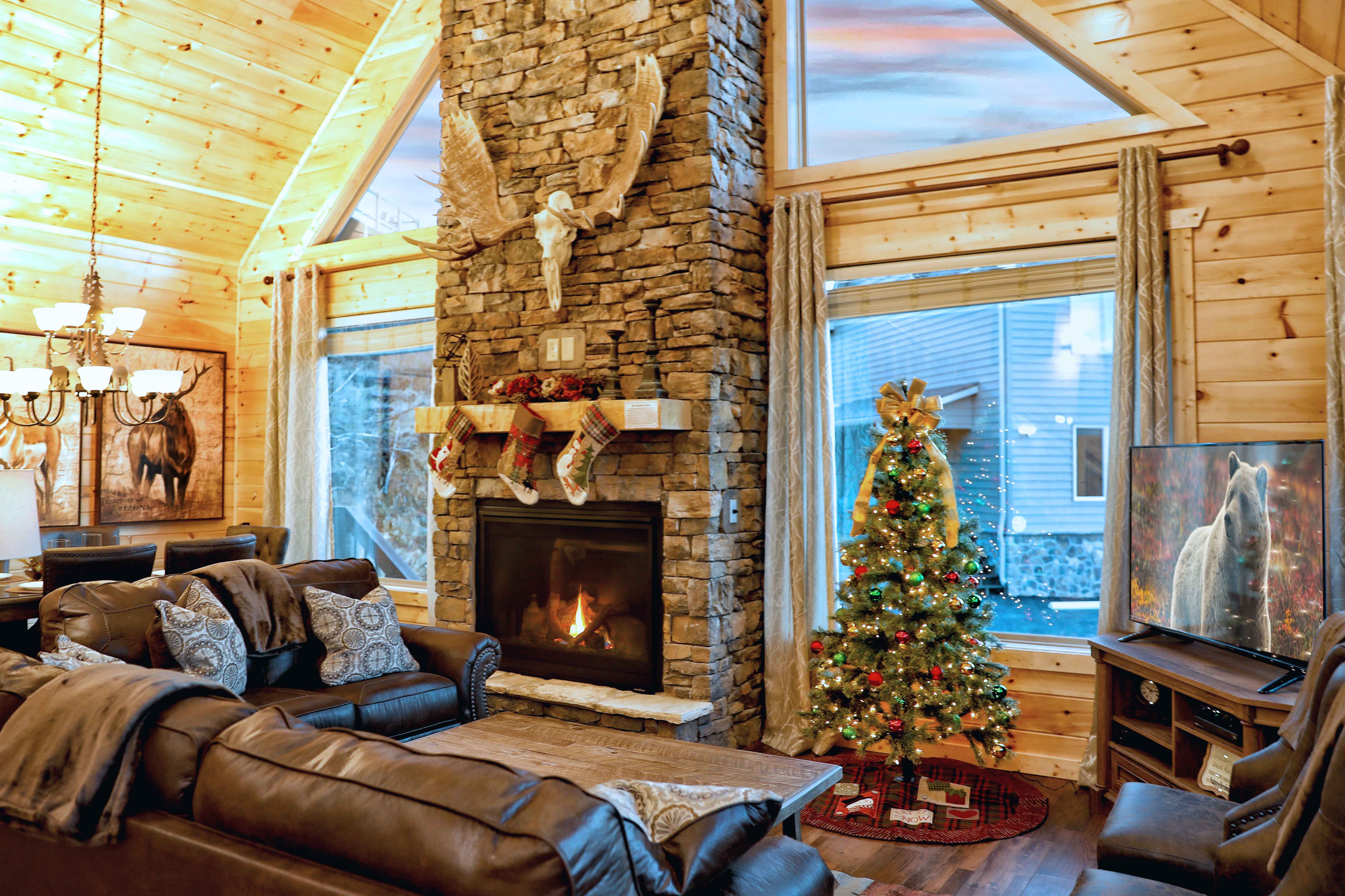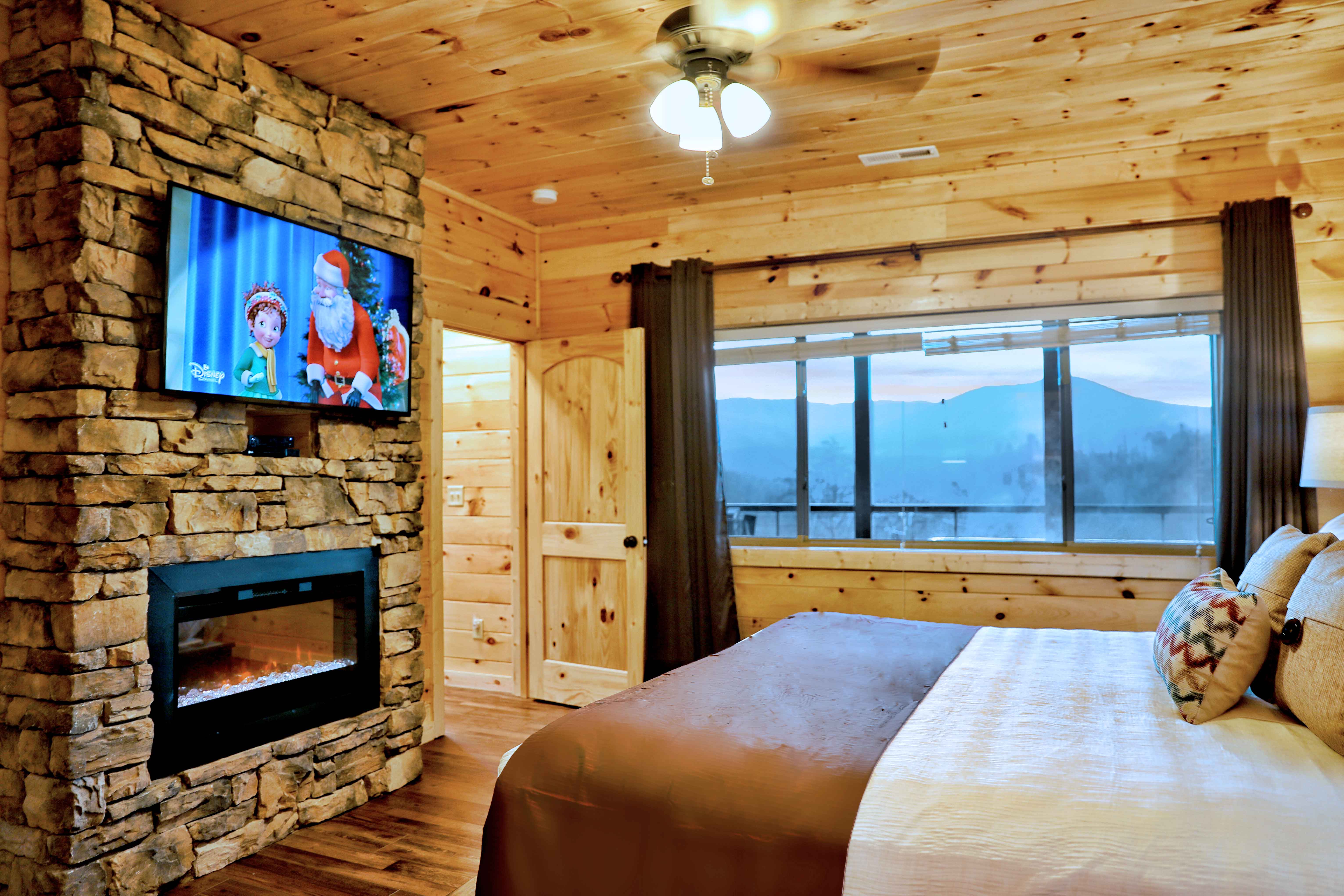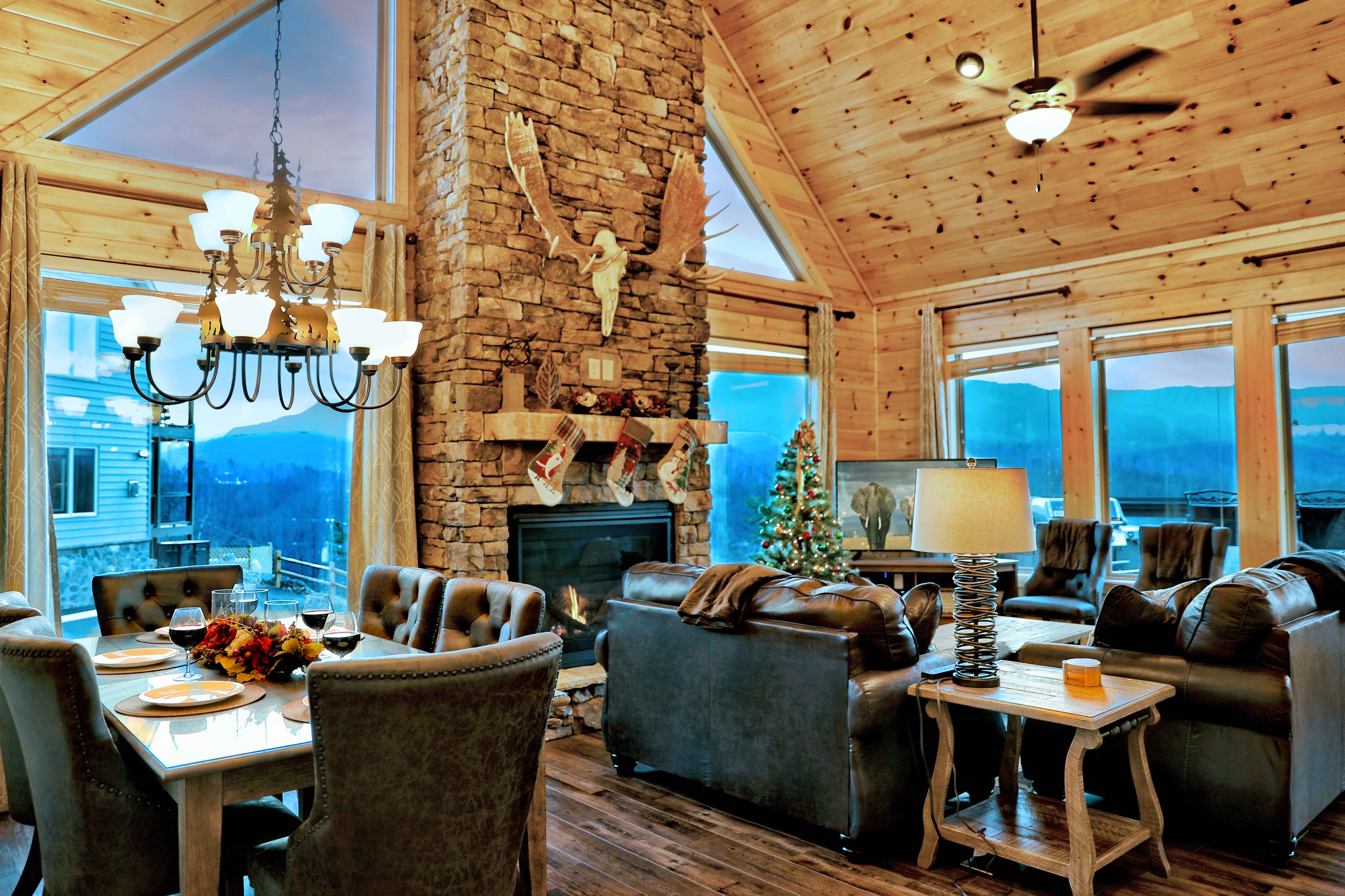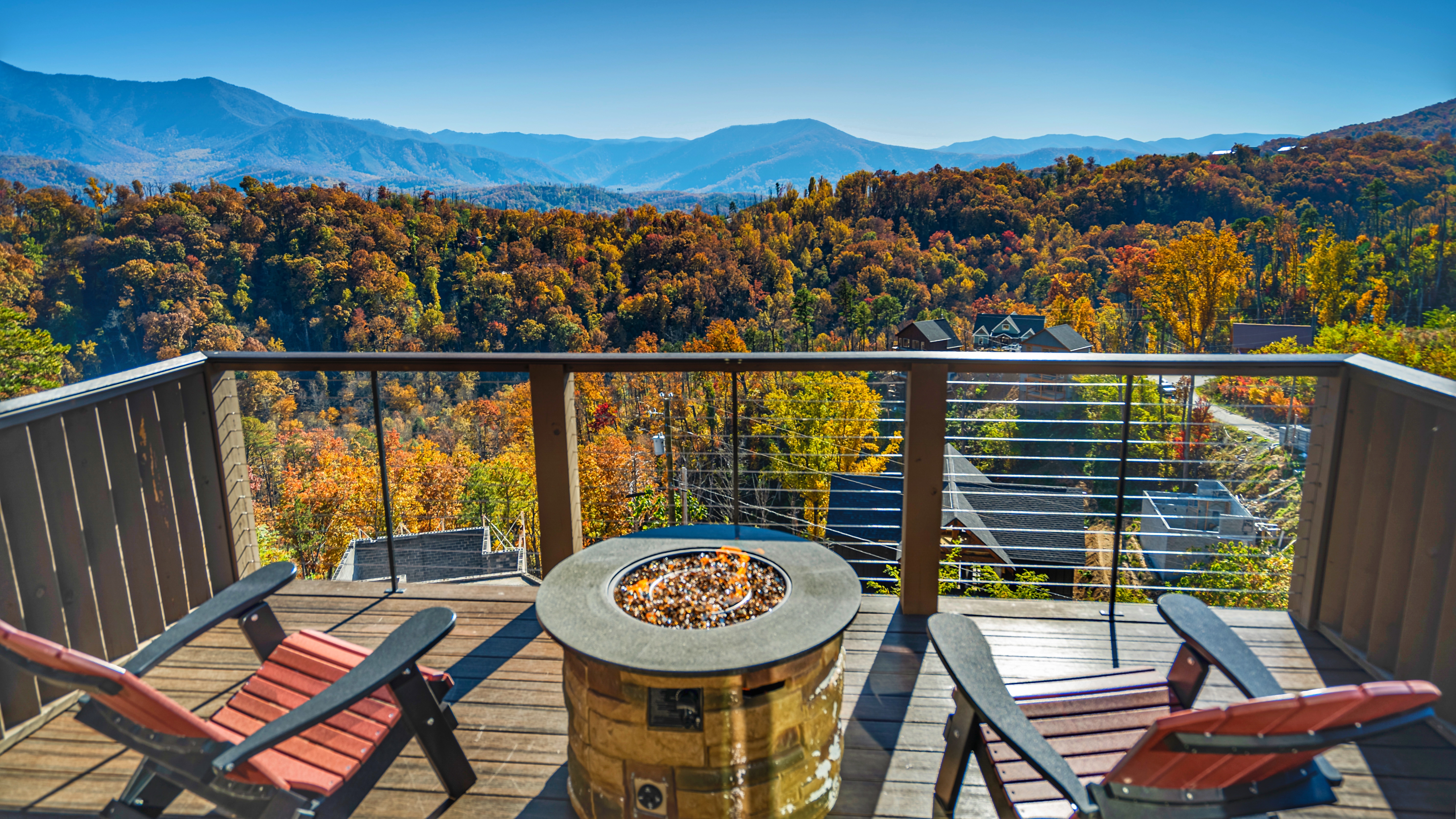 Heaven's Hangout is a stunning Gatlinburg cabin offering unobstructed views of the Smoky Mountains, featuring Mt. LeConte, from all three deck levels. Perfect for relaxation, romance, and fun, each bedroom features a king-size bed, ensuite bath, a cozy fireplace, and direct deck access with stunning views. The cabin's main floor boasts a floor-to-ceiling wood-burning fireplace and large windows that flood the space with natural light. With comfortable furnishings, a gourmet kitchen, and outdoor amenities like a hot tub, fire pits, and a gas grill, this cabin is designed for both comfort and adventure. Entertainment options include a game room with a pool table, shuffleboard, arcade, and more. Just minutes from Gatlinburg and Pigeon Forge, Heaven's Hangout is your ideal mountain getaway.