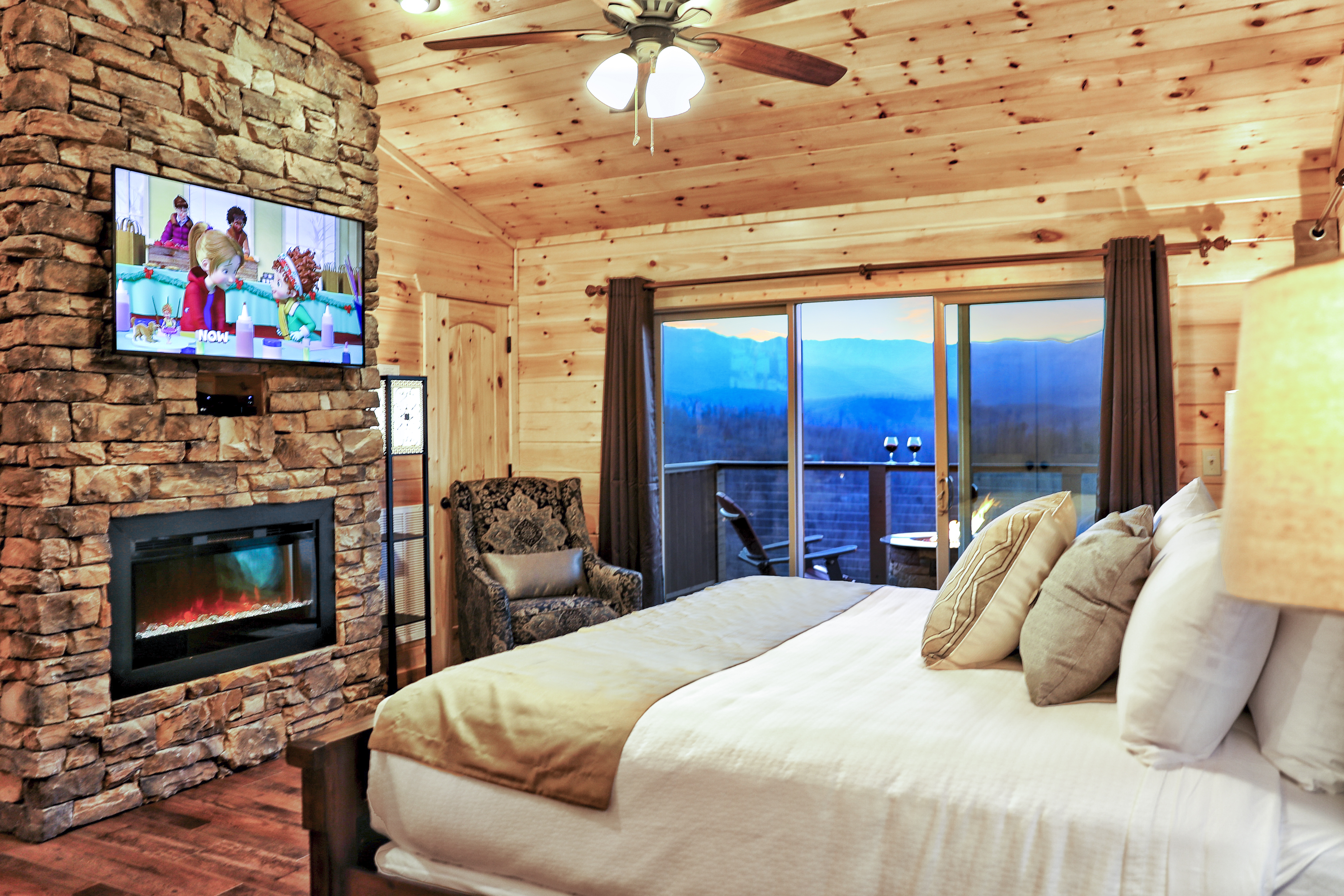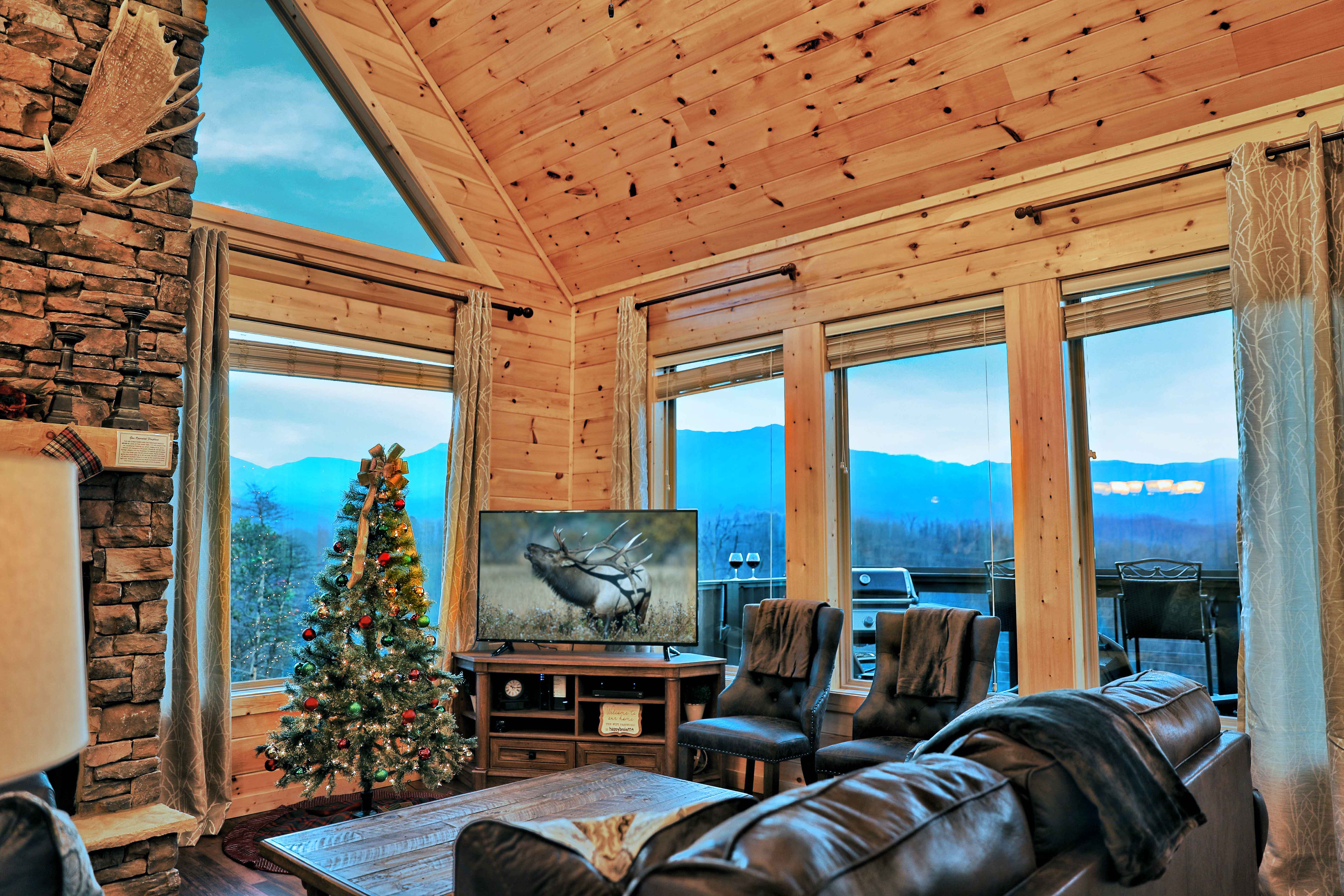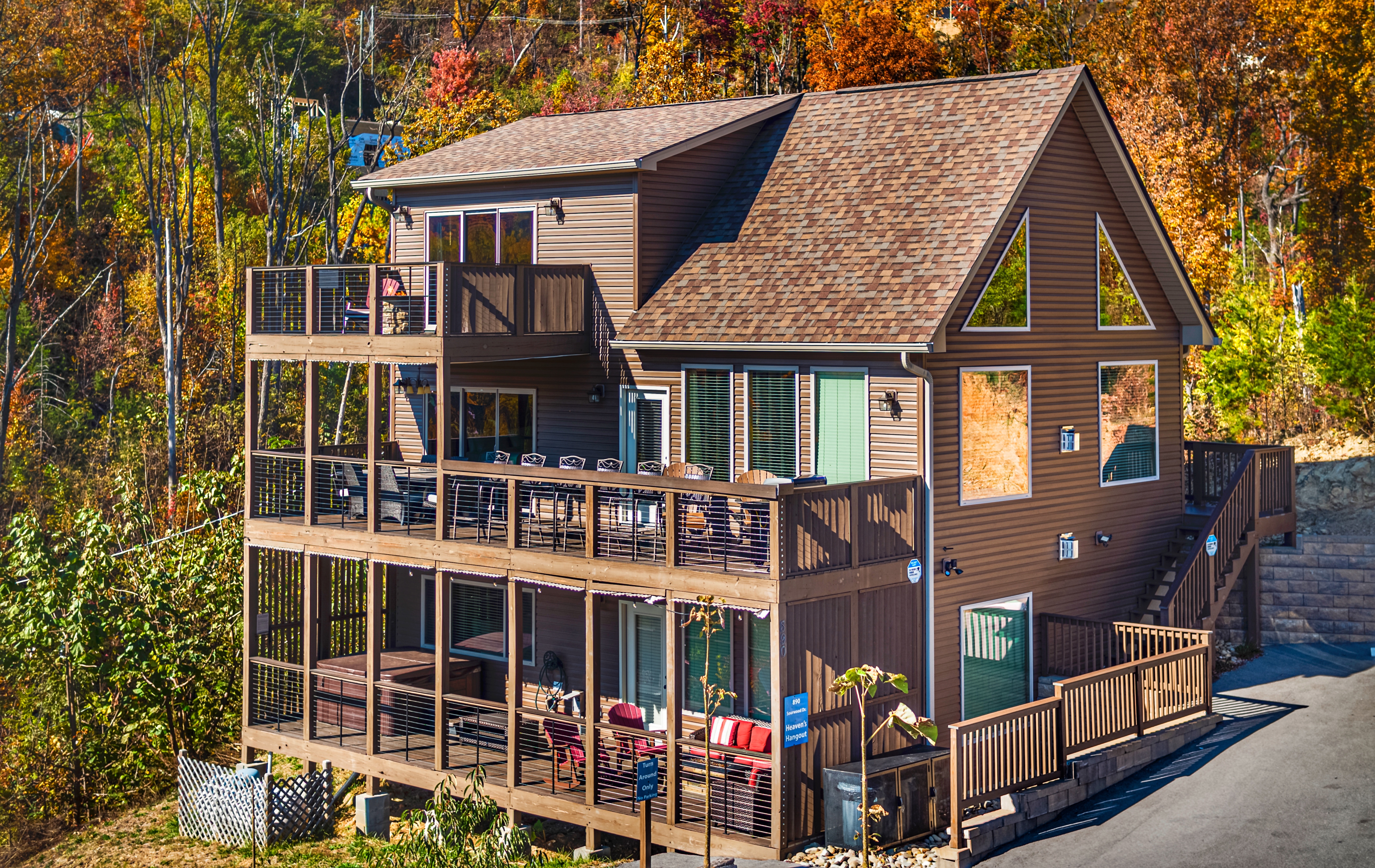 Heaven's Hangout is a stunning Gatlinburg cabin offering unobstructed views of the Smoky Mountains, featuring Mt. LeConte, from all three deck levels. Perfect for relaxation, romance, and fun, each bedroom features a king-size bed, ensuite bath, a cozy fireplace, and direct deck access with stunning views. The cabin's main floor boasts a floor-to-ceiling wood-burning fireplace and large windows that flood the space with natural light. With comfortable furnishings, a gourmet kitchen, and outdoor amenities like a hot tub, fire pits, and a gas grill, this cabin is designed for both comfort and adventure. Entertainment options include a game room with a pool table, shuffleboard, arcade, and more. Just minutes from Gatlinburg and Pigeon Forge, Heaven's Hangout is your ideal mountain getaway.