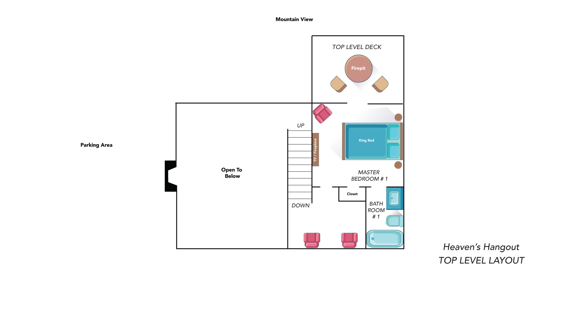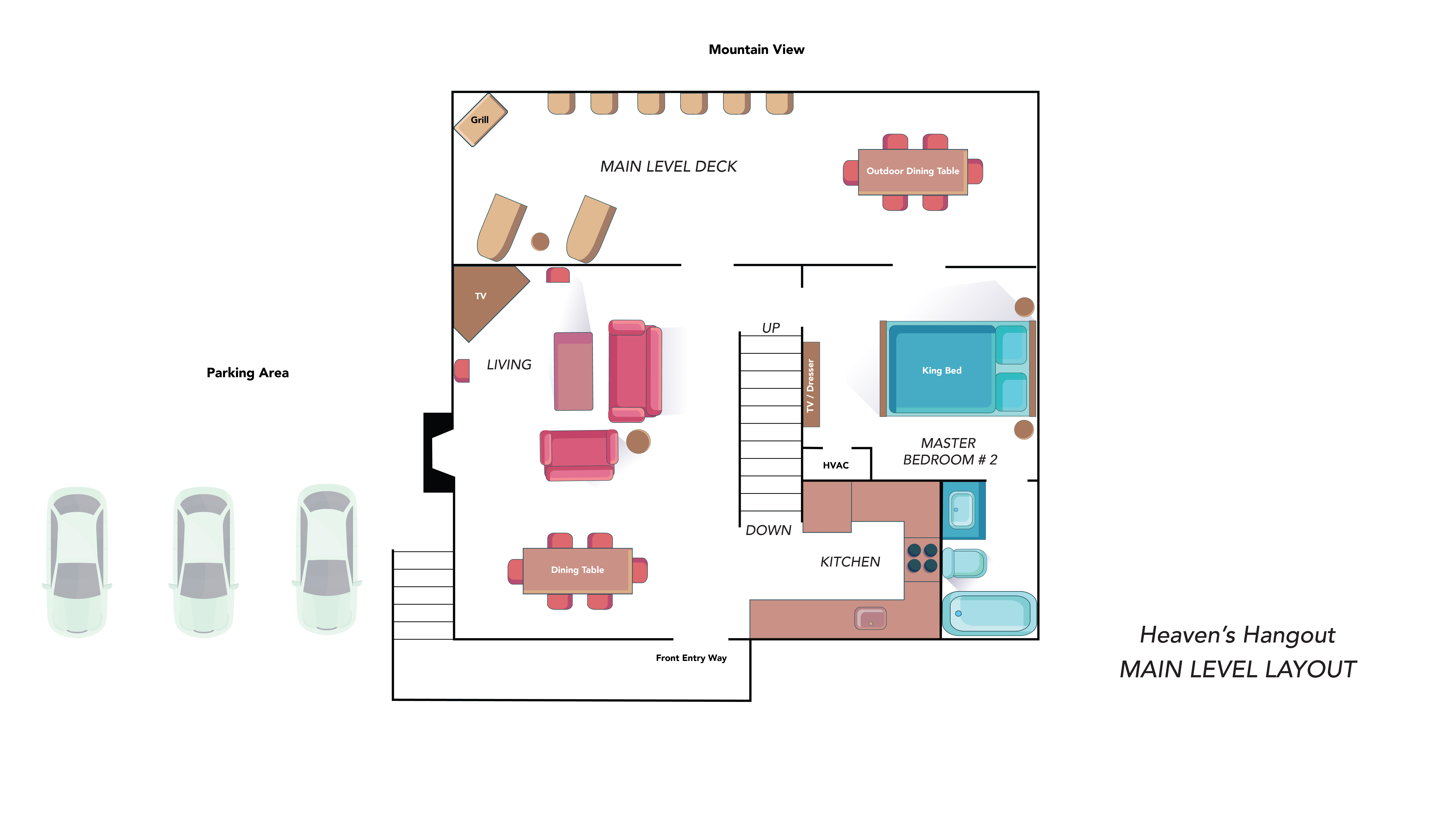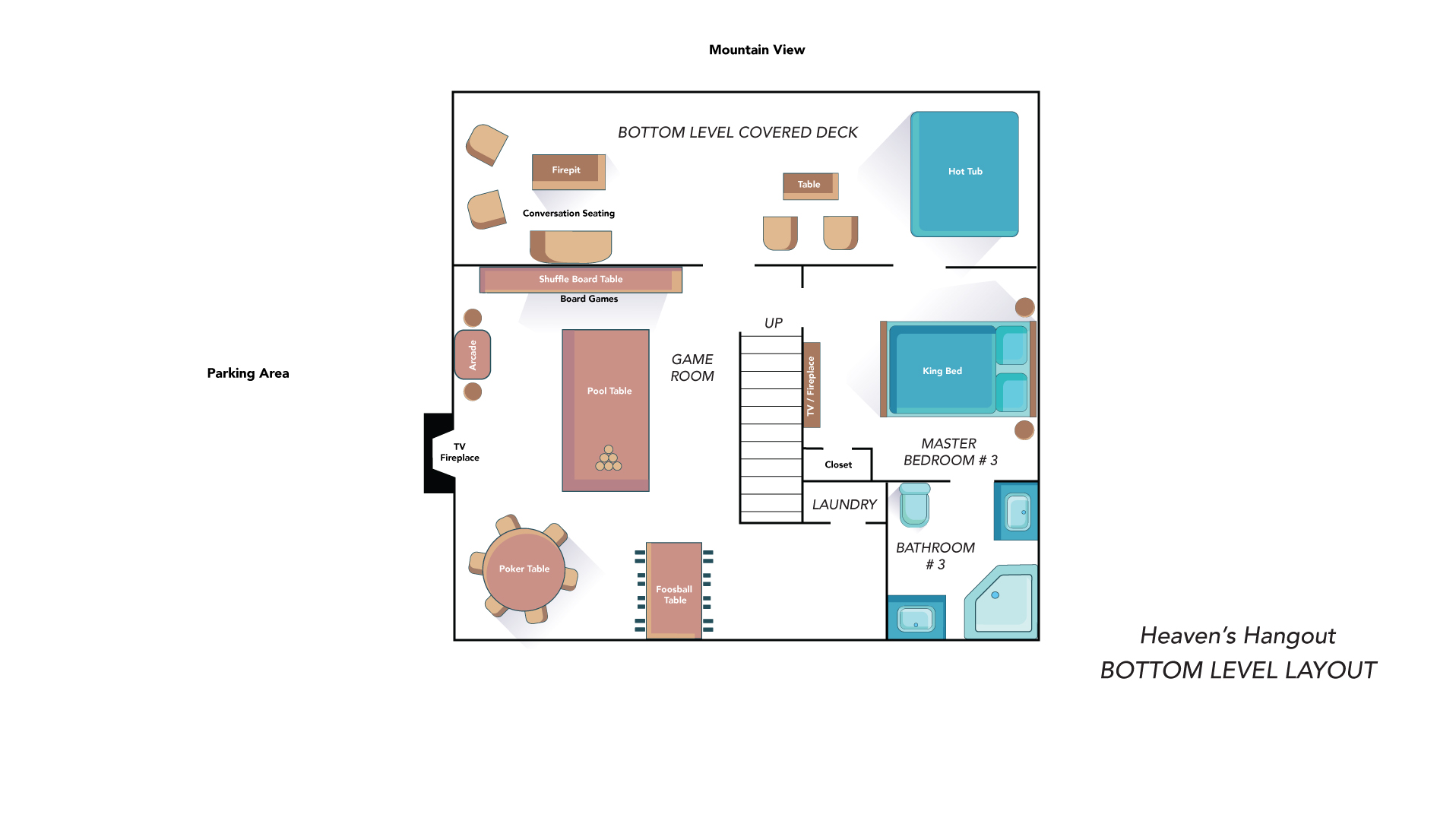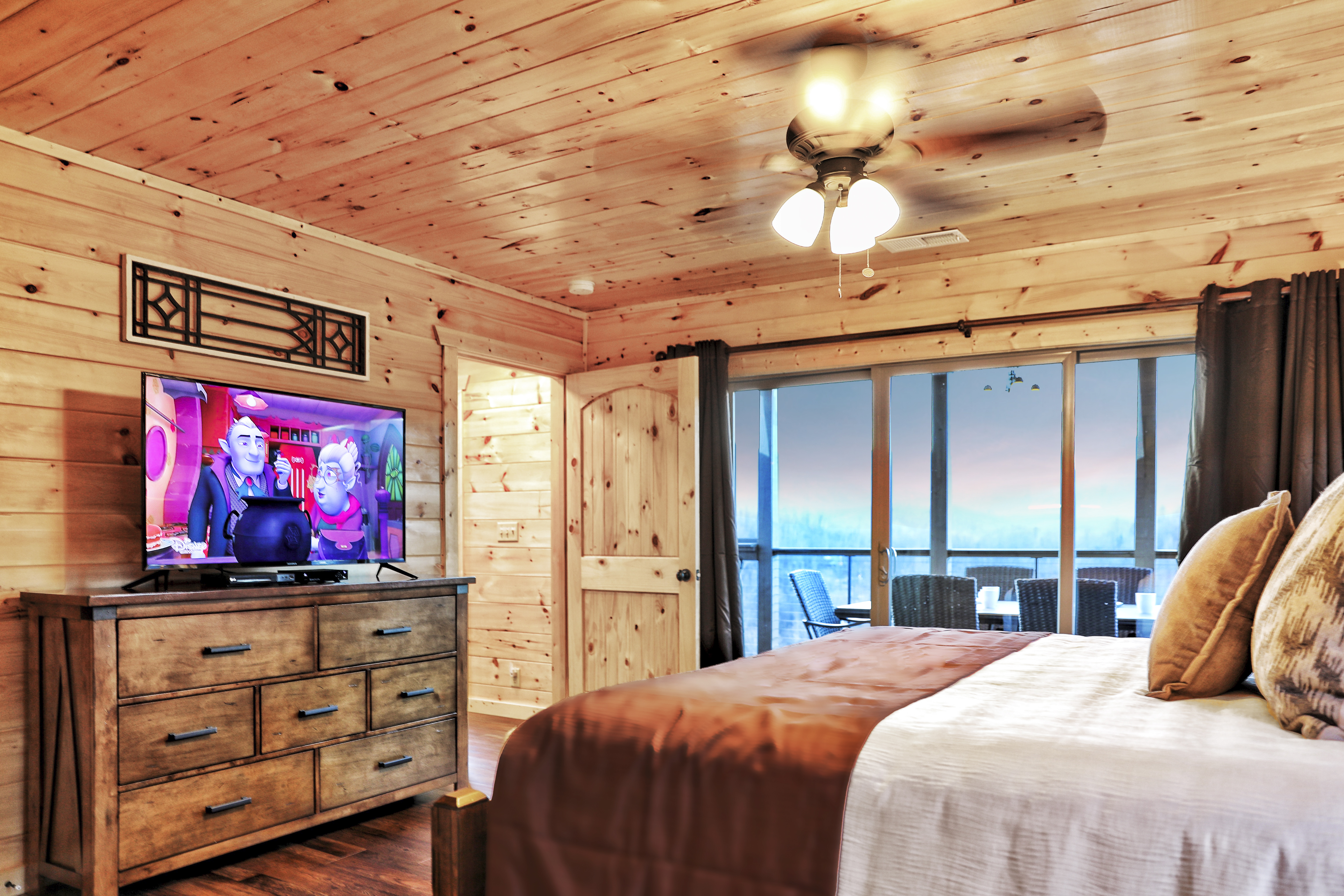 Heaven's Hangout is a stunning Gatlinburg cabin offering unobstructed views of the Smoky Mountains, featuring Mt. LeConte, from all three deck levels. Perfect for relaxation, romance, and fun, each bedroom features a king-size bed, ensuite bath, a cozy fireplace, and direct deck access with stunning views. The cabin's main floor boasts a floor-to-ceiling wood-burning fireplace and large windows that flood the space with natural light. With comfortable furnishings, a gourmet kitchen, and outdoor amenities like a hot tub, fire pits, and a gas grill, this cabin is designed for both comfort and adventure. Entertainment options include a game room with a pool table, shuffleboard, arcade, and more. Just minutes from Gatlinburg and Pigeon Forge, Heaven's Hangout is your ideal mountain getaway.
