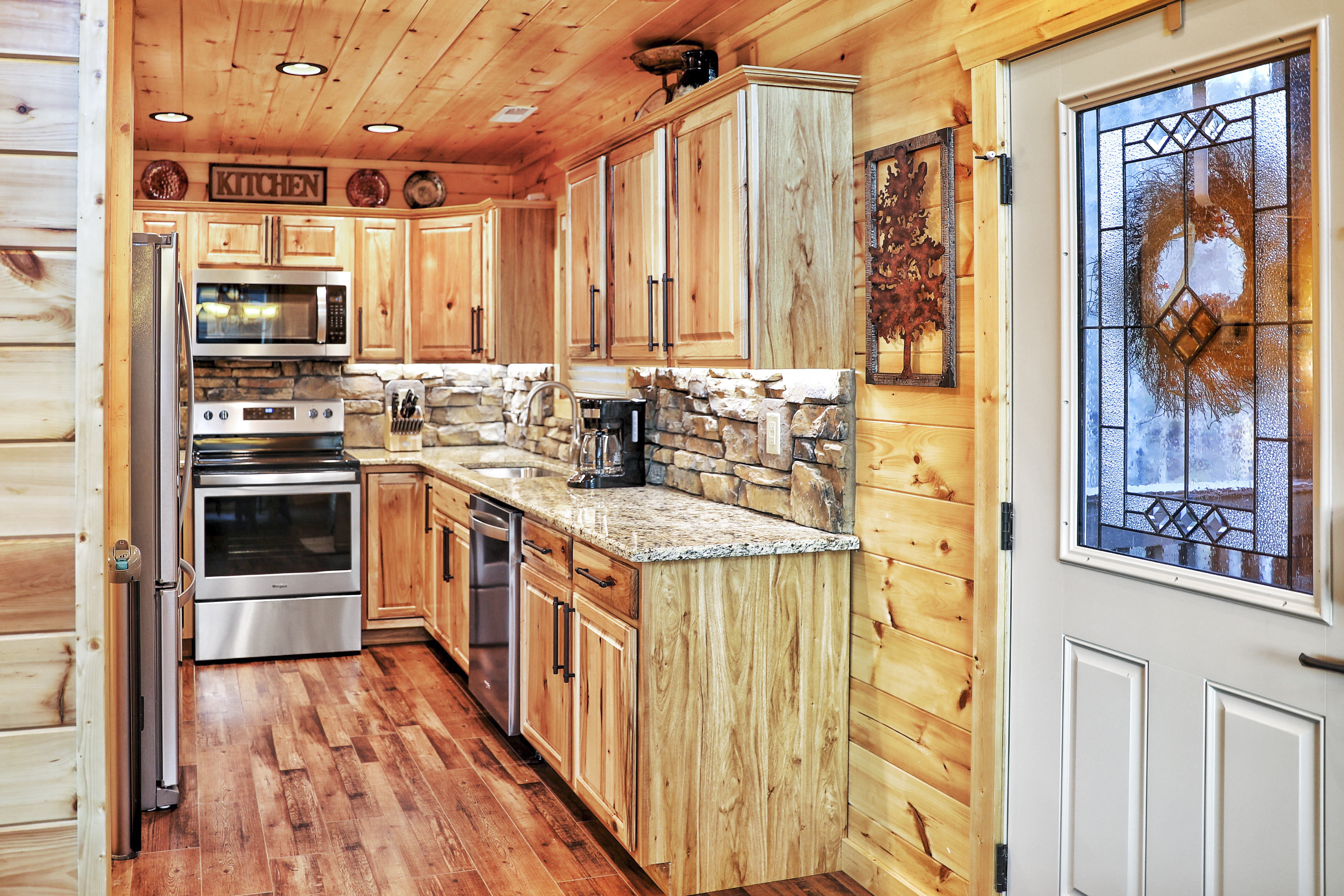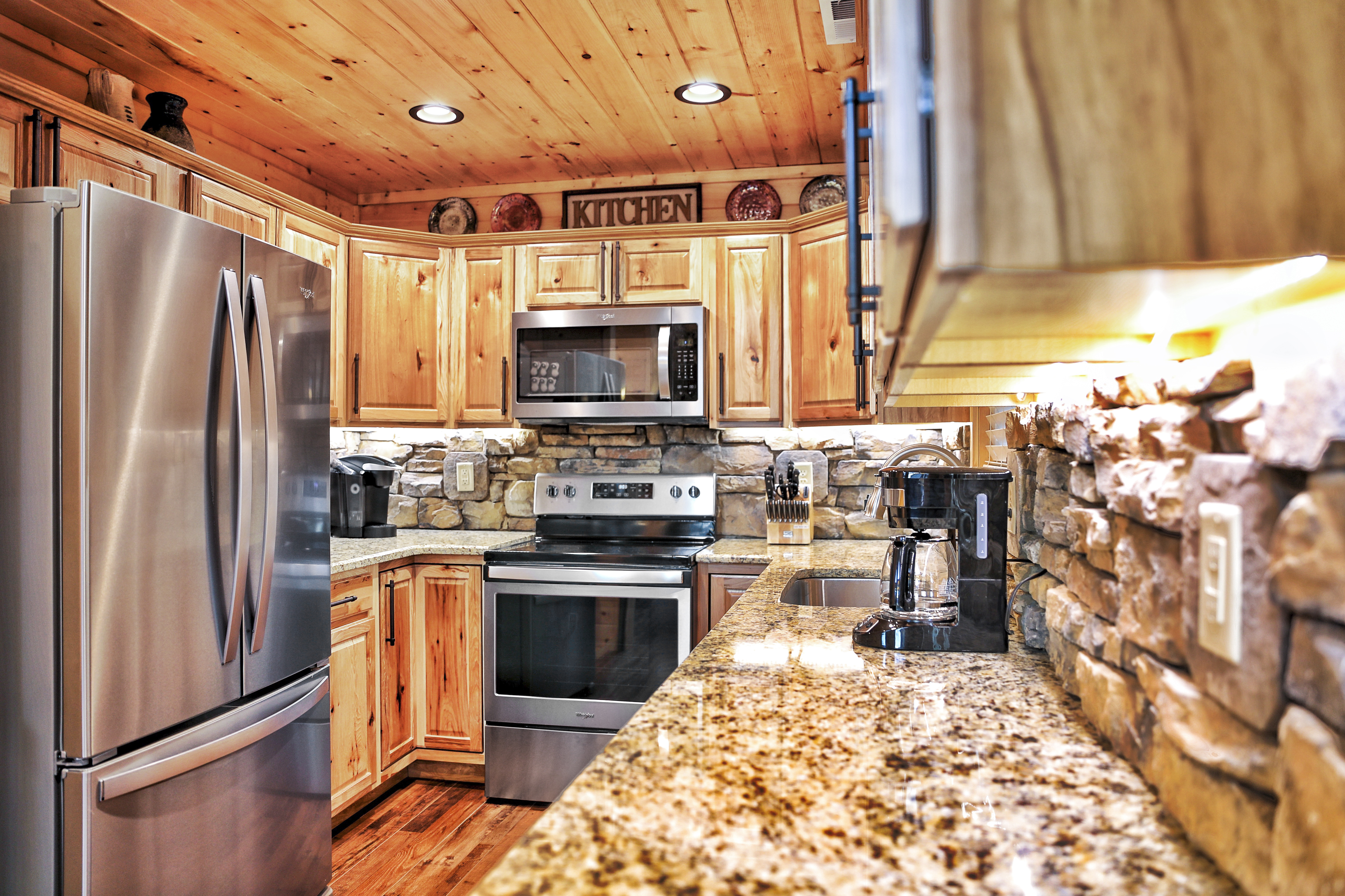 The kitchen is stocked with everything you would expect in a normal kitchen plus a griddle, blender, toaster, waffle maker, slow cooker, various size pots and pans, wine glasses, a Keurig and a regular coffee pot.