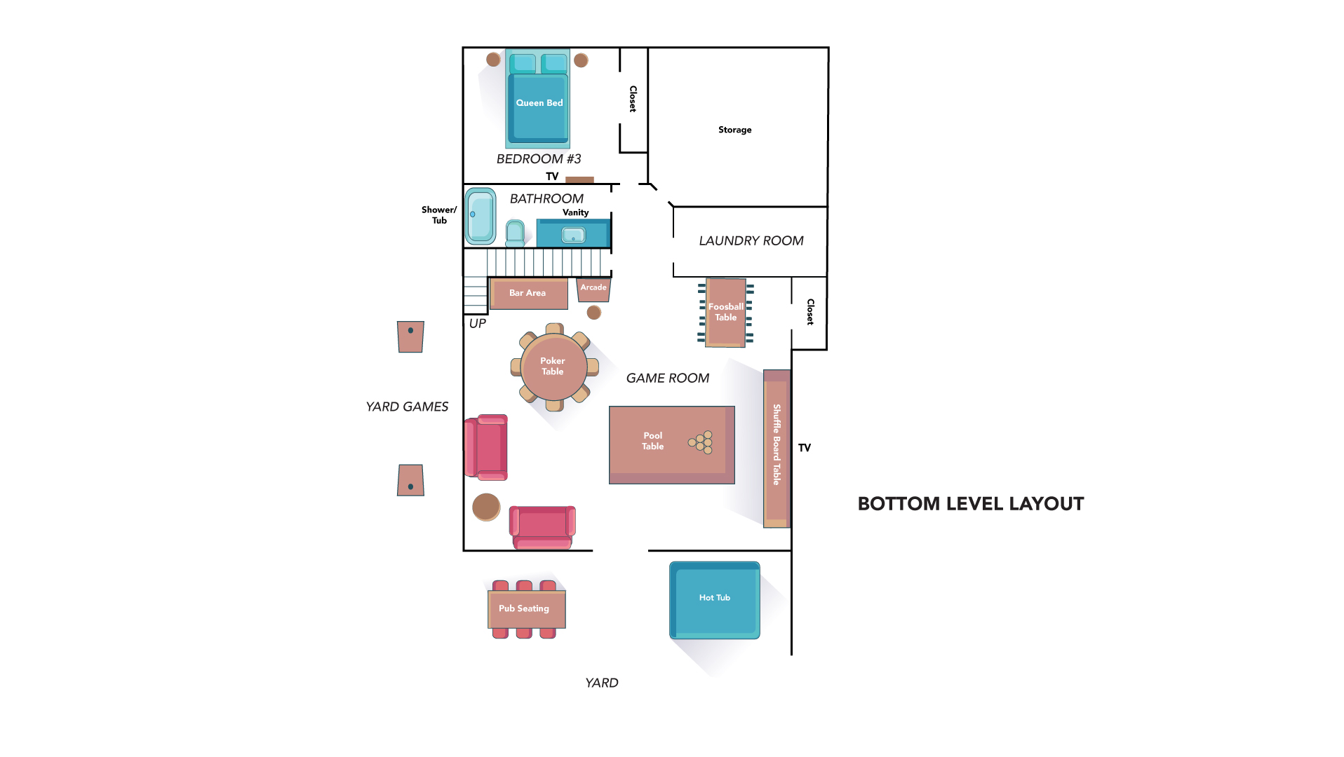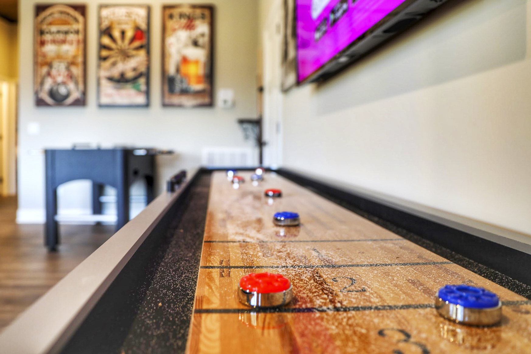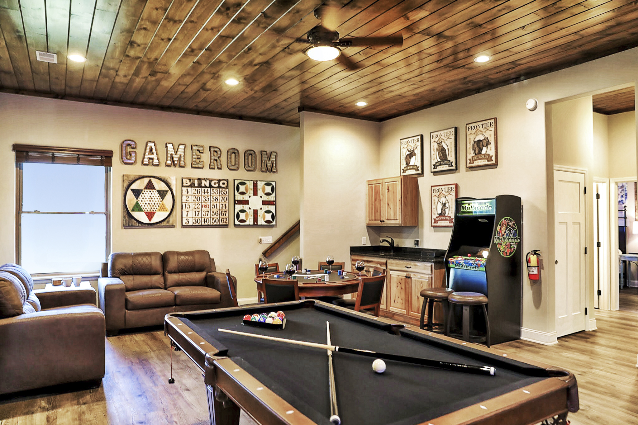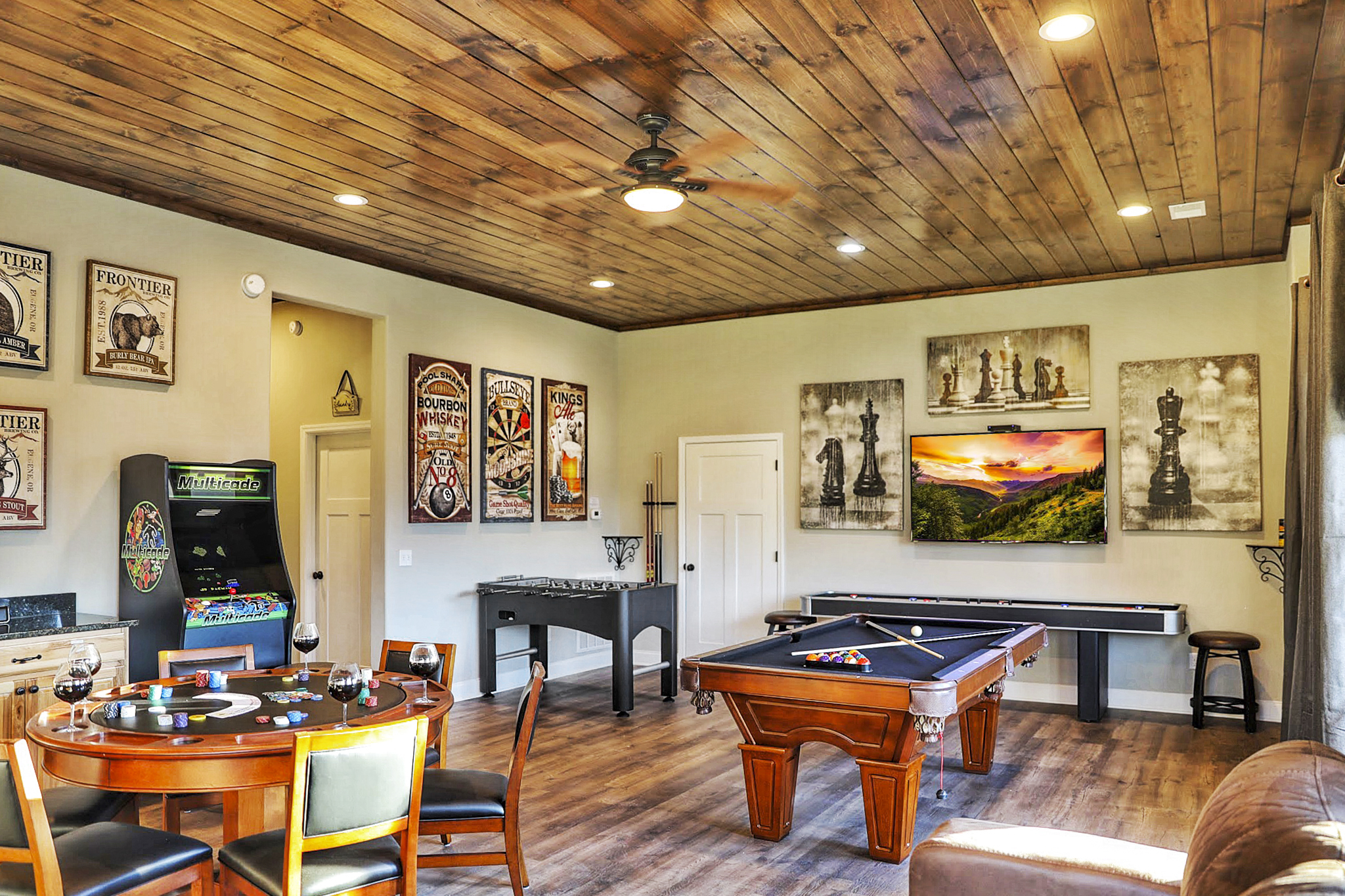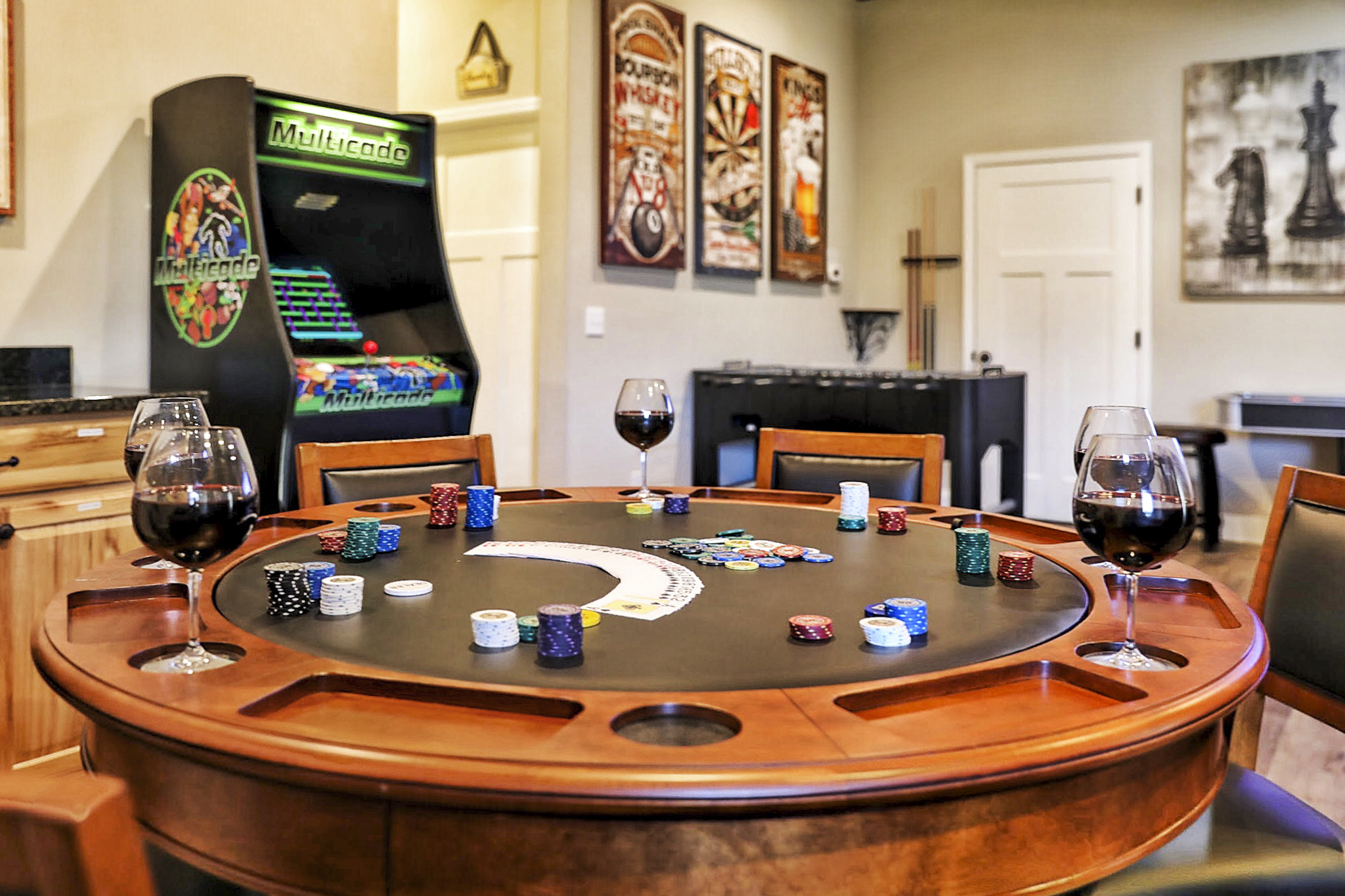º ENTERTAINMENT: Game room with a poker table, billiards, shuffleboard, foosball, all-in-one arcade game, and a selection of board games. A theater rooming with seating for 7.