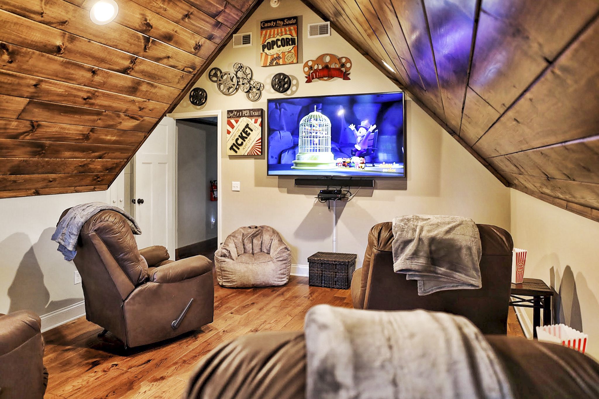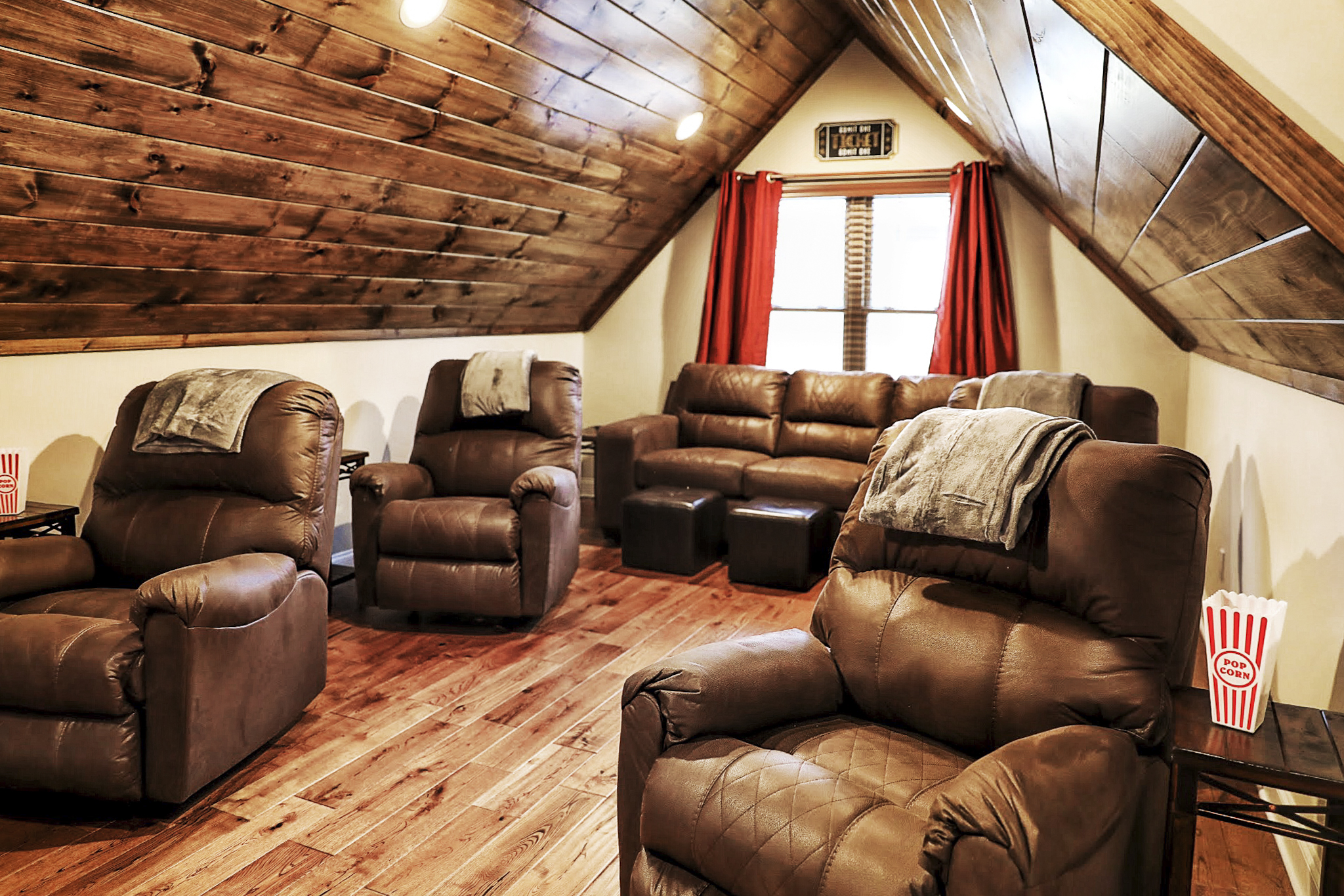 This is a wonderful cabin with great views and many entertainment options. The layout of bedrooms worked for our needs as we had three couples and my elderly mother. We were able to keep her right next to us on the main floor. If you choose to just hangout at the cabin, you can play pool, foosball, shuffleboard or cornhole outside. The arcade has lots of games and there is also a game table. The theater room had very nice seating with recliners. The screened-in side porch with a fire pit meant we could sit outside when it rained for a couple of days. The garage was spacious for two vehicles. We didn’t see any bears this time. Heaven’s Landing will not disappoint if you want a cabin with views and plenty of amenities.- Linda B from Foxworth, Mississippi