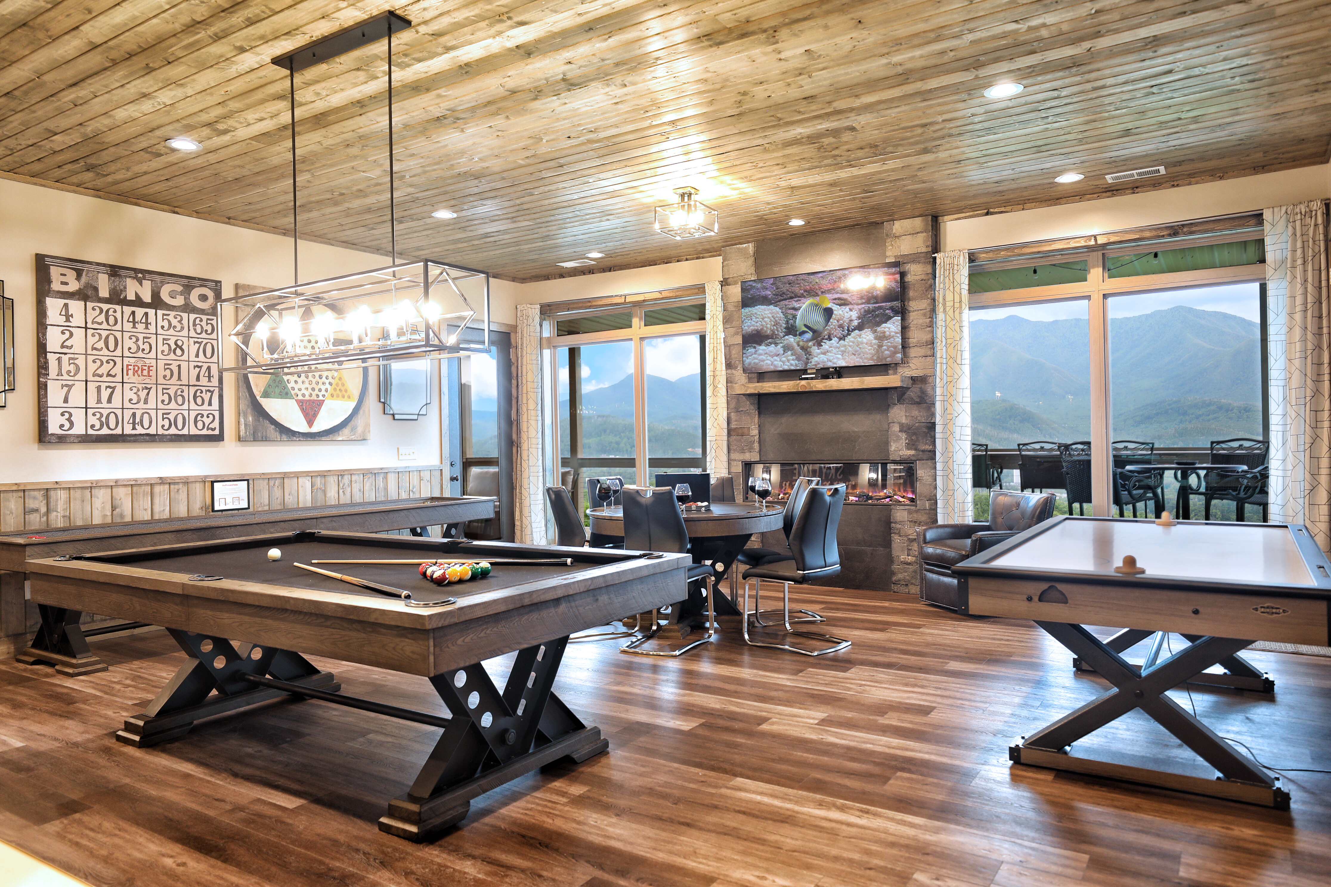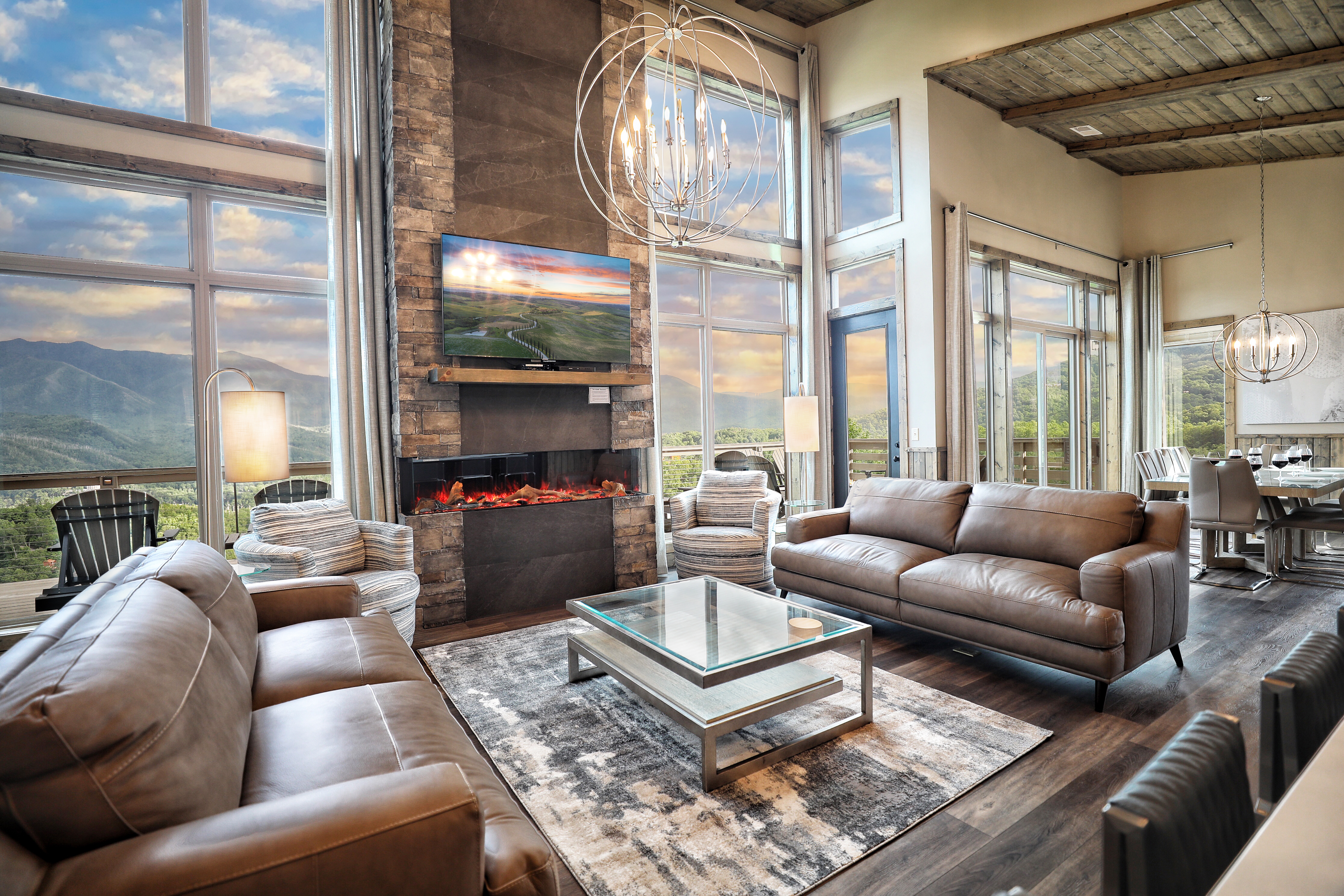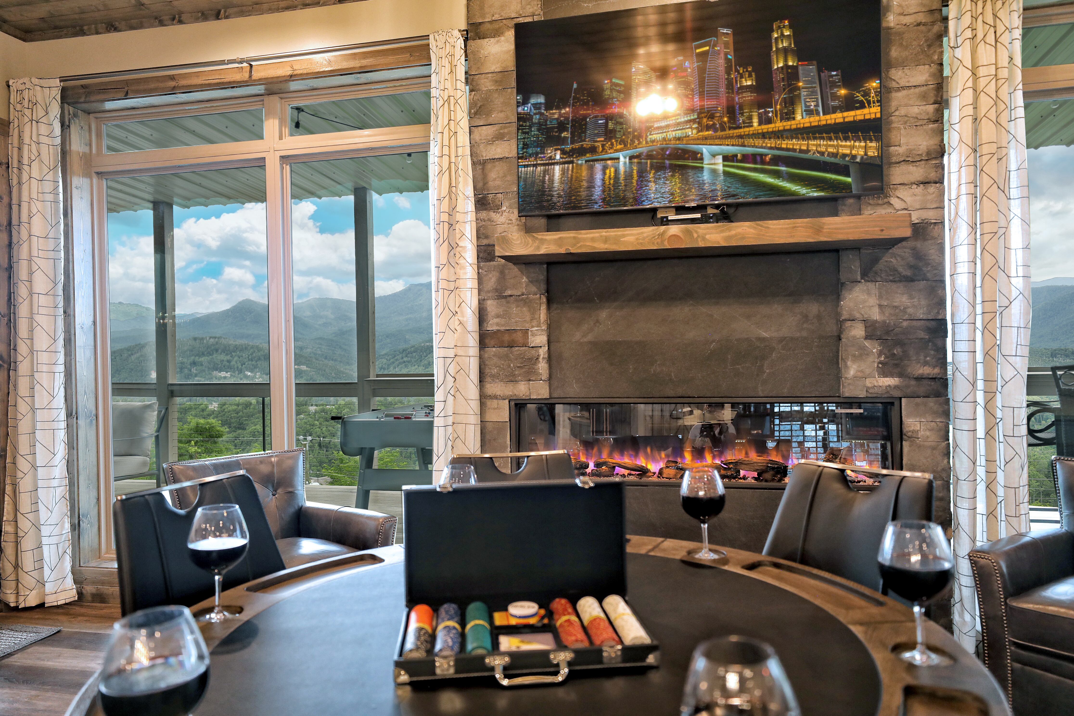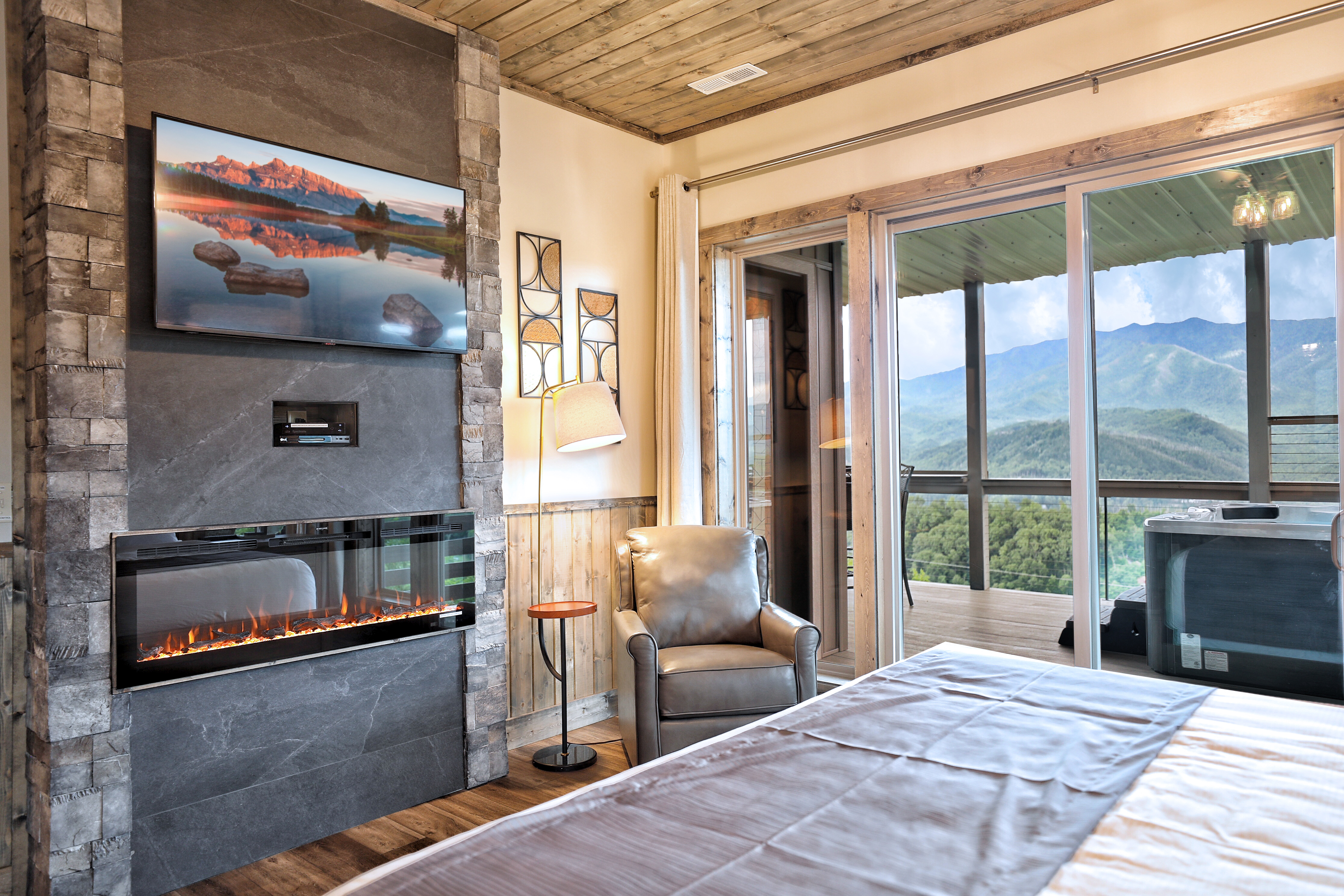 Welcome to Heaven's Skyline, where luxury meets the breathtaking beauty of the Smoky Mountains. This stunning 4-bedroom, 4-bathroom cabin is a modern mountain retreat, boasting panoramic views of the iconic Mt. LeConte from nearly every room. Step onto one of two expansive decks, complete with sleek cable railings, and immerse yourself in nature's grandeur. Enjoy al fresco dining by the fire, unwind in the hot tub, or gather around one of the two cozy fire pits. Inside, floor-to-ceiling windows and a grand stone fireplace create a warm, inviting atmosphere. Each of the four master suites offers a private fireplace and a luxurious ensuite bathroom, ensuring ultimate comfort. The open-concept living space flows seamlessly into a gourmet kitchen, perfect for entertaining. And for fun, the expansive game room will keep guests of all ages entertained. With close proximity to Gatlinburg and Pigeon Forge, Heaven's Skyline is not just a place to stay—it's an unforgettable experience.
