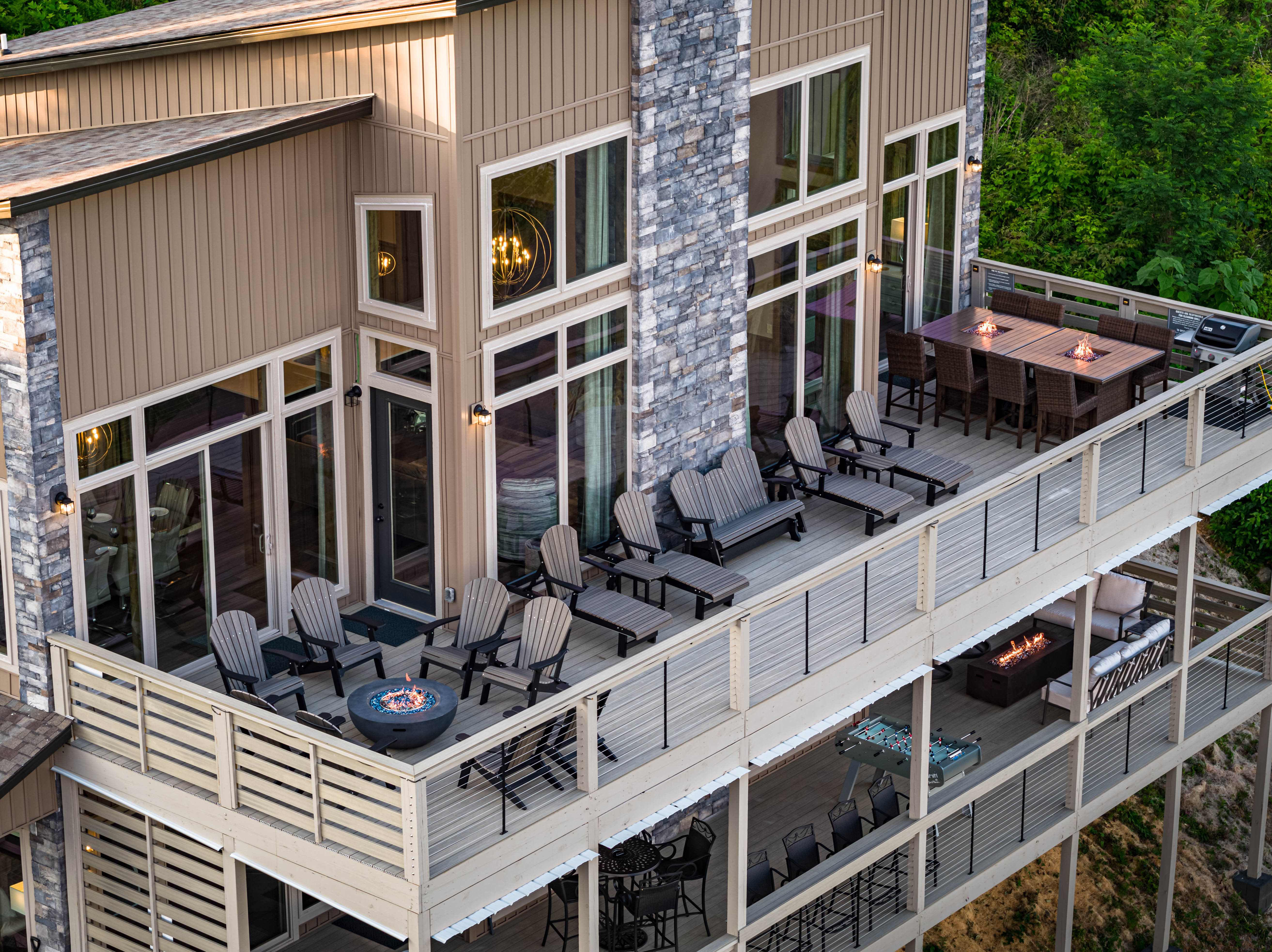 º OUTDOOR SPACES: Expansive decks featuring a hot tub, comfortable seating, alfresco dining tables with fire feature, gas grill, 2 fire pits, lounge chairs, and bar top seating.