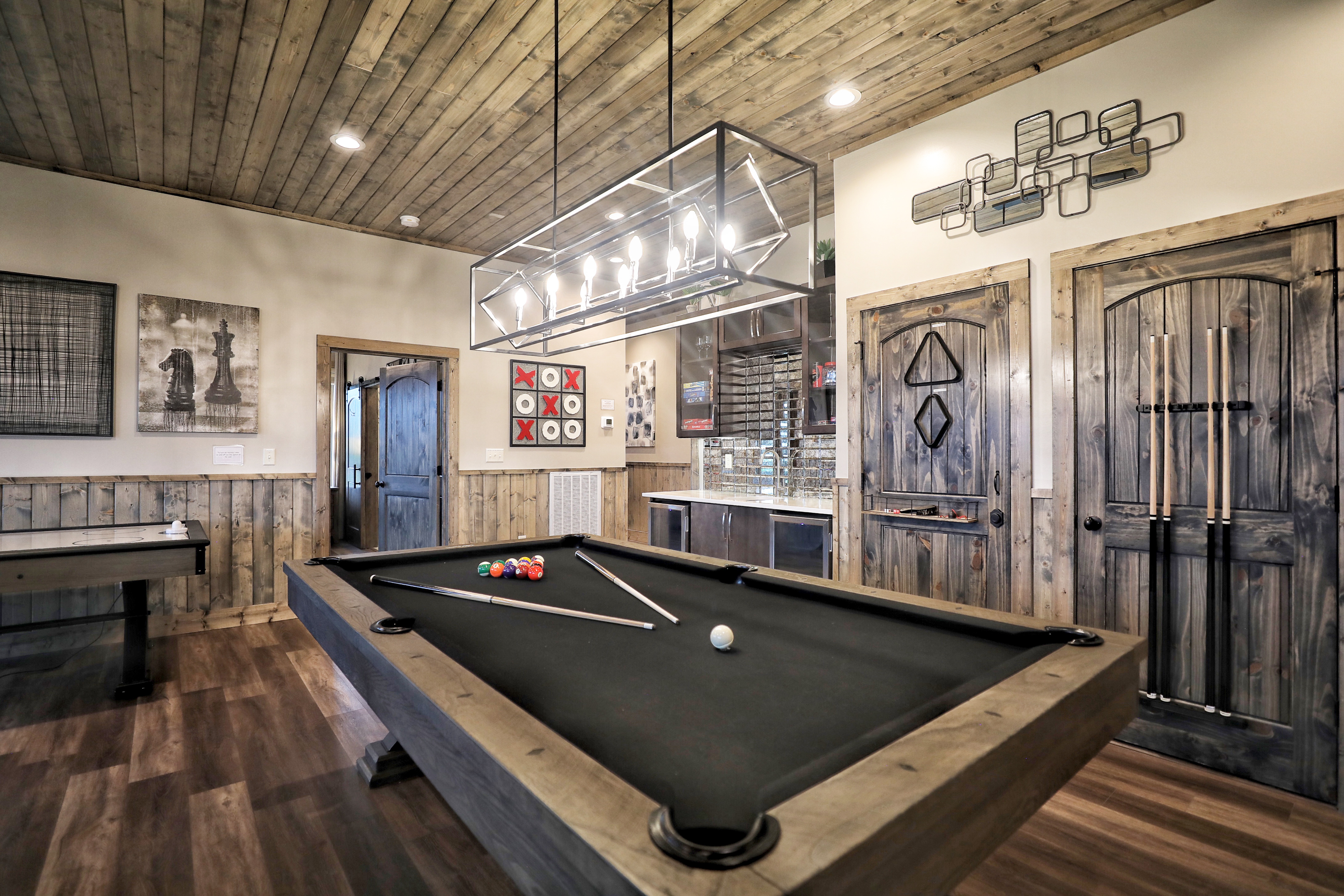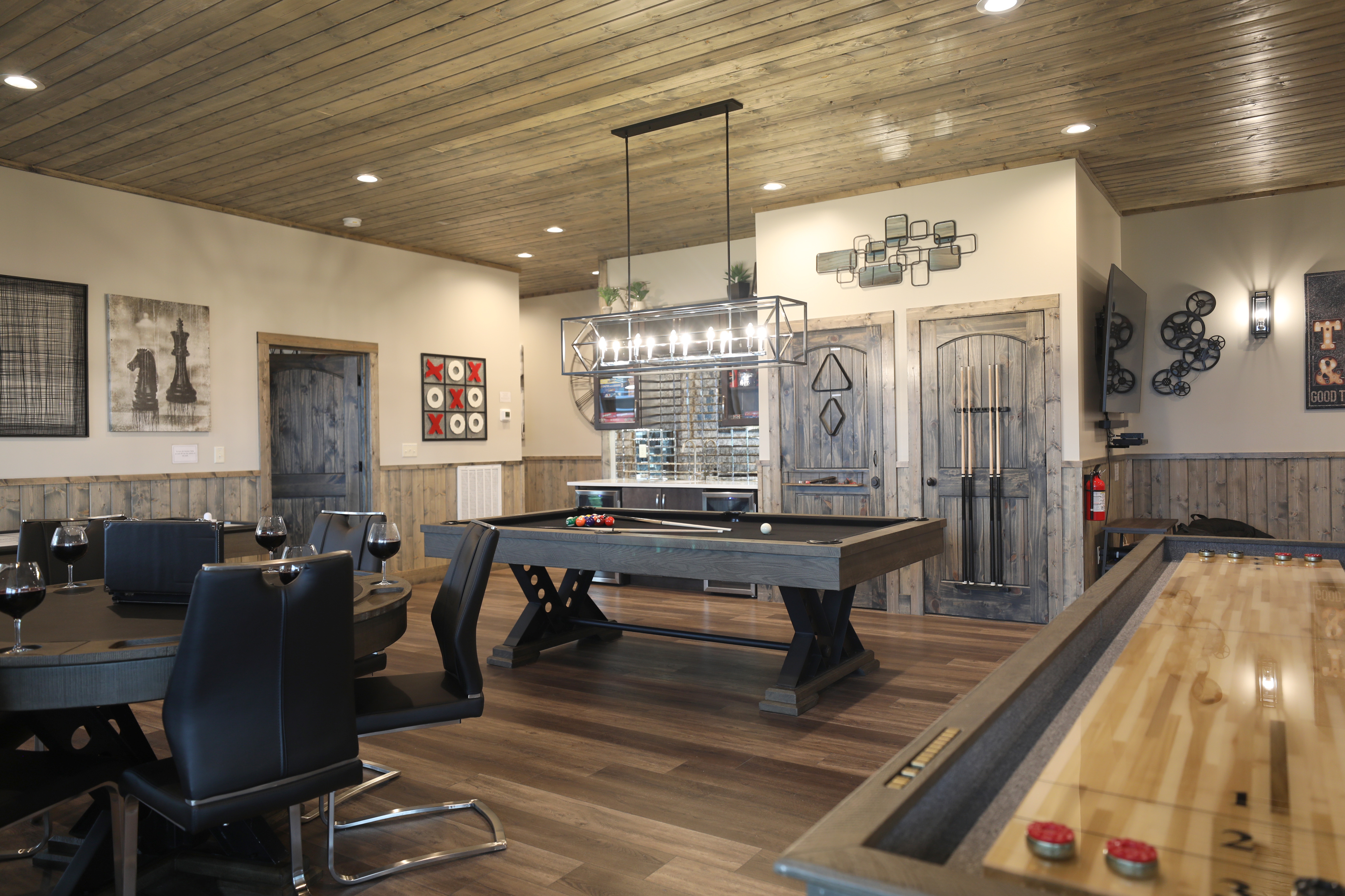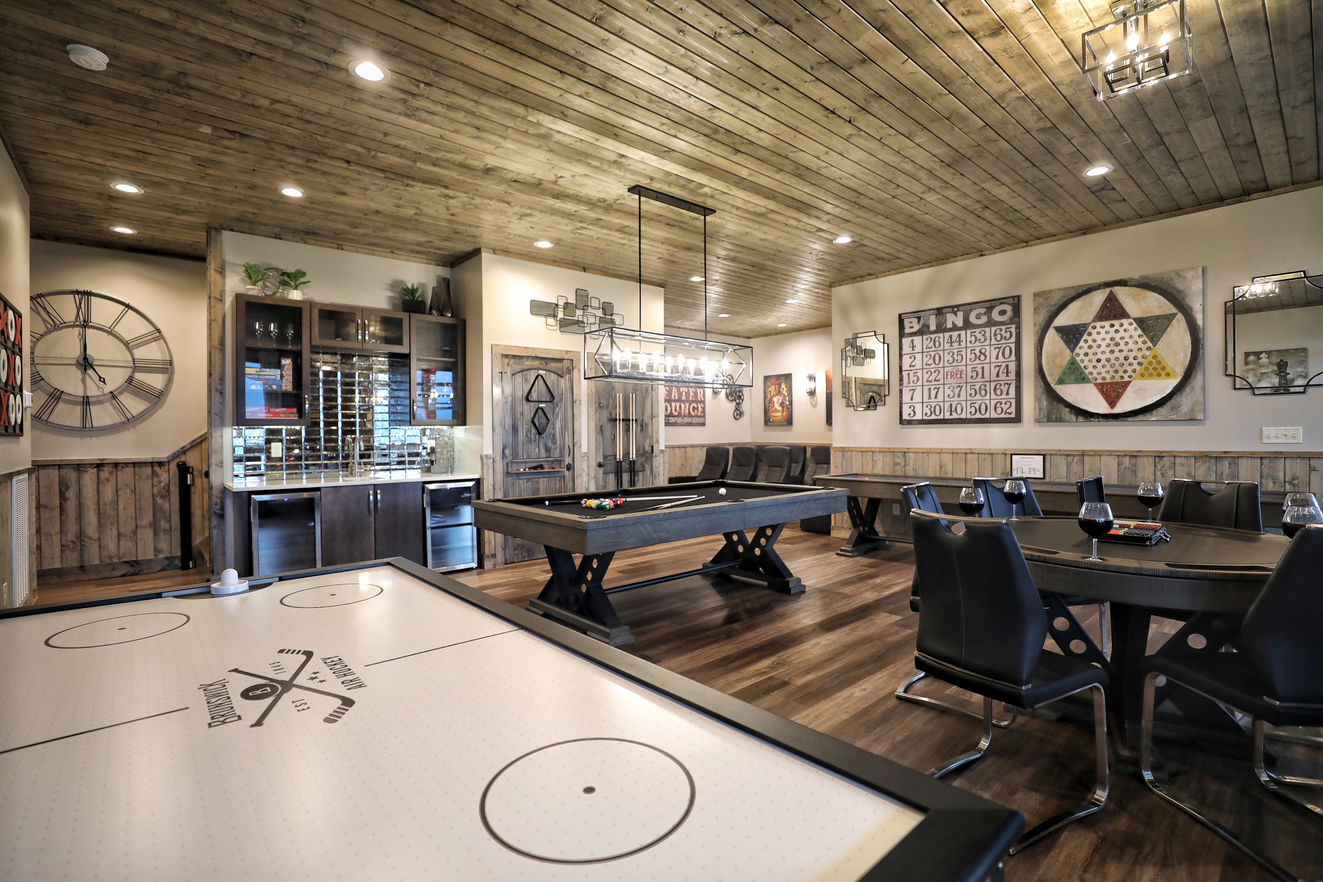 º ENTERTAINMENT: Game room with a poker table, billiards, shuffleboard, air hockey, outdoor foosball, theater seating, and a selection of board games.