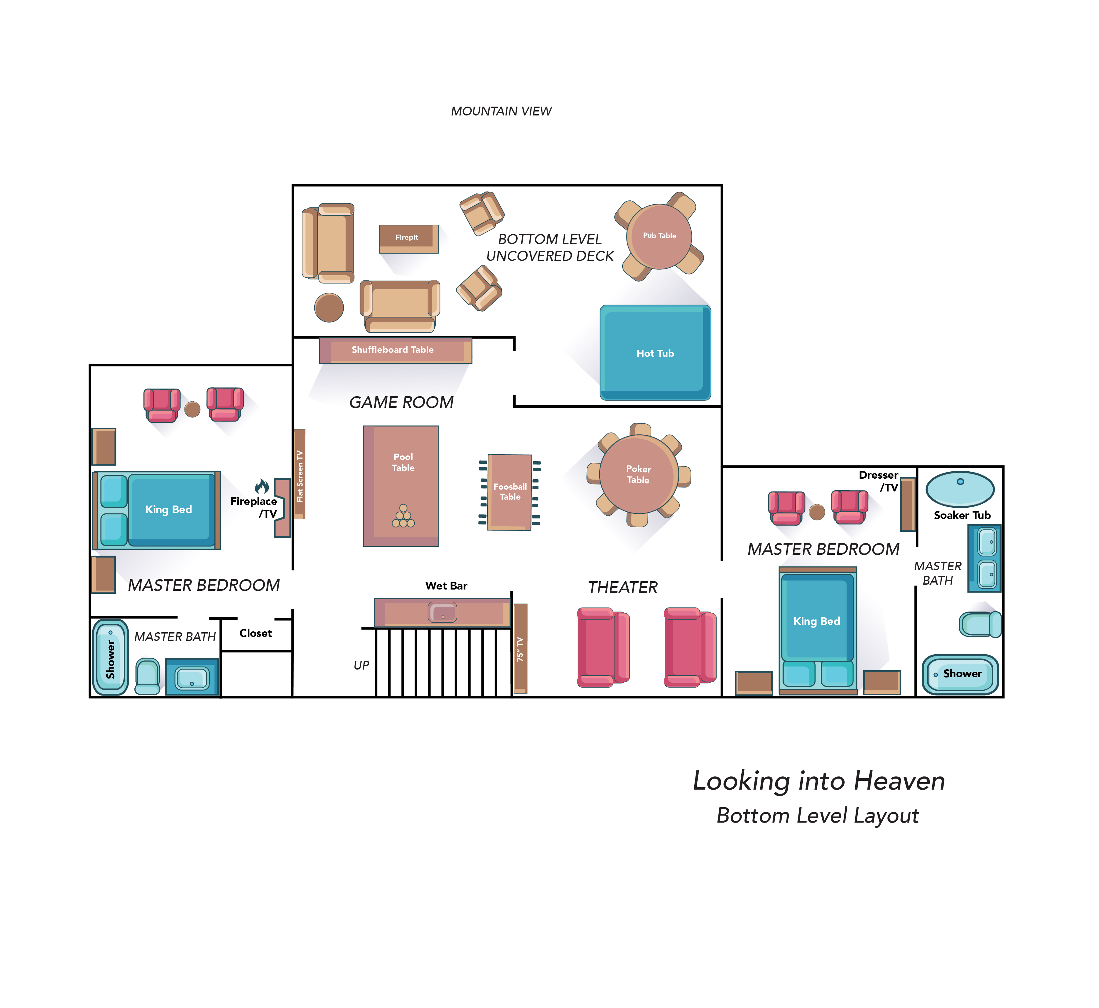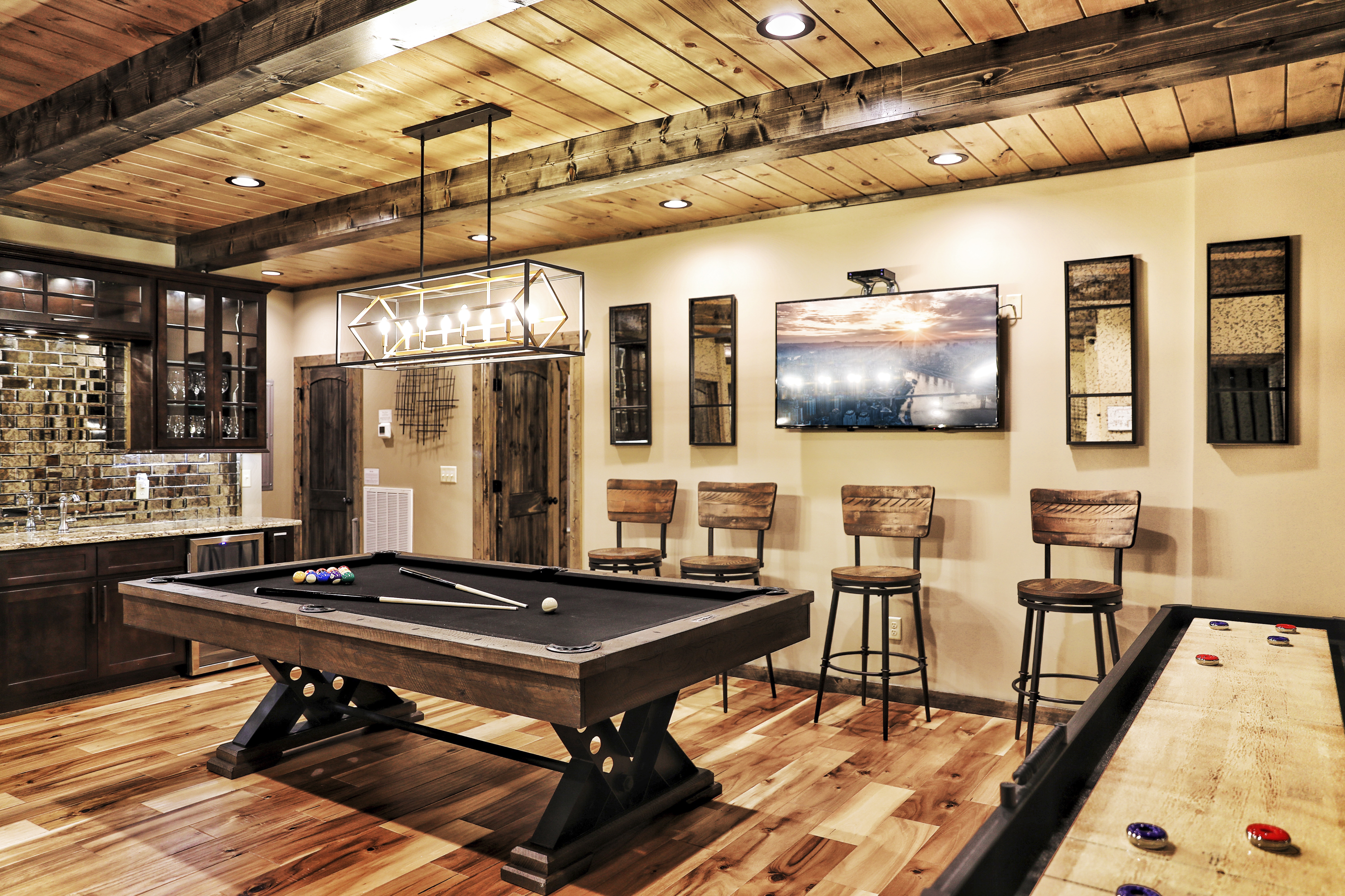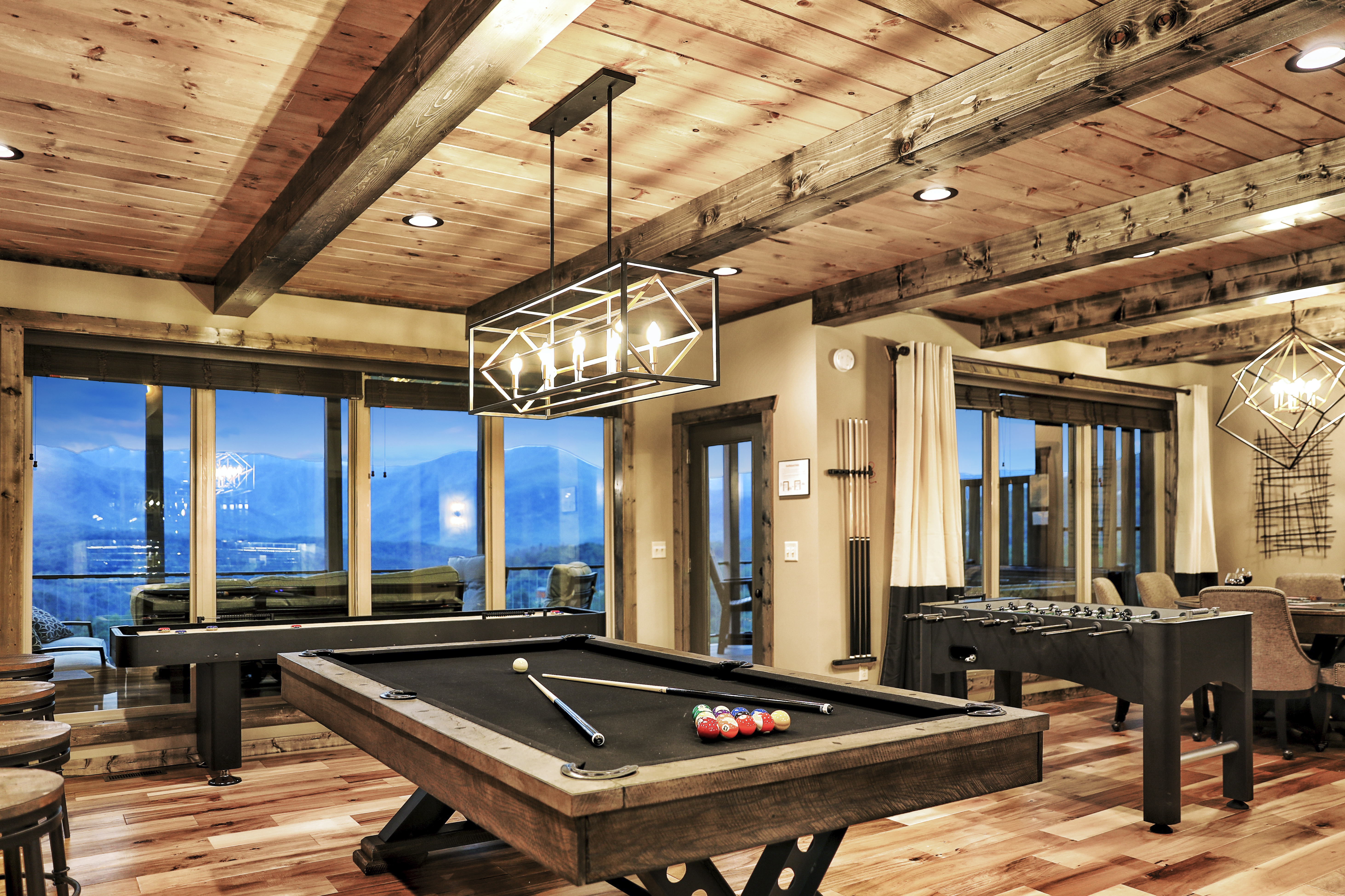 Welcome to "Looking into Heaven," a modern mountain oasis where luxury meets nature in perfect harmony. Nestled in a prime location, this stunning 4-bedroom, 4.5-bathroom cabin offers panoramic views of the Smoky Mountains, including the majestic Mt. LeConte. Two of the master suites are cozy retreats with fireplaces, while the other two feature luxurious soaking tubs set in front of floor-to-ceiling windows, allowing you to unwind while taking in the breathtaking scenery. The open-concept living area seamlessly combines a gourmet kitchen, indoor dining with a view, and a cozy living room centered around a three-sided fireplace, all designed to immerse you in the beauty of your surroundings. The expansive game room is a haven of entertainment, featuring theater seating with a 75" 4K Ultra HD screen, a wet bar for mixing your favorite drinks, and a variety of games including pool, shuffleboard, poker, foosball, and more. Perfectly blending modern amenities with rustic charm, "Looking into Heaven" is your gateway to an extraordinary mountain escape.