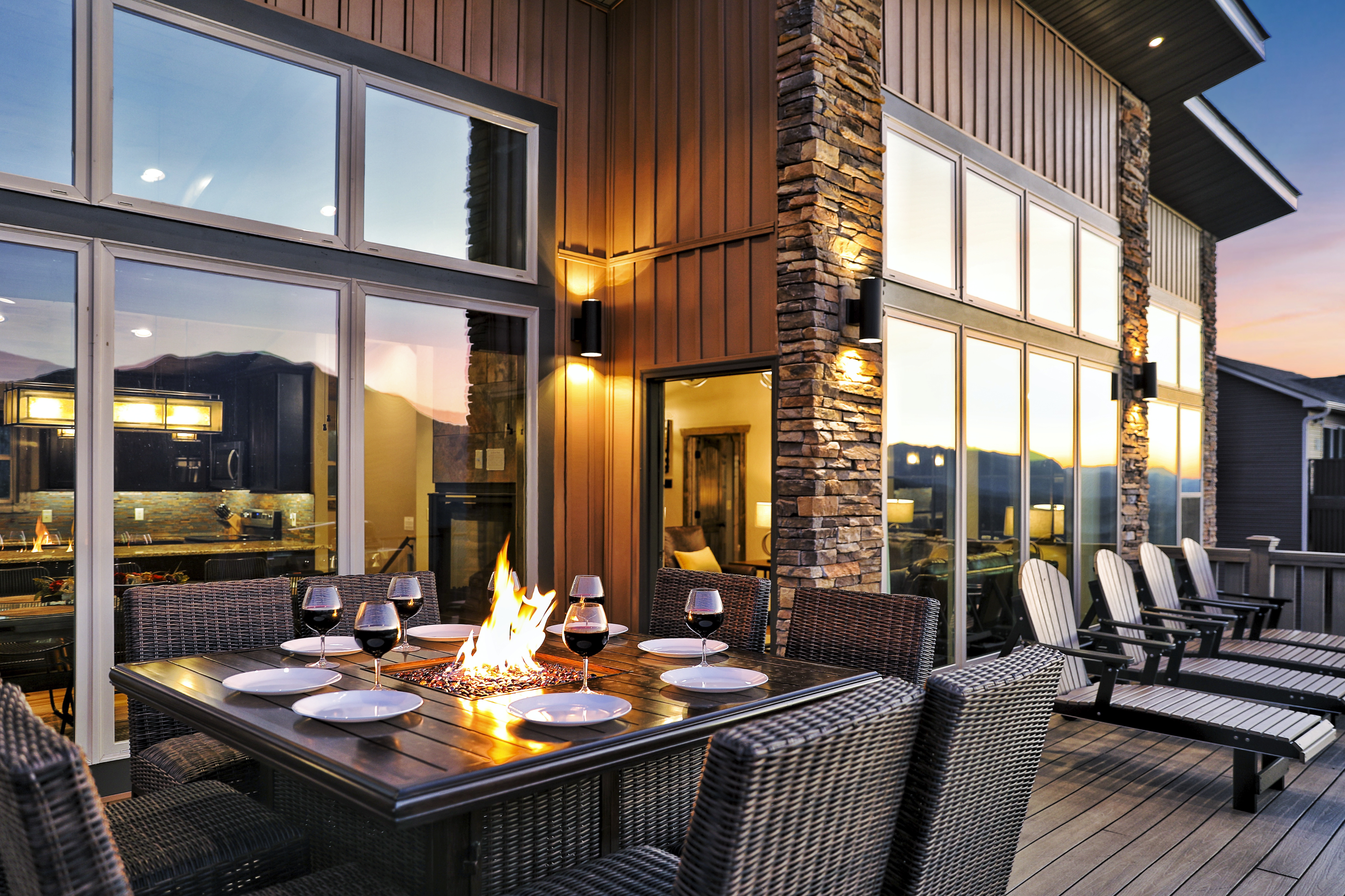 º OUTDOOR SPACES: Expansive decks featuring a hot tub, comfortable seating, alfresco dining table with fire feature, gas grill, 2 fire pits, lounge chairs, and bar top seating.