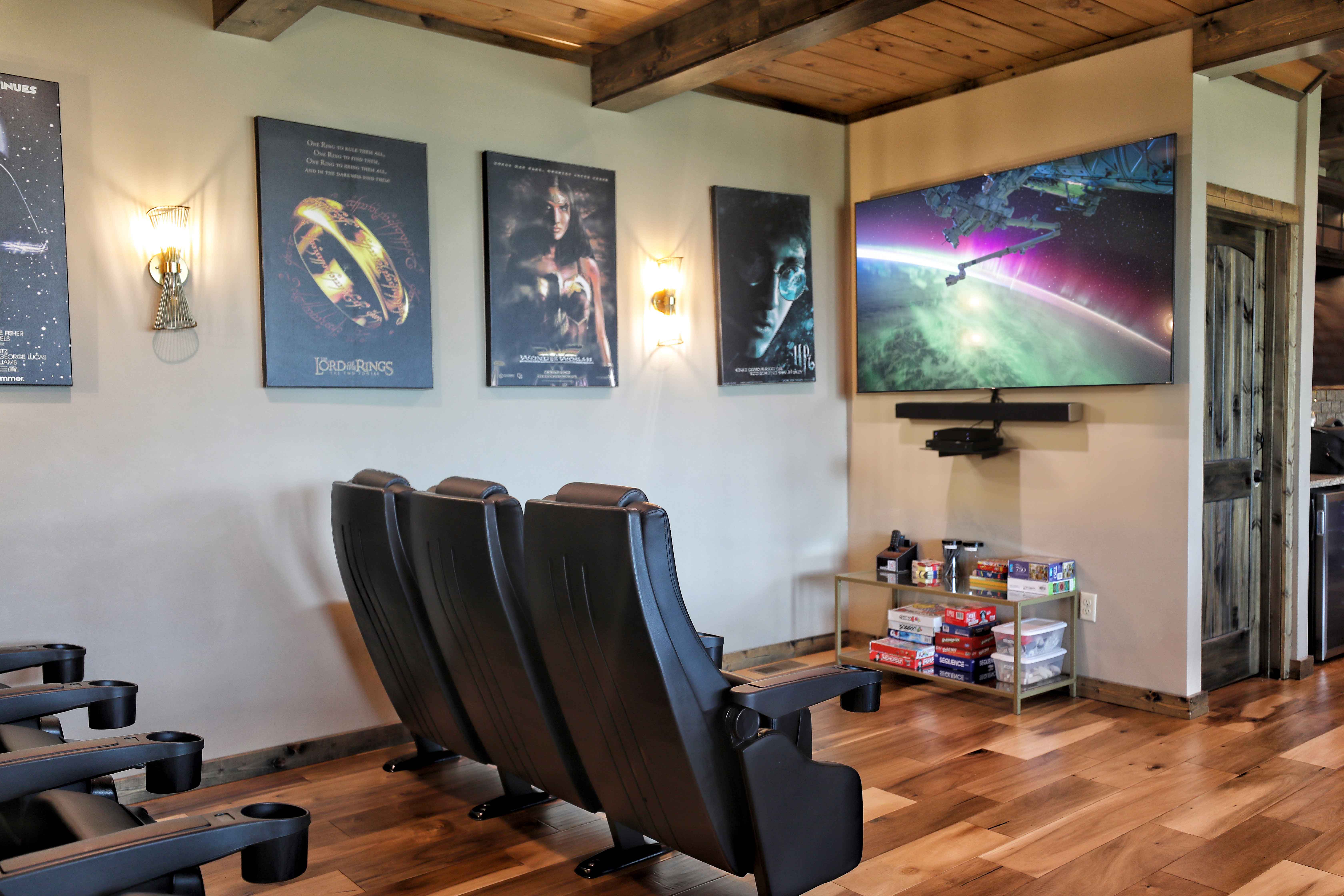 The spacious layout was perfect for our family vacation. Every couple had their own bathroom, a huge issue for larger groups. Plenty of towels (at least 4 per bathroom) and blow dryer for each bathroom. All bedrooms had comfy king size beds, 4 pillows, and blackout curtains for those who want to sleep in. There are also 2 chairs in each bedroom so you can enjoy a bit of private time with morning coffee or afternoon cocktails while gazing at the mountains through the floor to ceiling windows. The kitchen table seats 8 so everyone could sit together for meals. The metal chairs are a bit uncomfortable and could use seat cushions. There are also 3 counter height barstools for overflow seating if needed. The kitchen was very well equipped with plenty of plates, bowls, silverware, pots/pans and serving dishes for group meals. It even had items you don’t find in other rentals like portable mixer, measuring cups/spoons, griddle, crockpot, bakeware, blender, several spices and lots of serving spoons and spatulas. 2 decks offered great relaxation spaces including a hot tub and cushioned patio set with fire place table. The outdoor bistro table (with fire) seats 8 and we ate several meals there. The grill was clean and is hooked directly to main gas line so no worries about running low. The washer/dryer is a huge convenience and the rental had a vacuum cleaner and broom. The game room was great with pool table, foos-ball, tabletop shuffleboard and poker table for board games. We didn’t use the home theater but it looks like a nice place for a family movie night. The wet bar in the game room had 2 small refrigerators which allowed us to store extra beverages so we didn’t need to go upstairs for them. The owner provided a comprehensive binder with instructions and helpful information about the unit. The check-in and check-out process is very well explained and we appreciated the key pad on the door so we didn’t need to keep track of keys for those who wanted to go on separate outings. There are 4 trash bins outside that are enclosed in a cage to keep the bears out. We saw bears and cubs in the neighborhood every day. The flat parking offered plenty of space for 3 cars with enough room to maneuver around. The drive up the mountain is a bit scary with a few narrow spots, hairpin turns, and one very steep hill; but we did get used to it after a couple trips up and down. We really loved this rental and wouldn’t hesitate to book it again.- Cindy T.