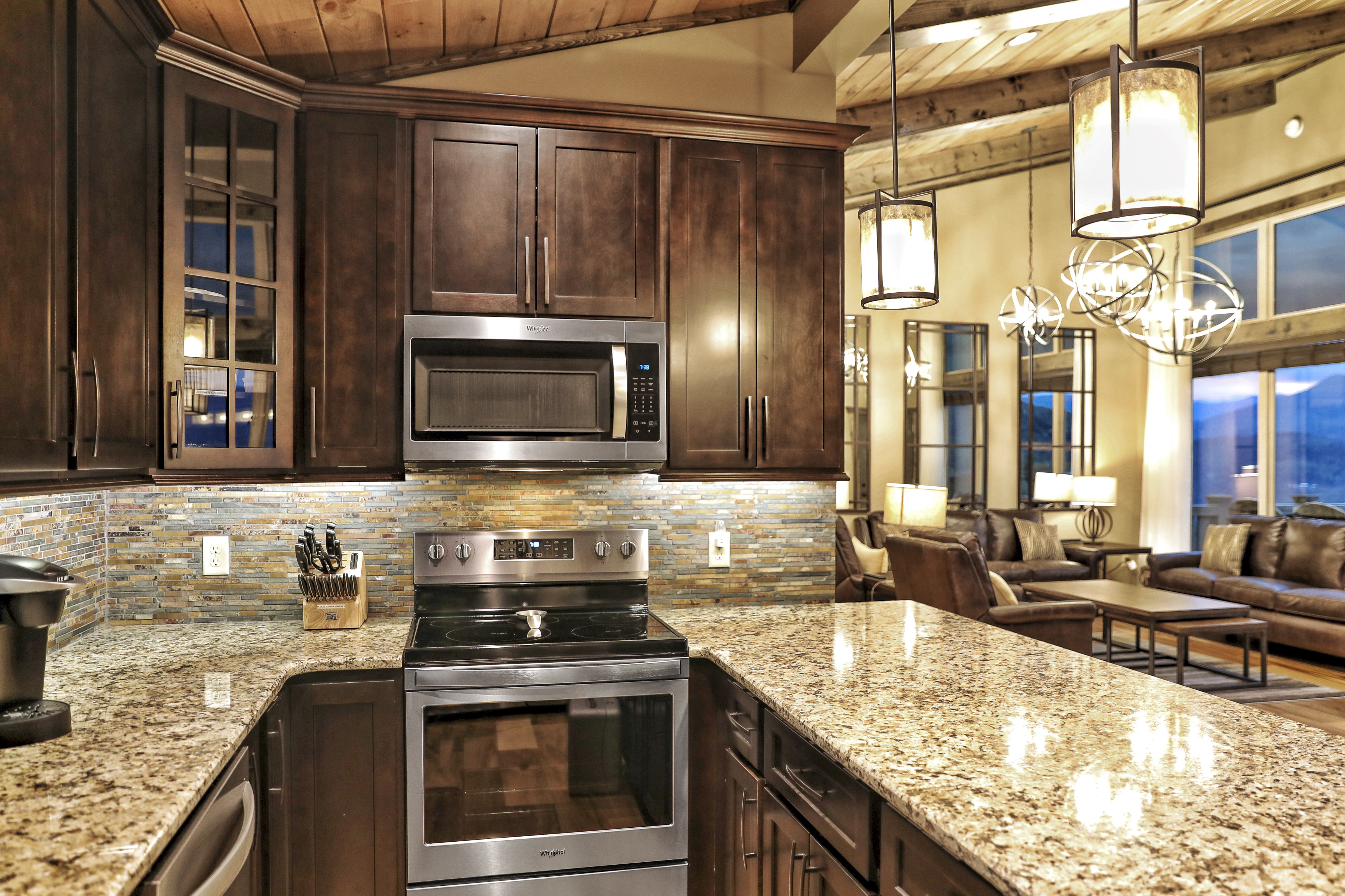º KITCHEN: Stainless steel appliances including dishwasher, granite counter tops, fully stocked with standard essentials plus Keurig, traditional coffee maker, griddle, slow cooker, blender, waffle maker and wine glasses.