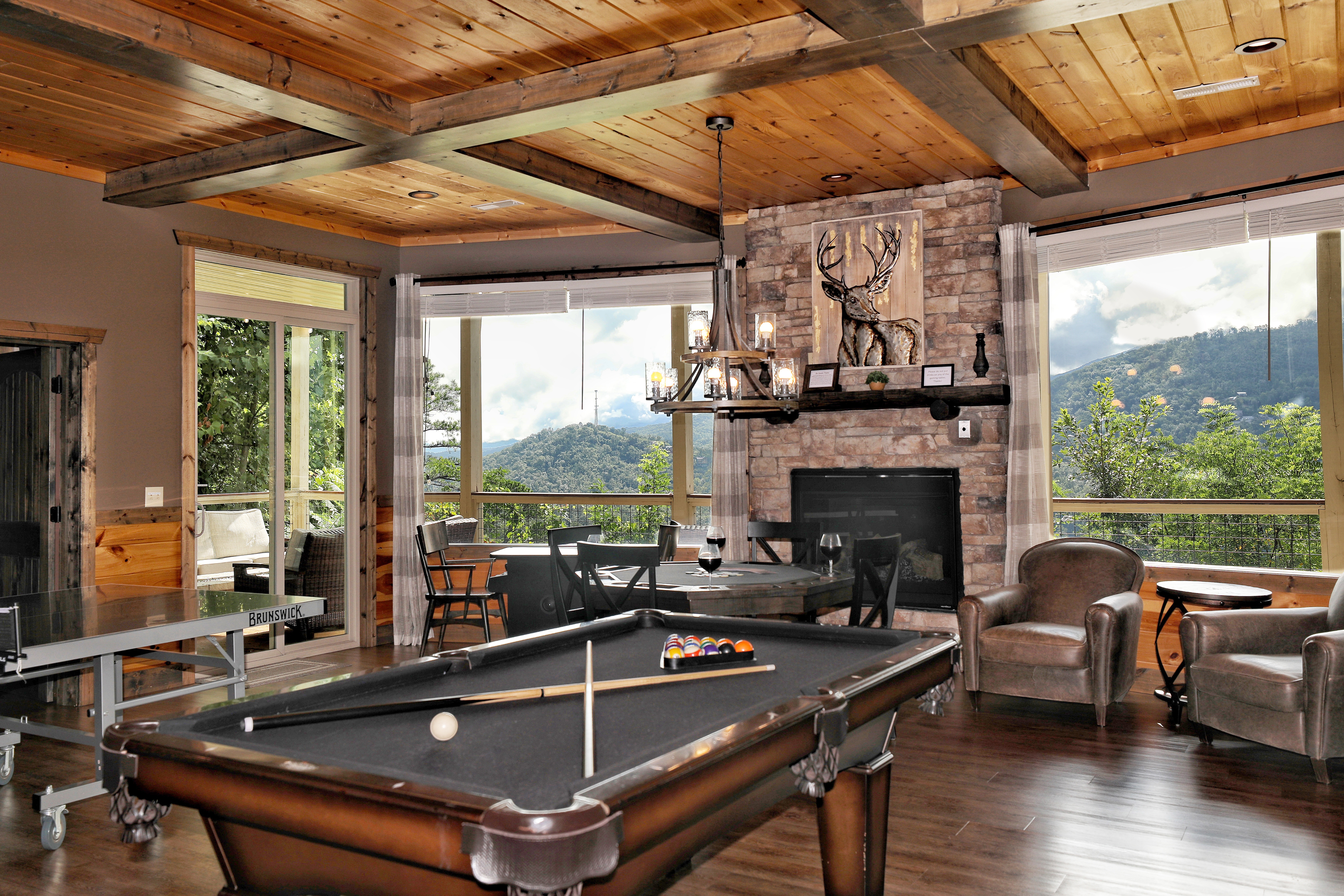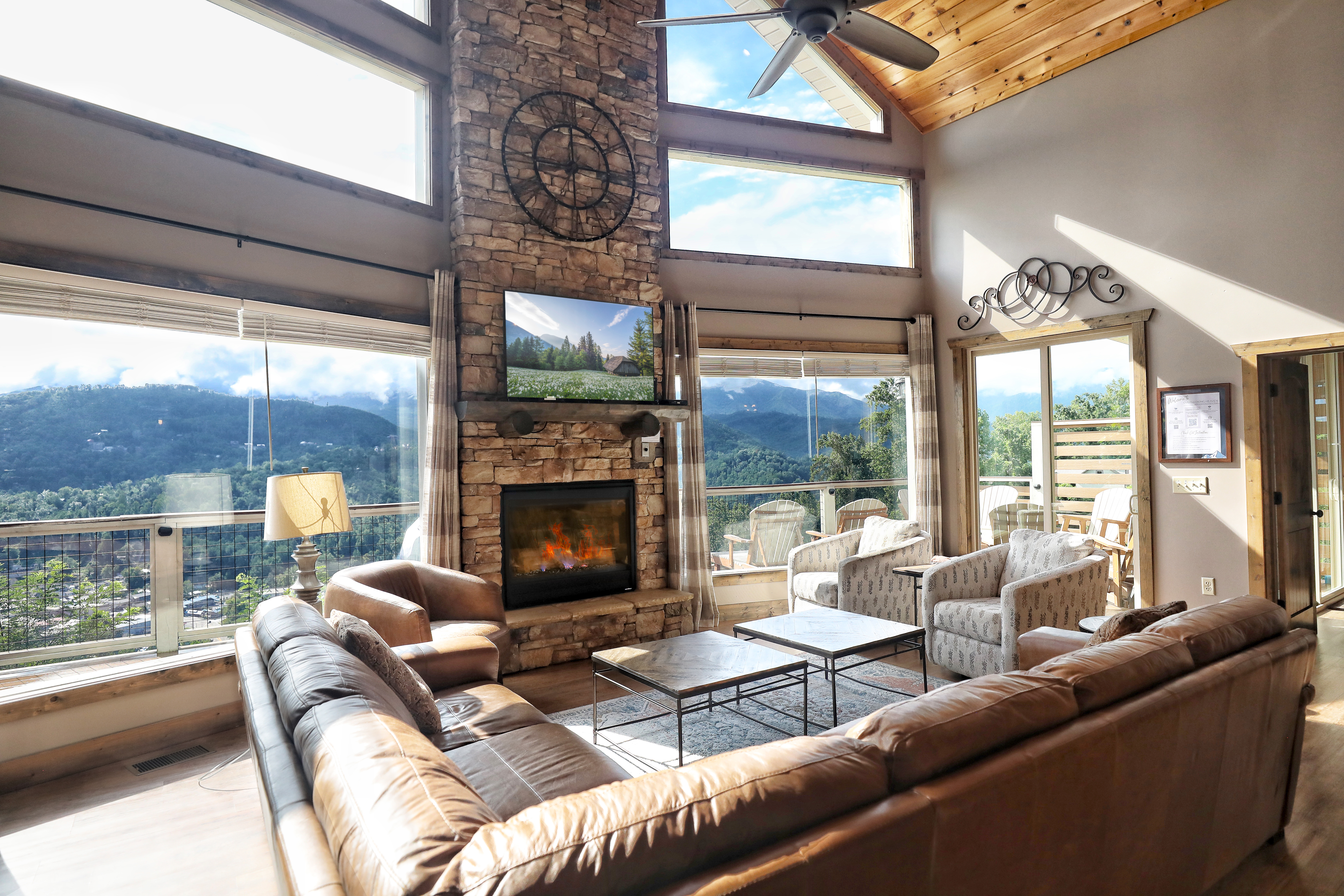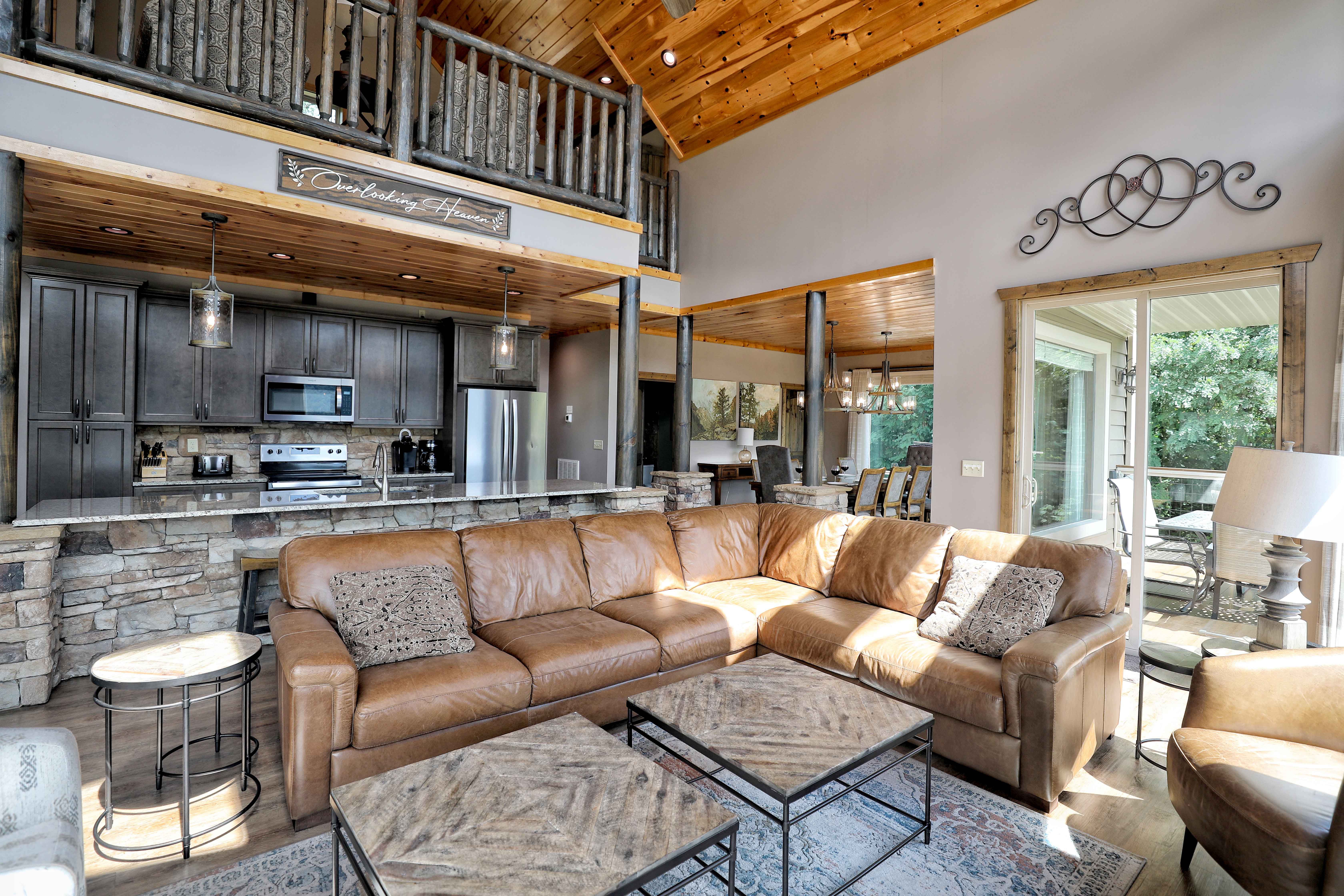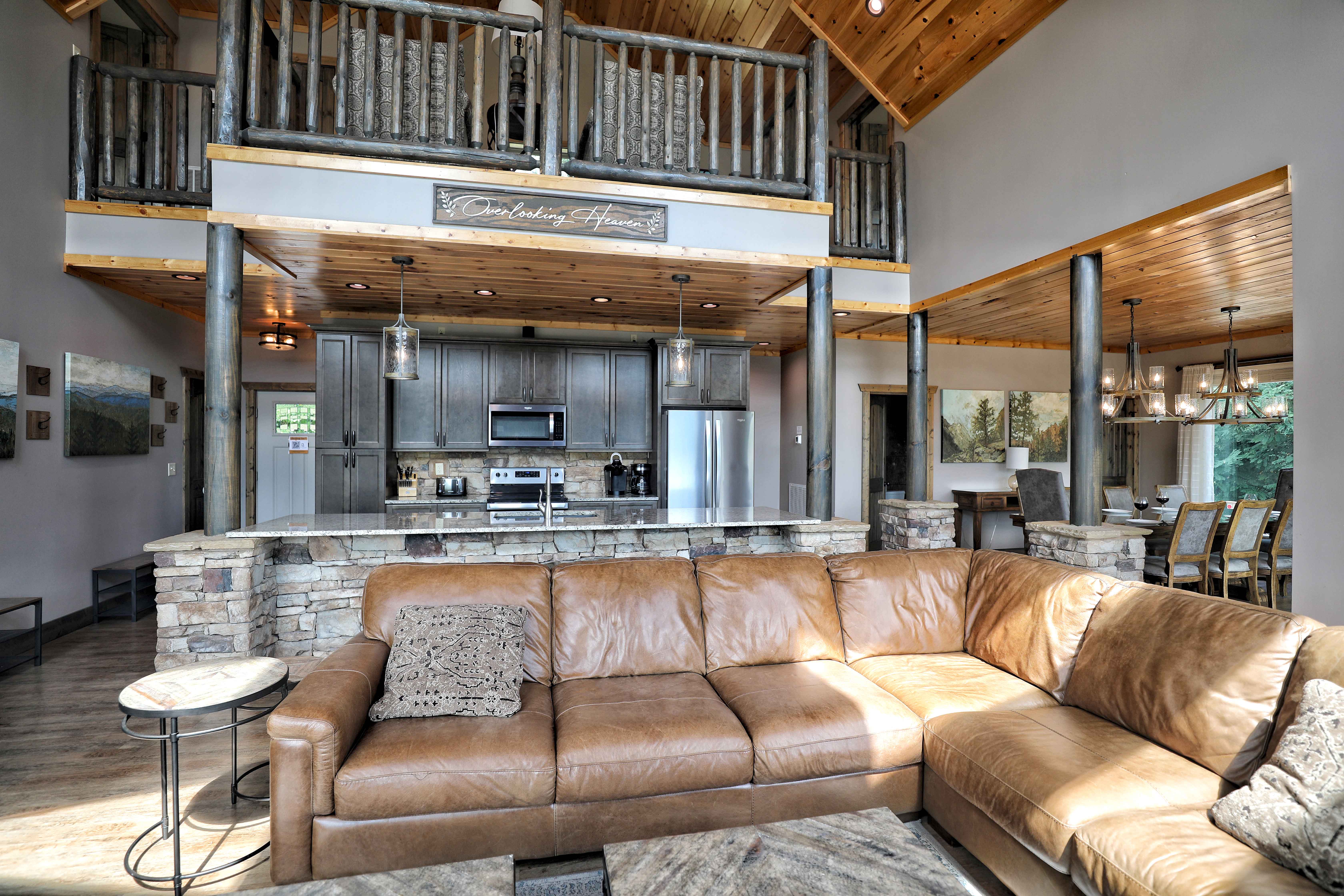 Overlooking Heaven is a stunning mountain retreat, perfectly situated just a mile from downtown Gatlinburg, offering the ideal balance of serenity and convenience. This luxurious 5-bedroom cabin, designed with rustic charm and modern amenities, accommodates up to 10 guests. Each bedroom features a king-sized bed, private bath, cozy fireplace, and direct access to the deck, where you can soak in breathtaking mountain views. The cabin's open design, with its warm wood floors, pine ceilings, and stone accents, creates an inviting atmosphere, while the fully equipped gourmet kitchen and spacious dining area provide everything you need for a memorable stay. Unwind in the hot tub, relax by one of the outdoor fire pits, or enjoy a game in the entertainment-packed game room. Overlooking Heaven is the perfect blend of comfort and luxury in a premium mountain location.