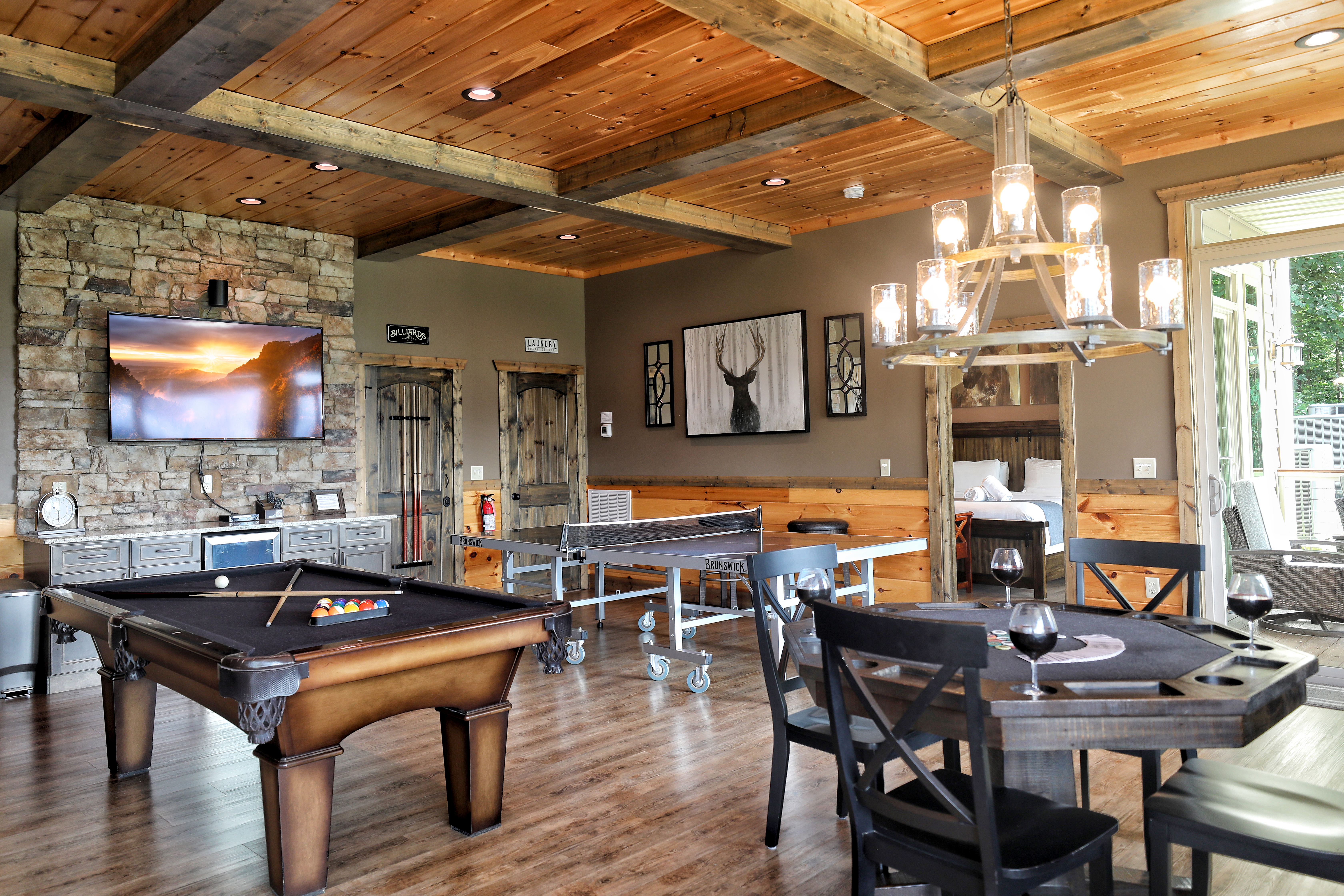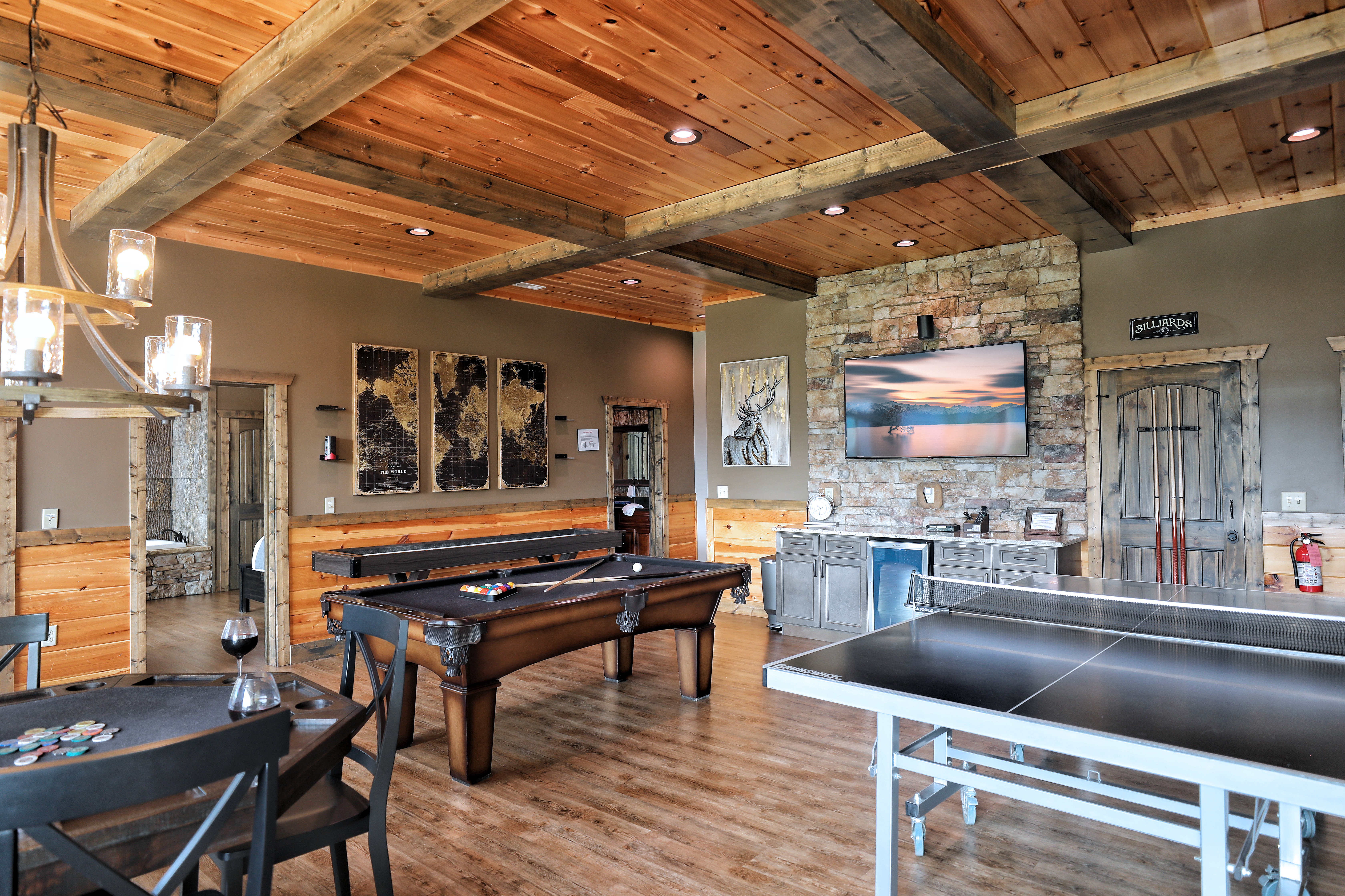 º ENTERTAINMENT: Game room with a poker table, billiards, shuffleboard, ping pong, all-in-one arcade game and a selection of board games.