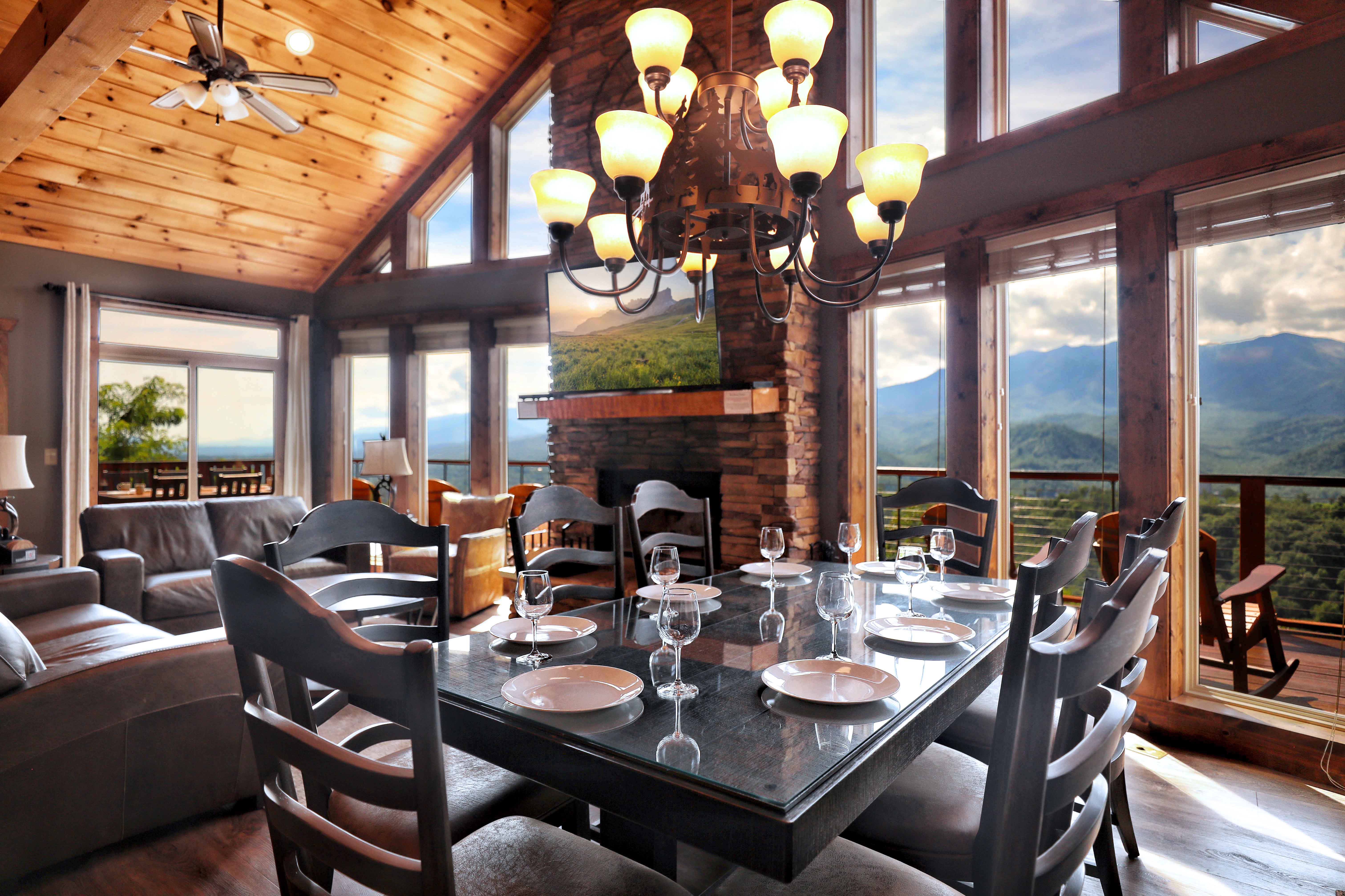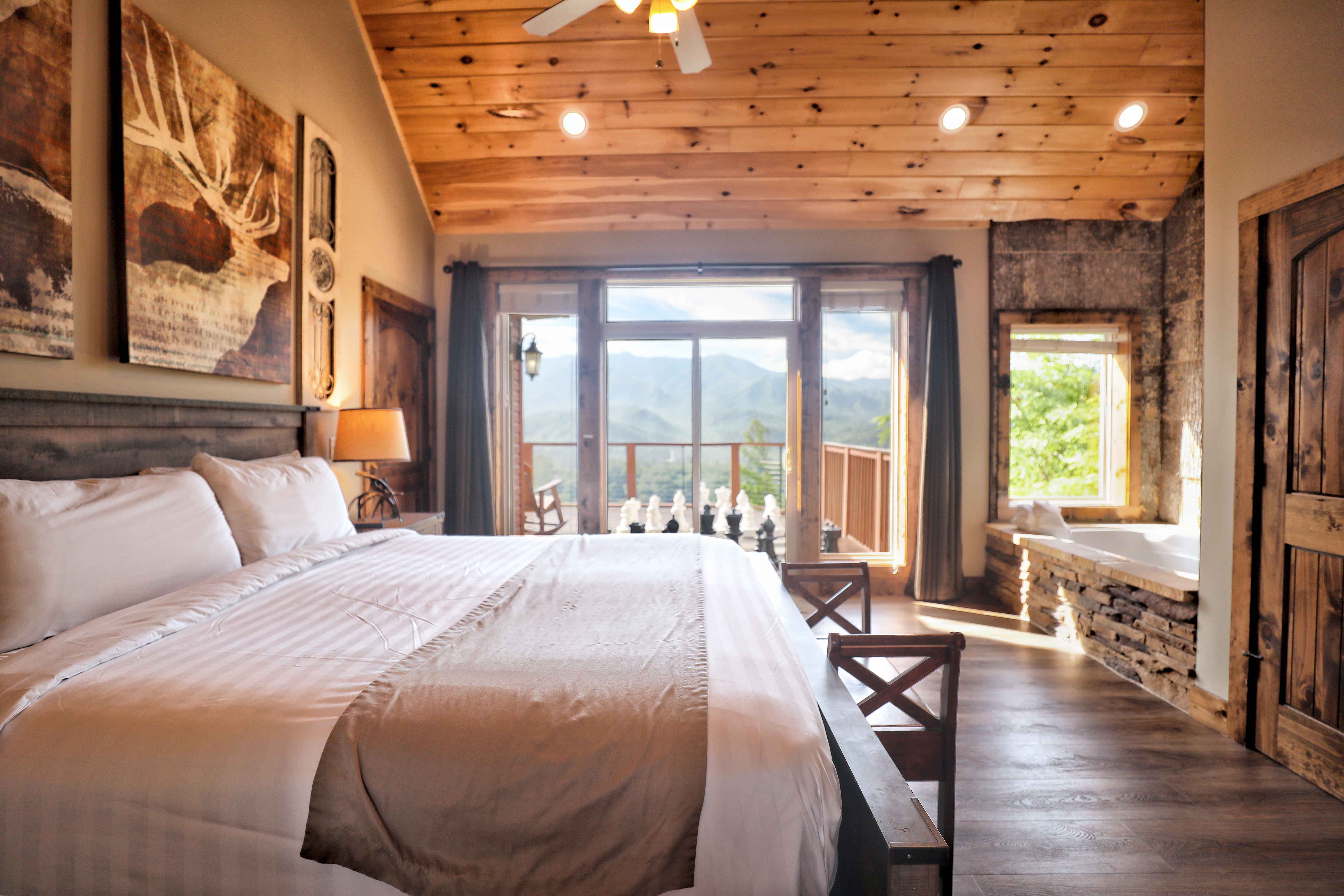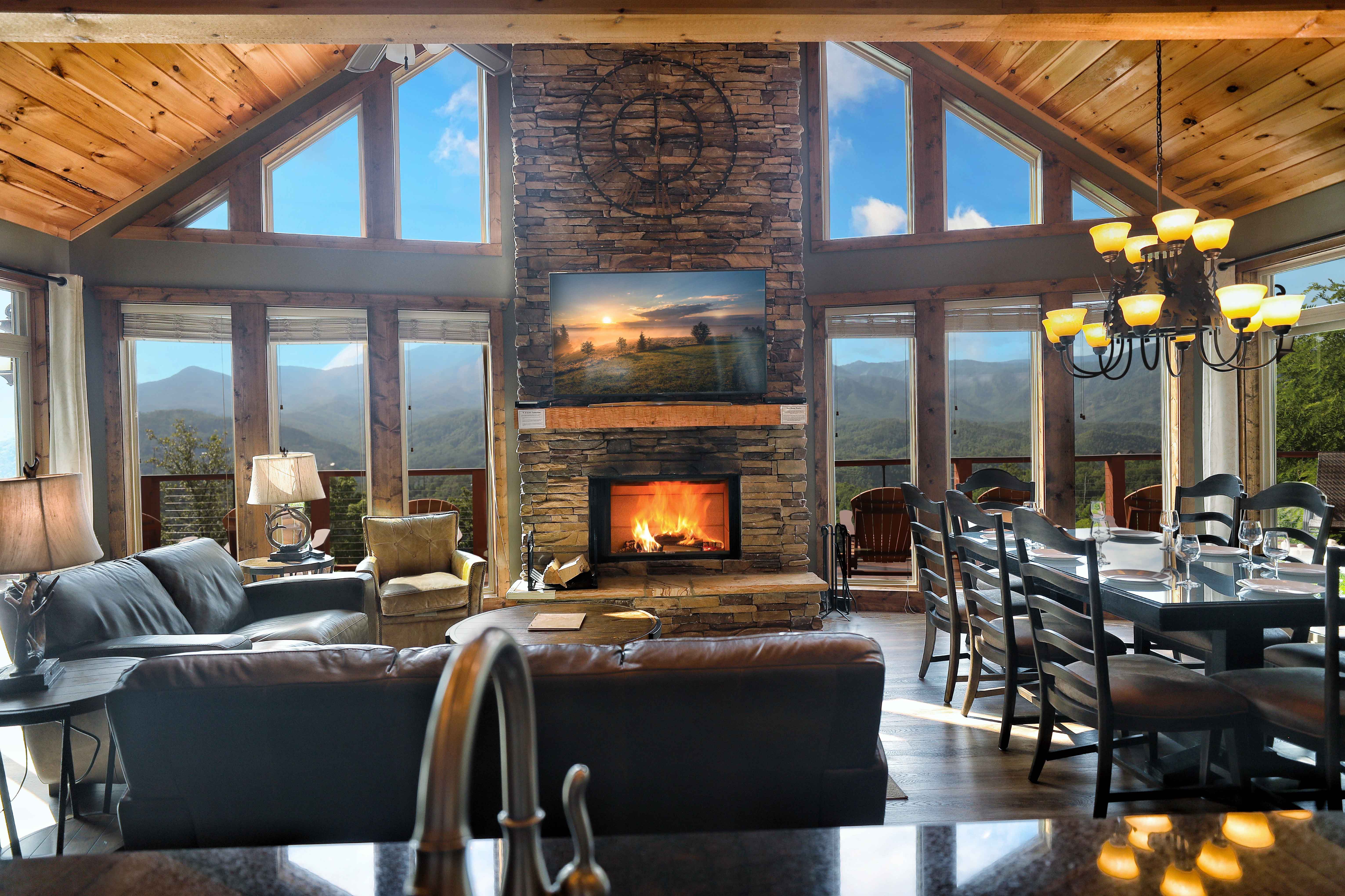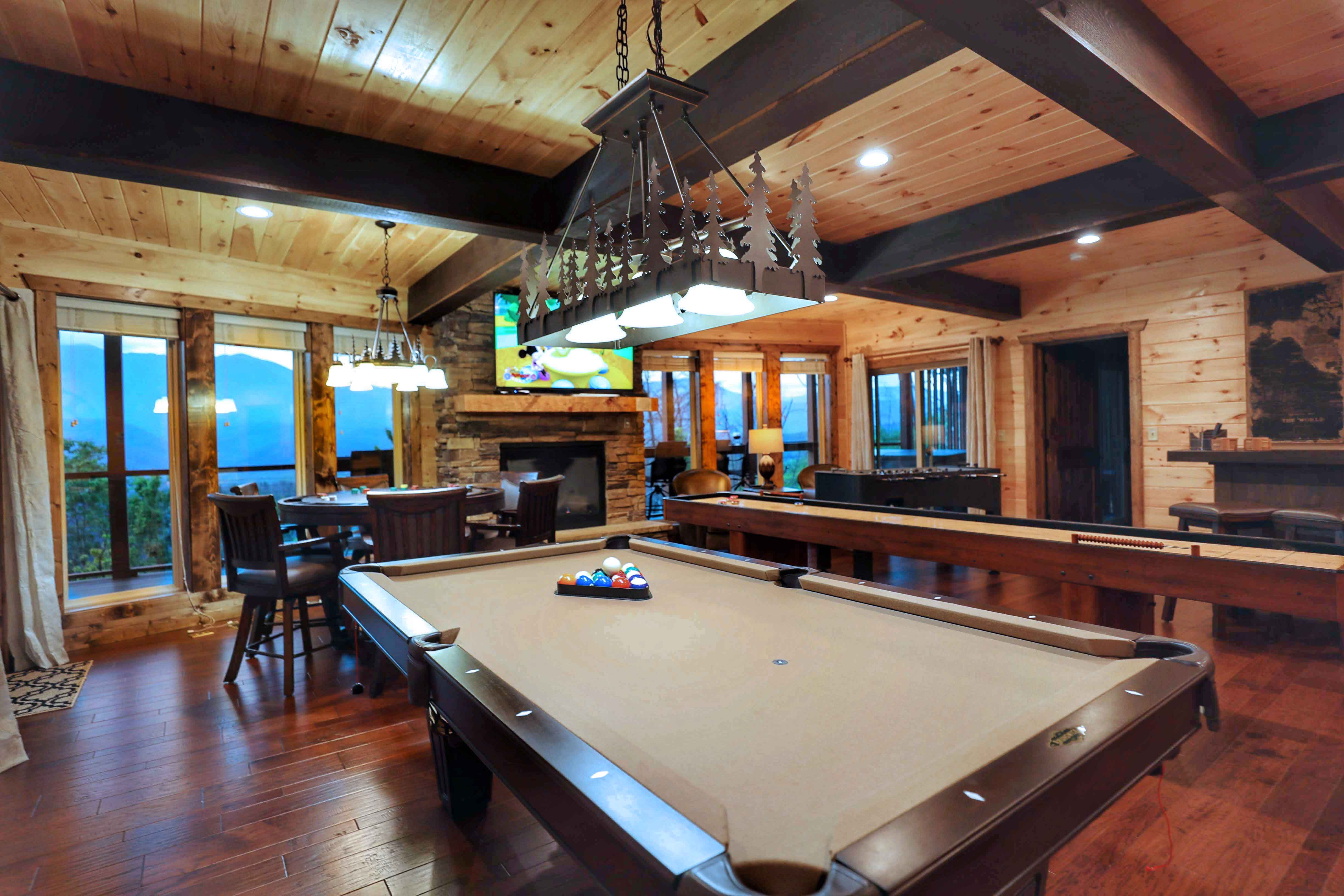 "Window to Heaven" is a luxurious 4-bedroom, 4-bathroom cabin designed to showcase breathtaking, unobstructed views of Mt. LeConte and the Smoky Mountains. This mountain home features expansive decks perfect for dining al fresco, relaxing in the hot tub, or cozying up by the fire pit while enjoying the crisp mountain air. Inside, the cabin exudes rustic elegance with a dramatic floor-to-ceiling fireplace that anchors the spacious great room, complemented by large windows that flood the space with natural light and stunning mountain vistas. Each of the four master suites is a private sanctuary, complete with king-sized beds and in-room jacuzzi tubs positioned beside a cozy fireplace, offering an indulgent retreat where you can soak in the beauty of the Smoky Mountains. The fully equipped kitchen, with stainless steel appliances and granite countertops, is a culinary dream, while the enormous game room provides endless entertainment with a shuffleboard table, pool table, foosball, and more. With every detail thoughtfully designed for comfort and enjoyment, "Window to Heaven" is the epitome of mountain luxury.