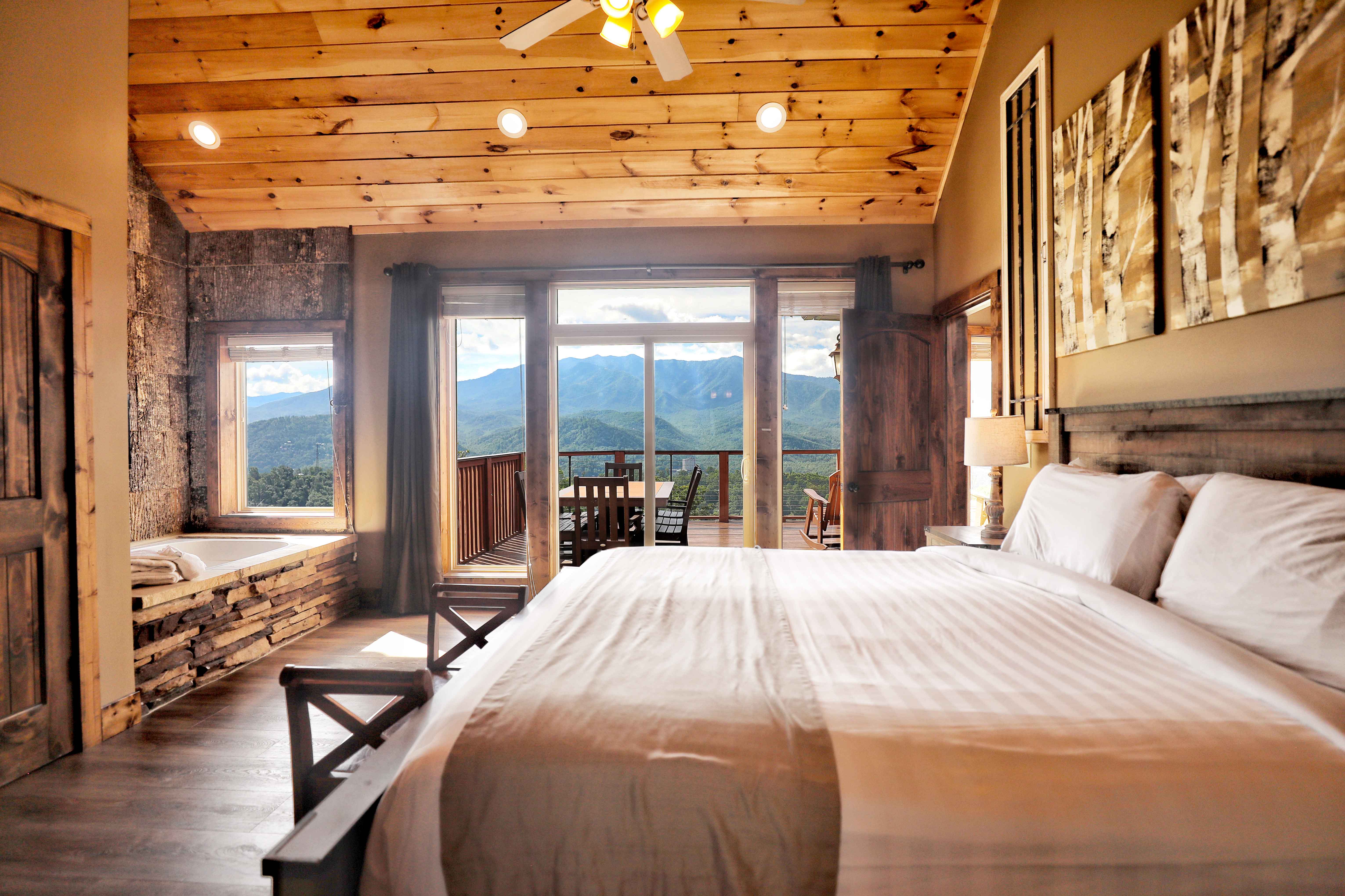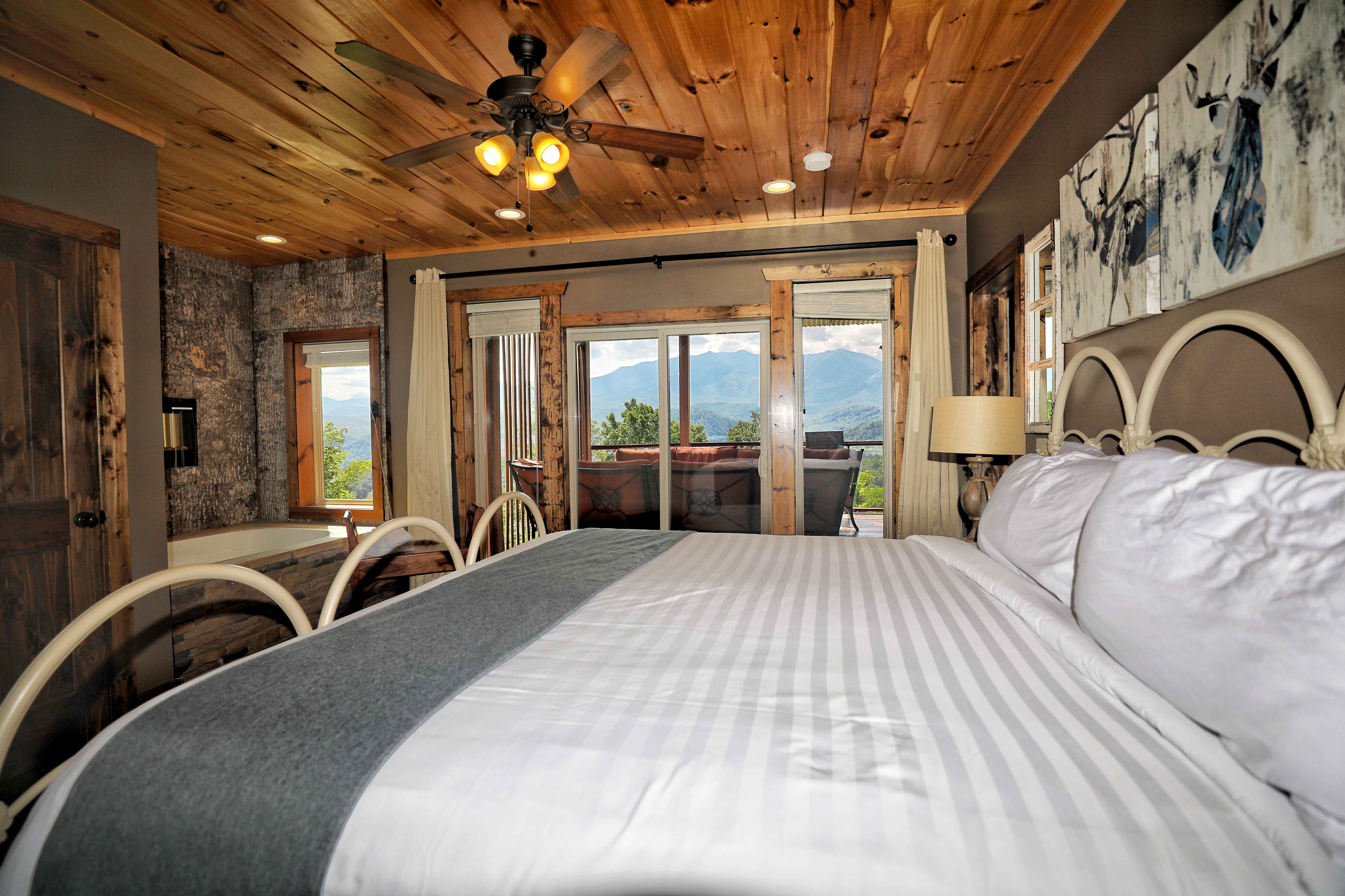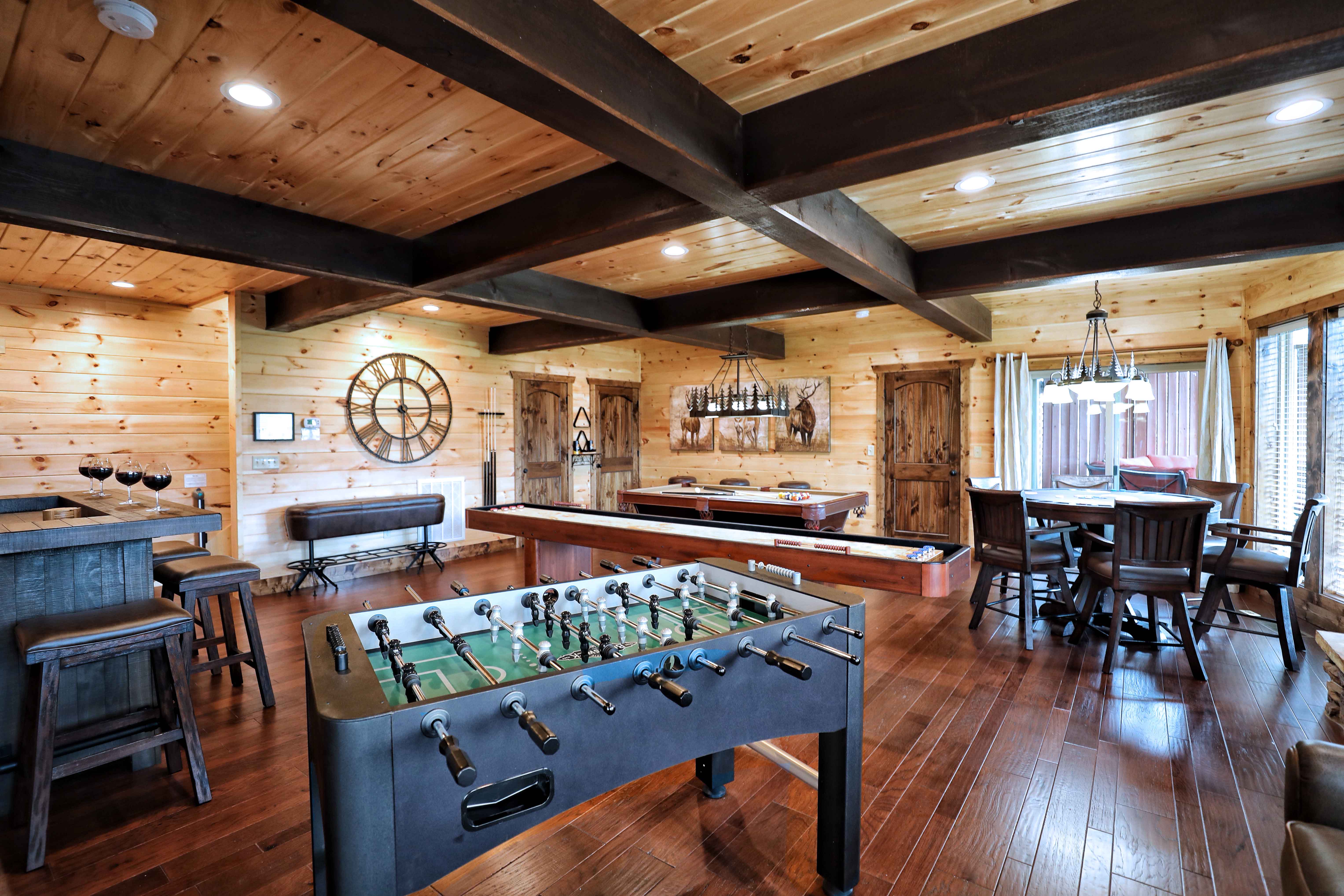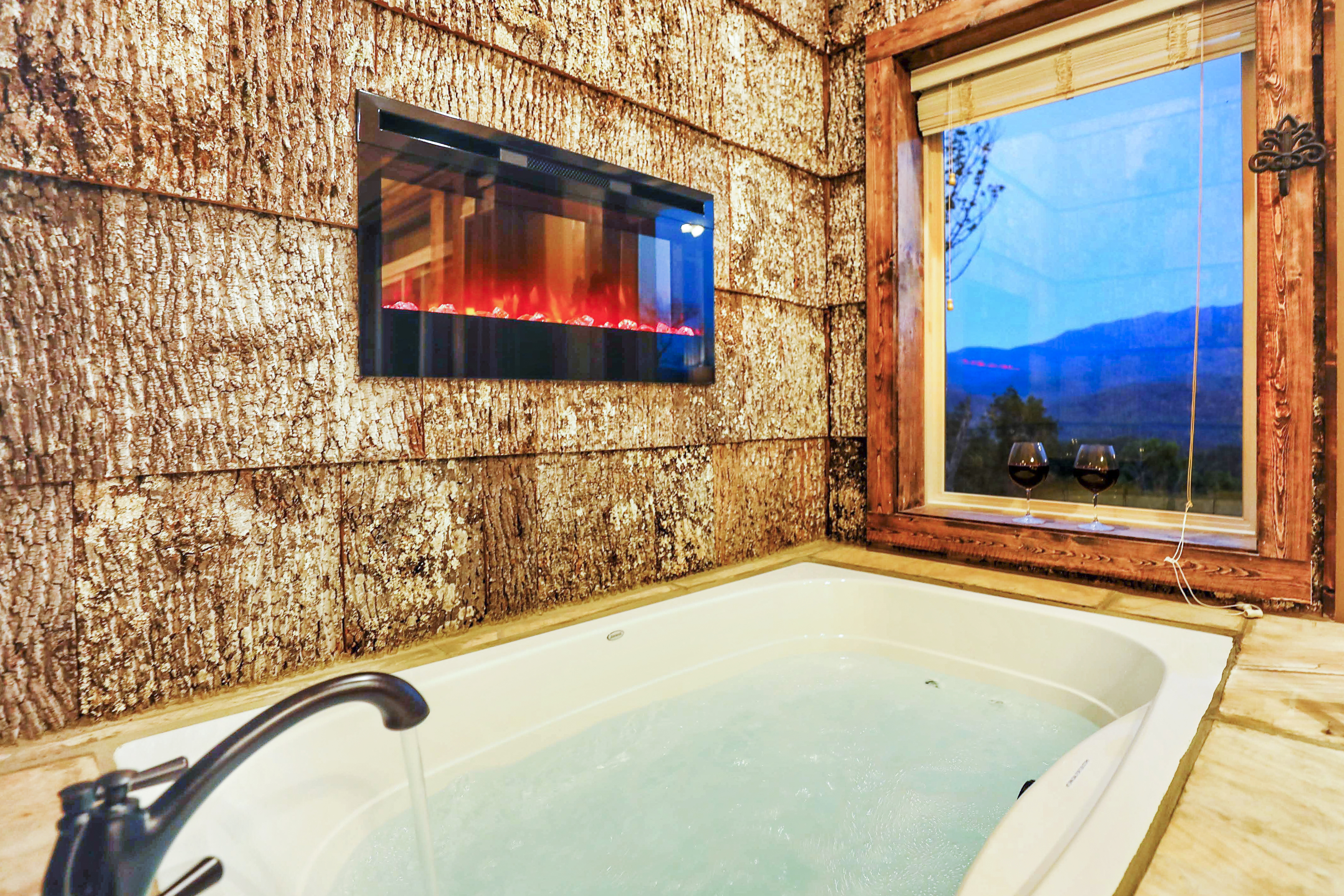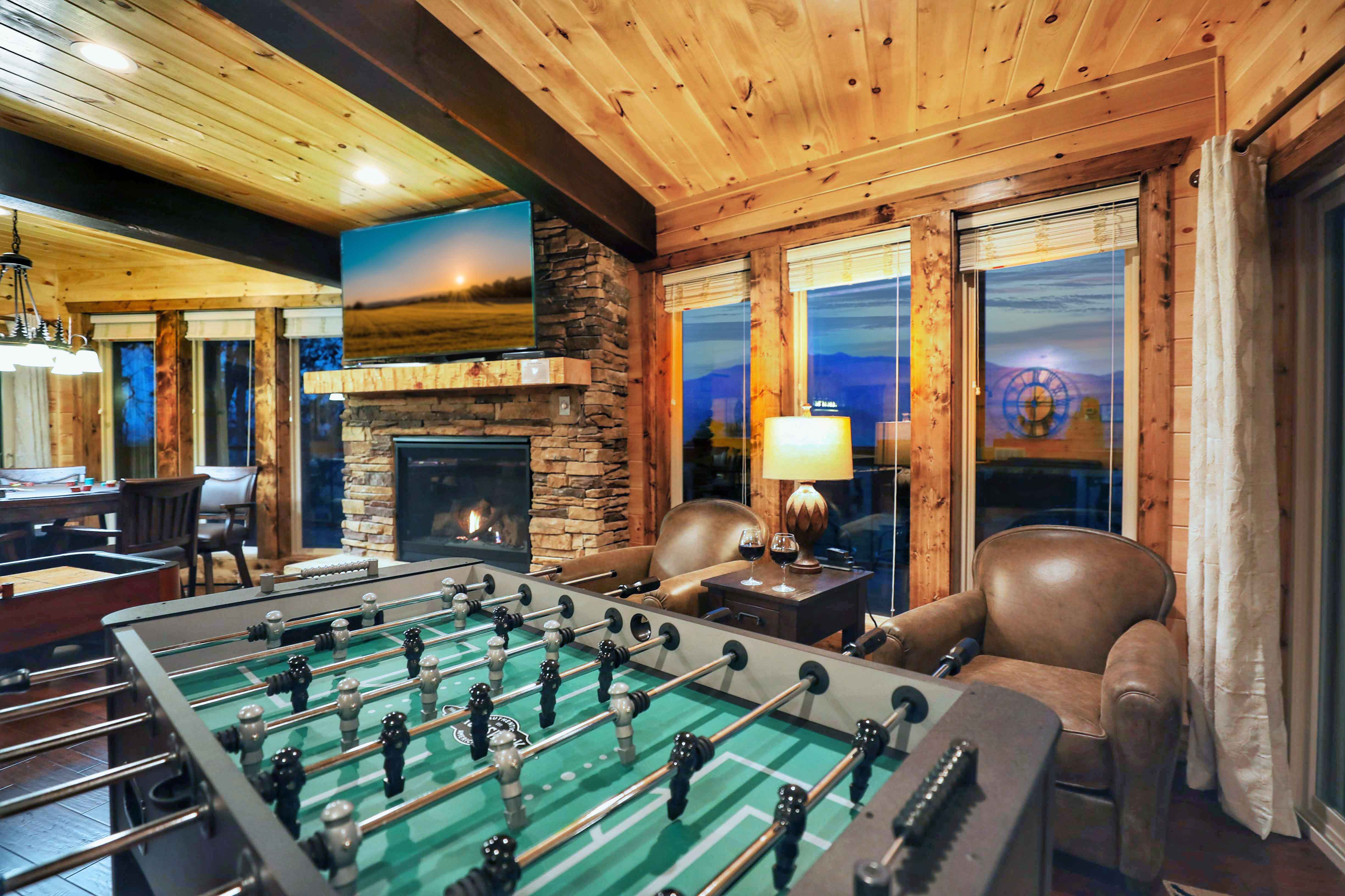 "Window to Heaven" is a luxurious 4-bedroom, 4-bathroom cabin designed to showcase breathtaking, unobstructed views of Mt. LeConte and the Smoky Mountains. This mountain home features expansive decks perfect for dining al fresco, relaxing in the hot tub, or cozying up by the fire pit while enjoying the crisp mountain air. Inside, the cabin exudes rustic elegance with a dramatic floor-to-ceiling fireplace that anchors the spacious great room, complemented by large windows that flood the space with natural light and stunning mountain vistas. Each of the four master suites is a private sanctuary, complete with king-sized beds and in-room jacuzzi tubs positioned beside a cozy fireplace, offering an indulgent retreat where you can soak in the beauty of the Smoky Mountains. The fully equipped kitchen, with stainless steel appliances and granite countertops, is a culinary dream, while the enormous game room provides endless entertainment with a shuffleboard table, pool table, foosball, and more. With every detail thoughtfully designed for comfort and enjoyment, "Window to Heaven" is the epitome of mountain luxury.