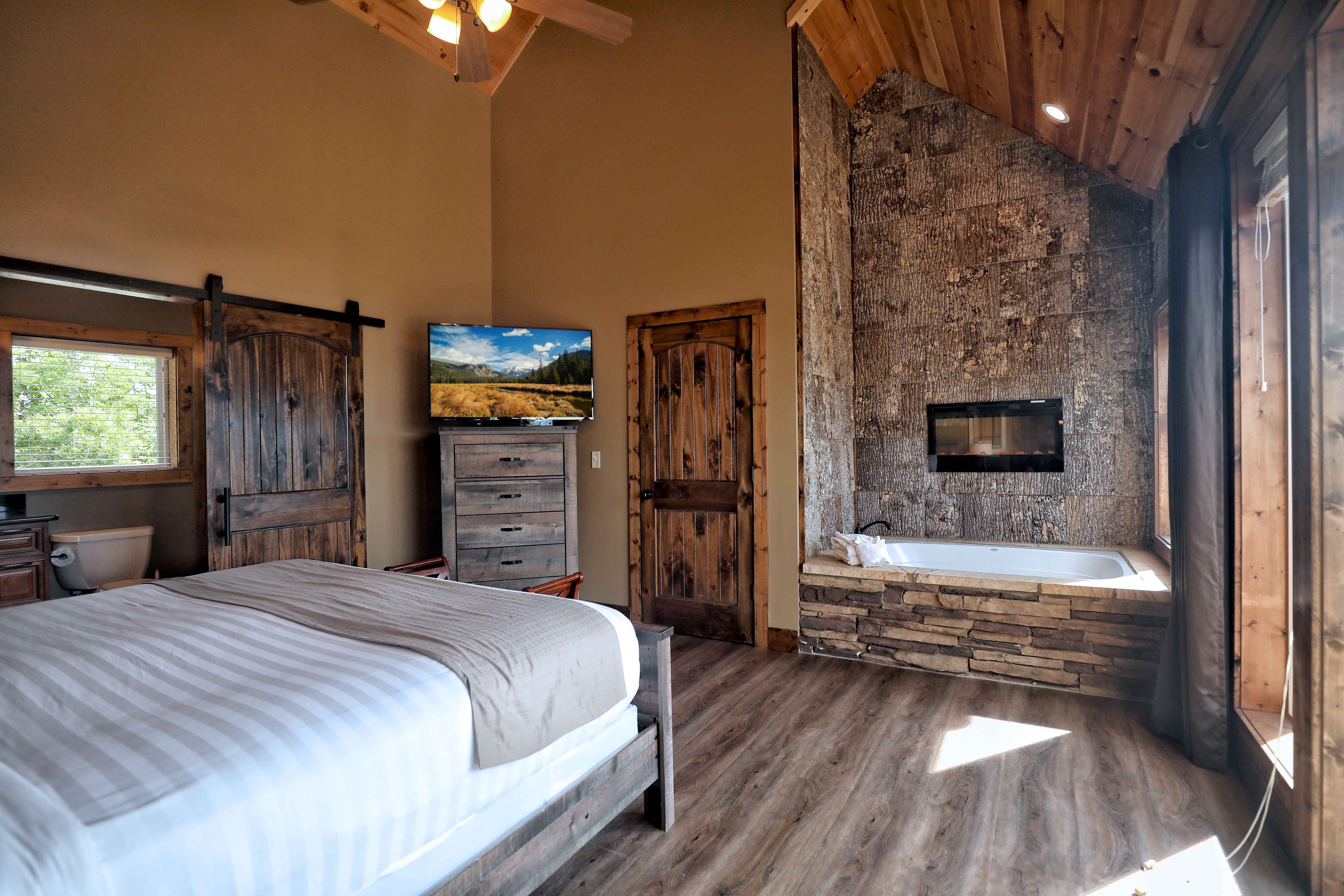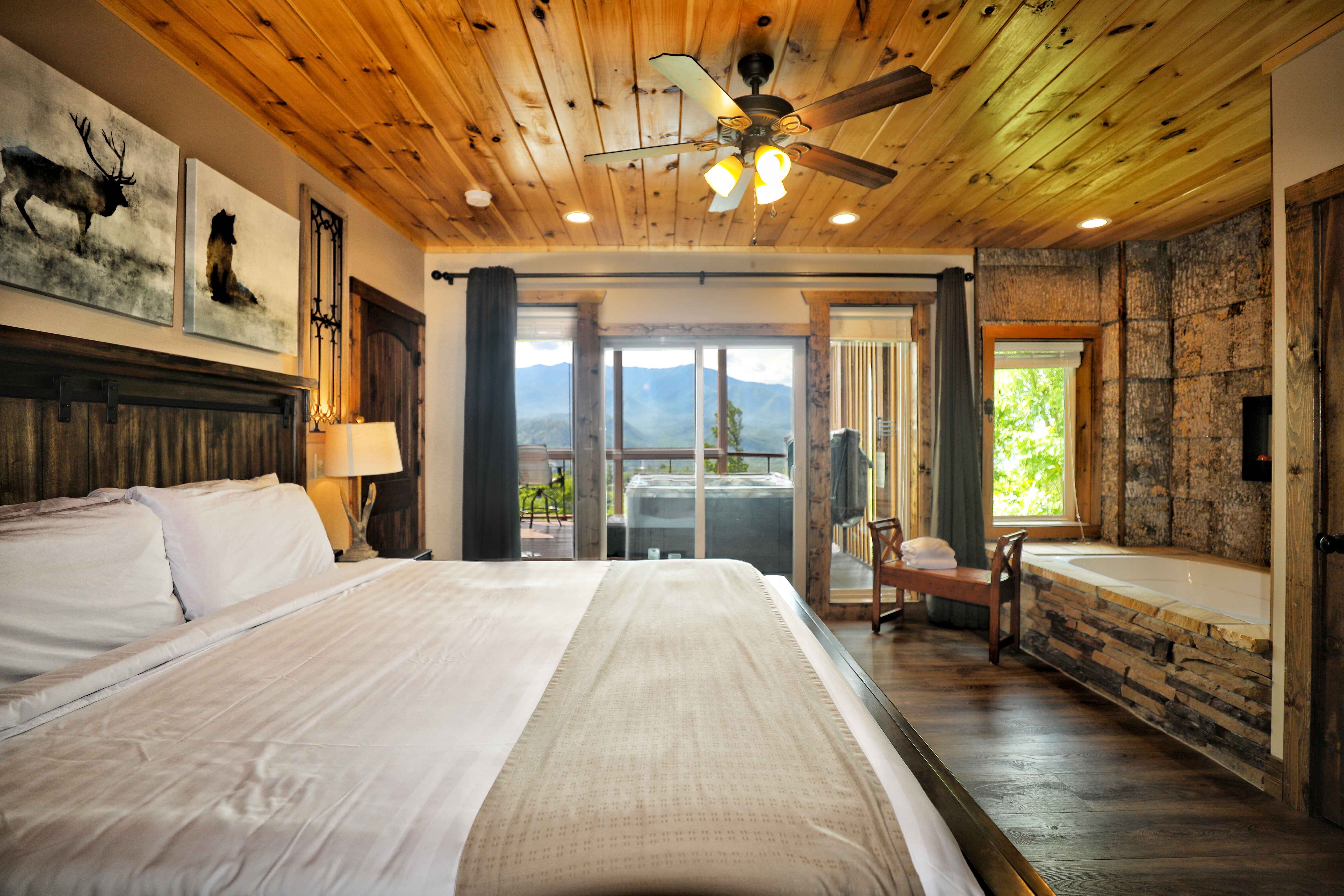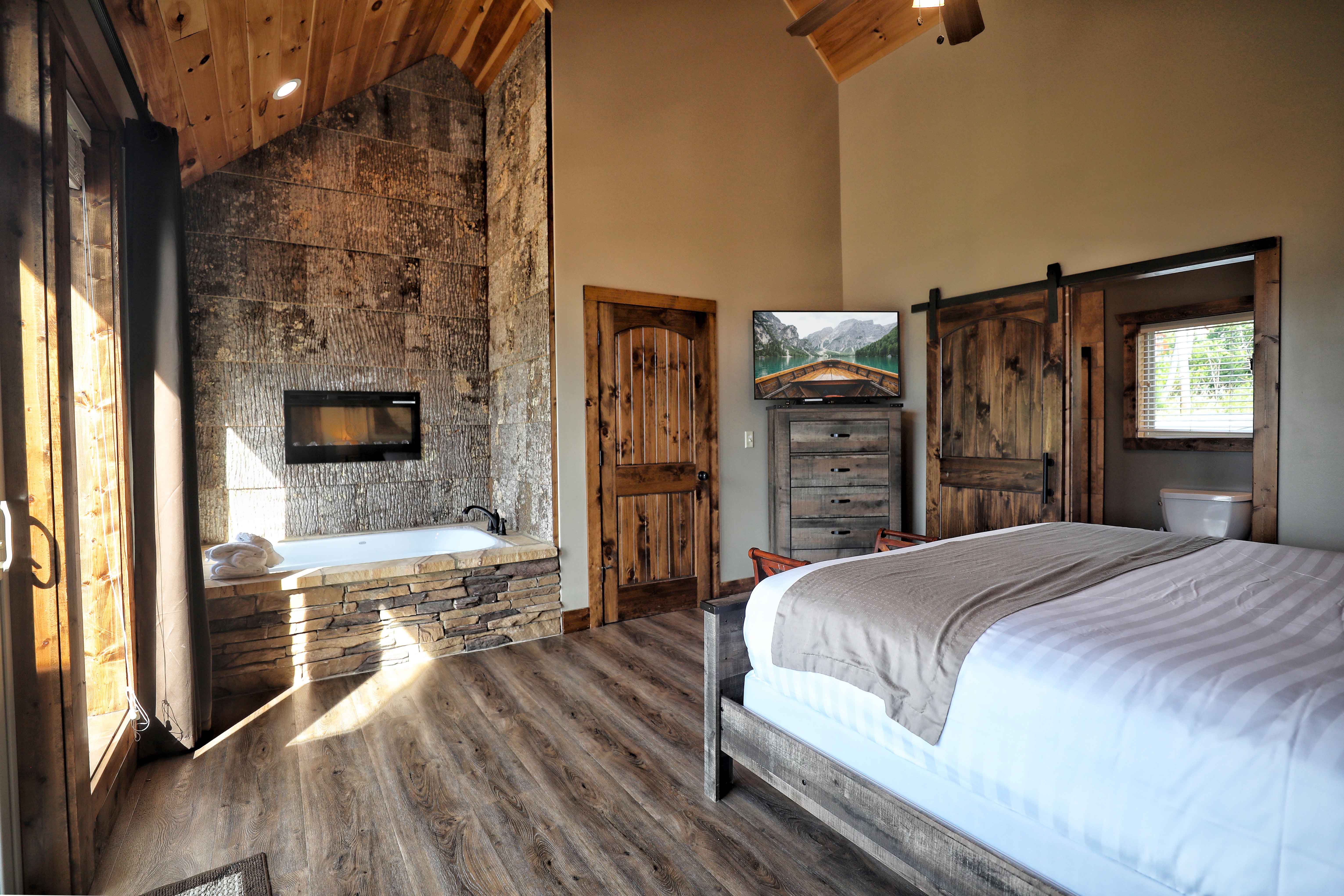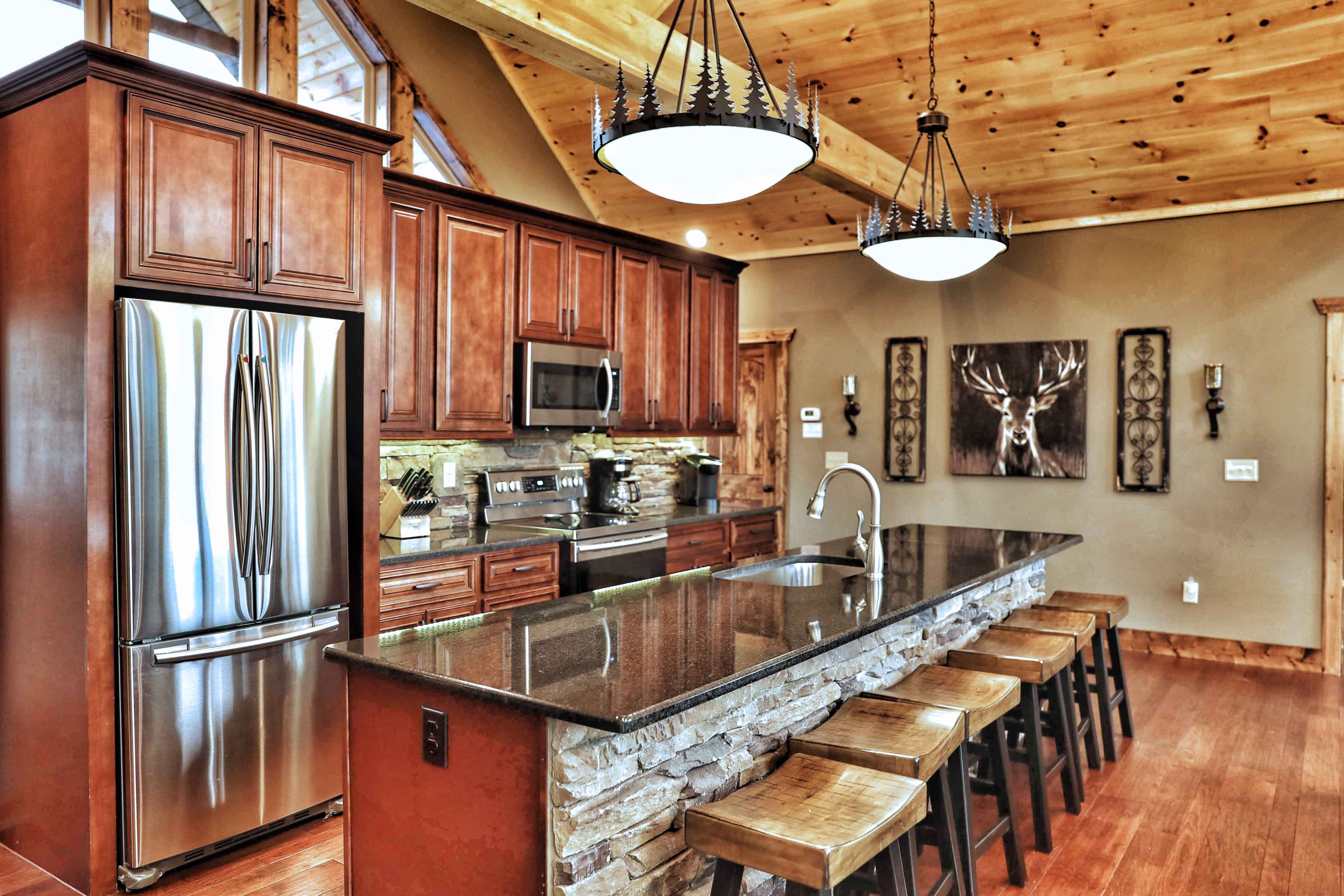 "Window to Heaven" is a luxurious 4-bedroom, 4-bathroom cabin designed to showcase breathtaking, unobstructed views of Mt. LeConte and the Smoky Mountains. This mountain home features expansive decks perfect for dining al fresco, relaxing in the hot tub, or cozying up by the fire pit while enjoying the crisp mountain air. Inside, the cabin exudes rustic elegance with a dramatic floor-to-ceiling fireplace that anchors the spacious great room, complemented by large windows that flood the space with natural light and stunning mountain vistas. Each of the four master suites is a private sanctuary, complete with king-sized beds and in-room jacuzzi tubs positioned beside a cozy fireplace, offering an indulgent retreat where you can soak in the beauty of the Smoky Mountains. The fully equipped kitchen, with stainless steel appliances and granite countertops, is a culinary dream, while the enormous game room provides endless entertainment with a shuffleboard table, pool table, foosball, and more. With every detail thoughtfully designed for comfort and enjoyment, "Window to Heaven" is the epitome of mountain luxury.