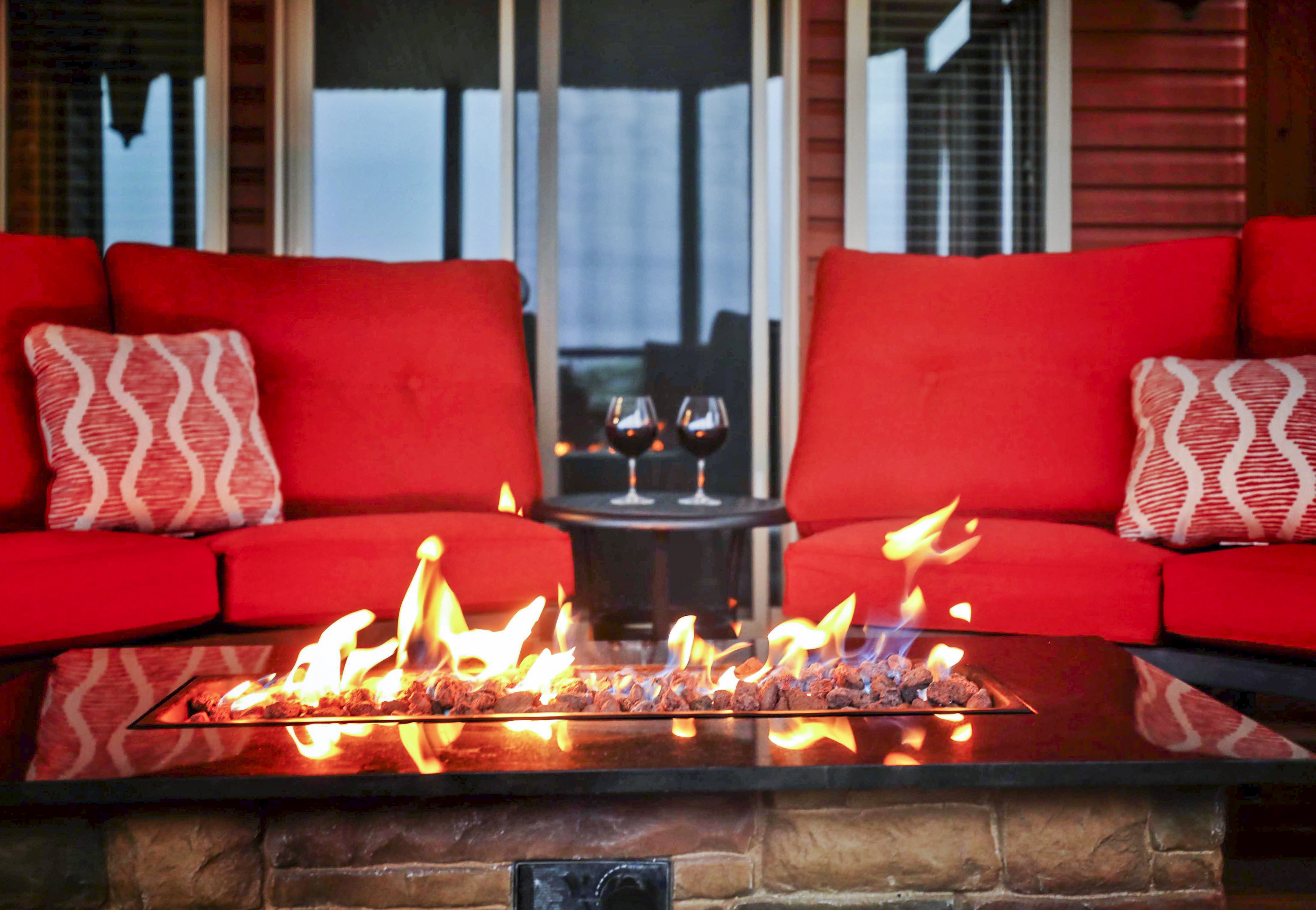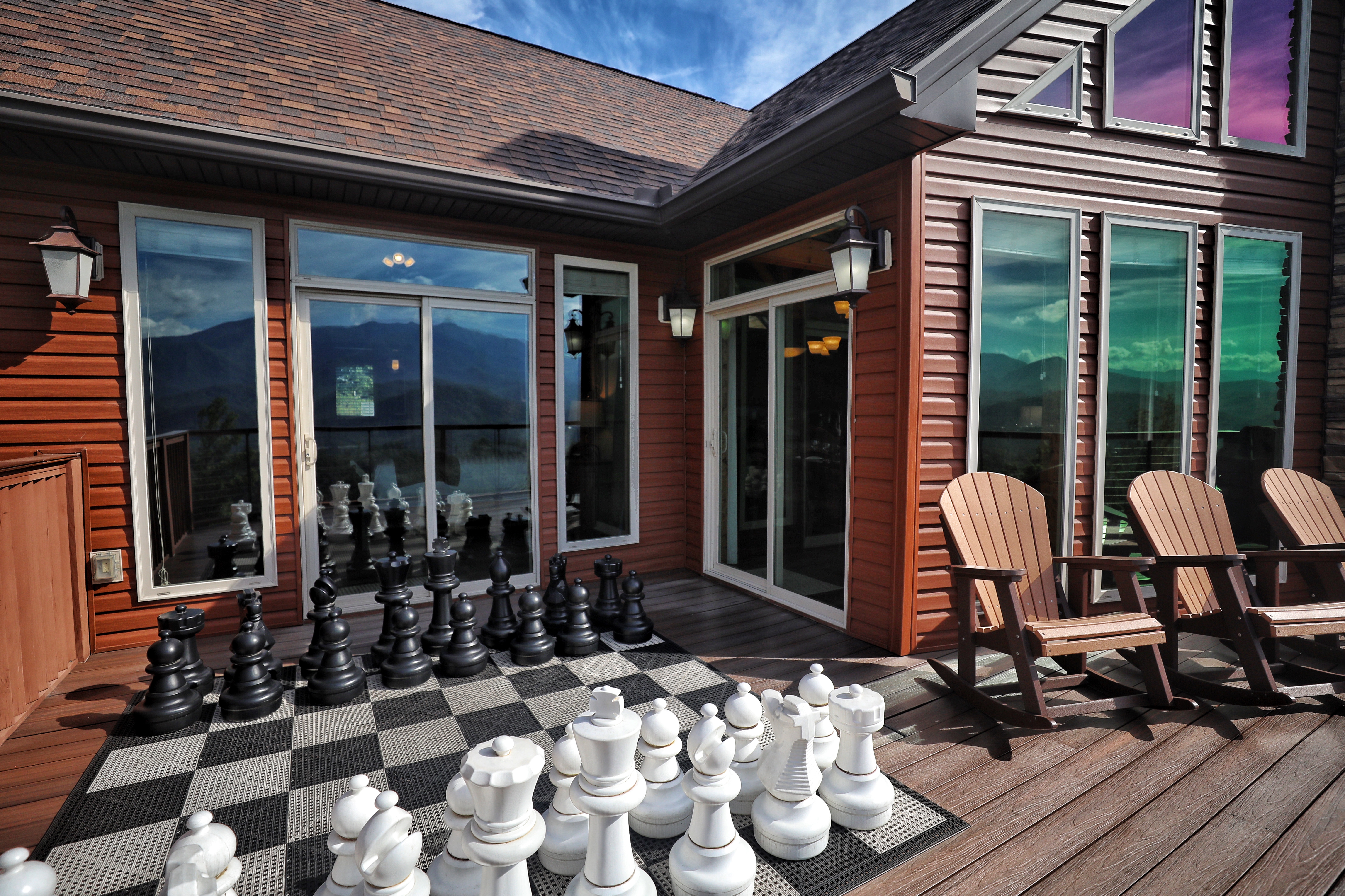 º OUTDOOR SPACES: Expansive decks featuring a hot tub, comfortable seating, alfresco dining table, gas grill, 2 fire pits, outdoor chess, and bar top seating.